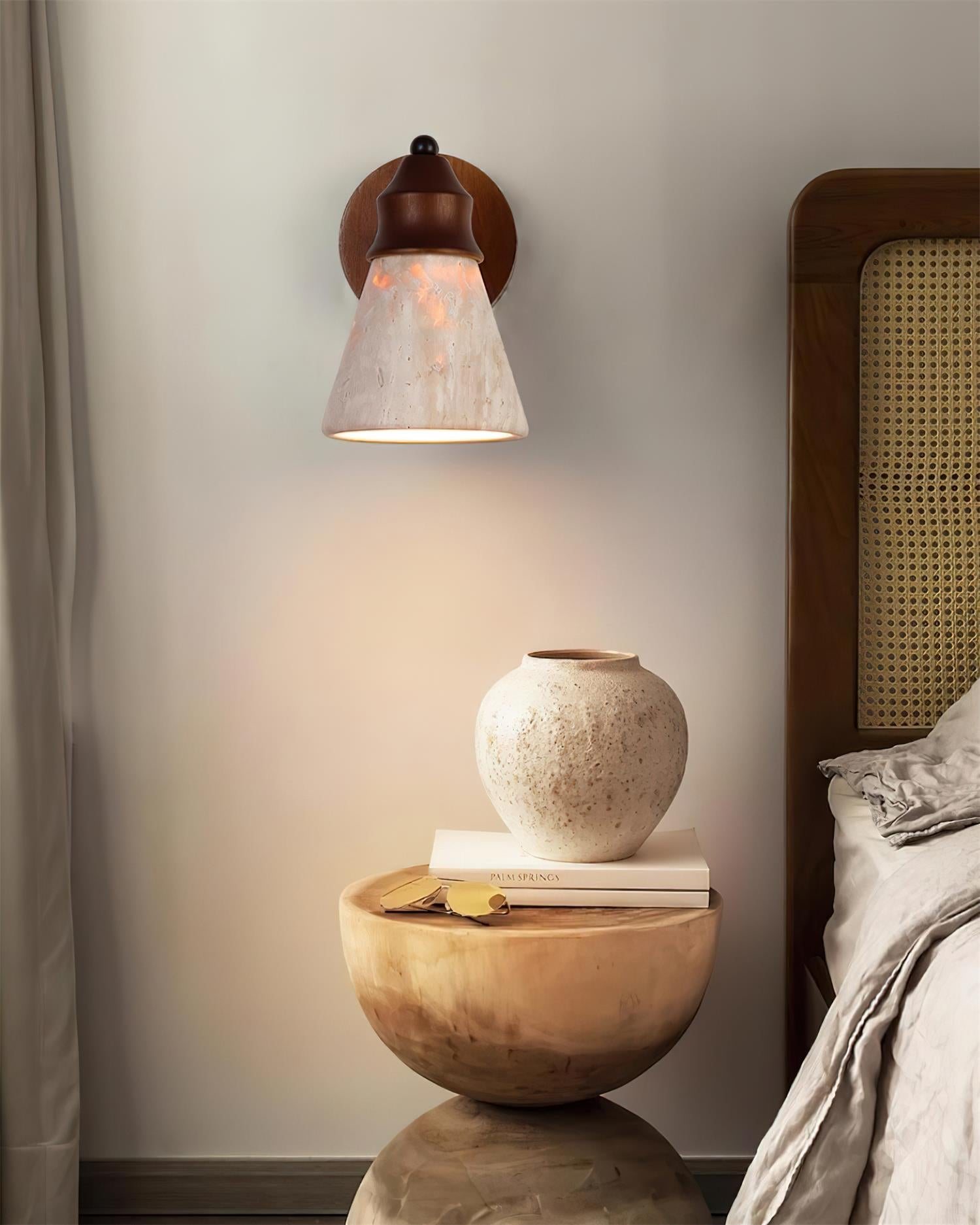 The Travine Wall Lamp brings together the raw elegance of travertine stone with the warmth of finely finished wood, creating a design that feels both grounded and refined. Its conical stone shade diffuses light with a natural softness, while the wooden accents add depth and character. With its timeless material harmony, this wall lamp transforms walls into quiet statements of modern craft and organic beauty.