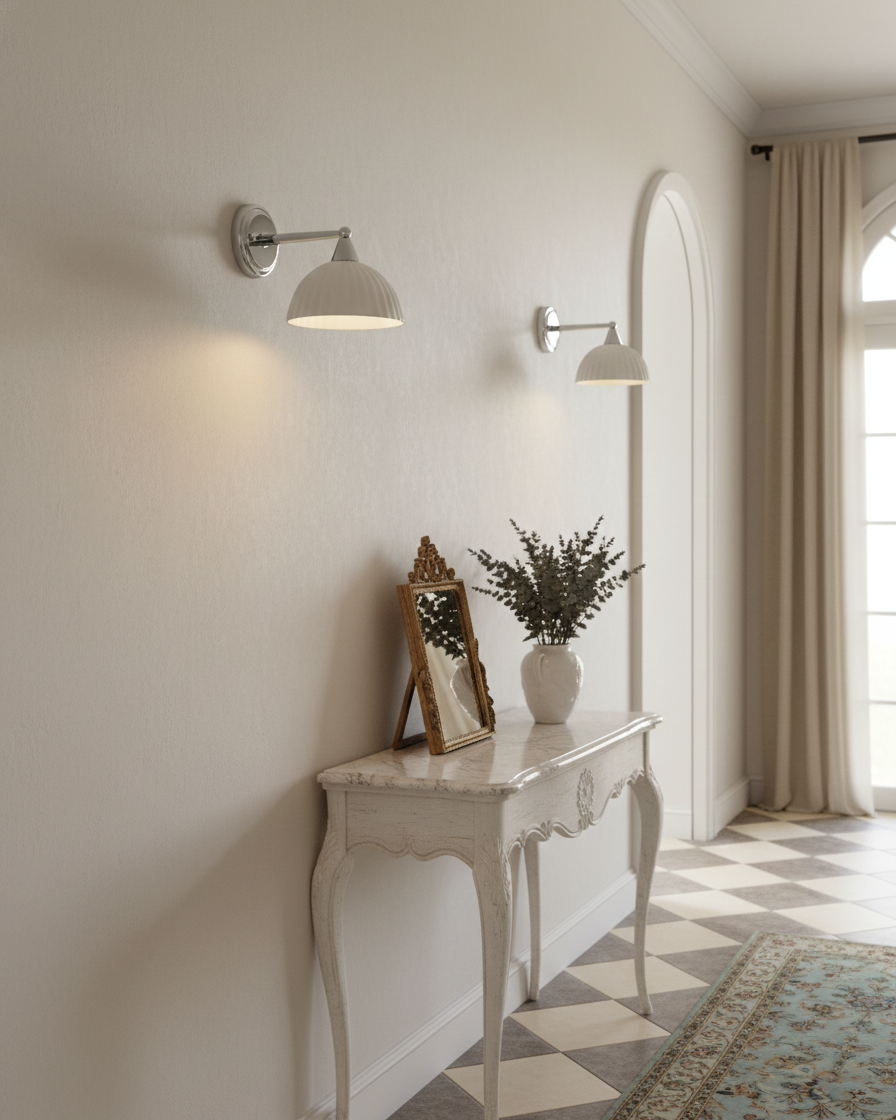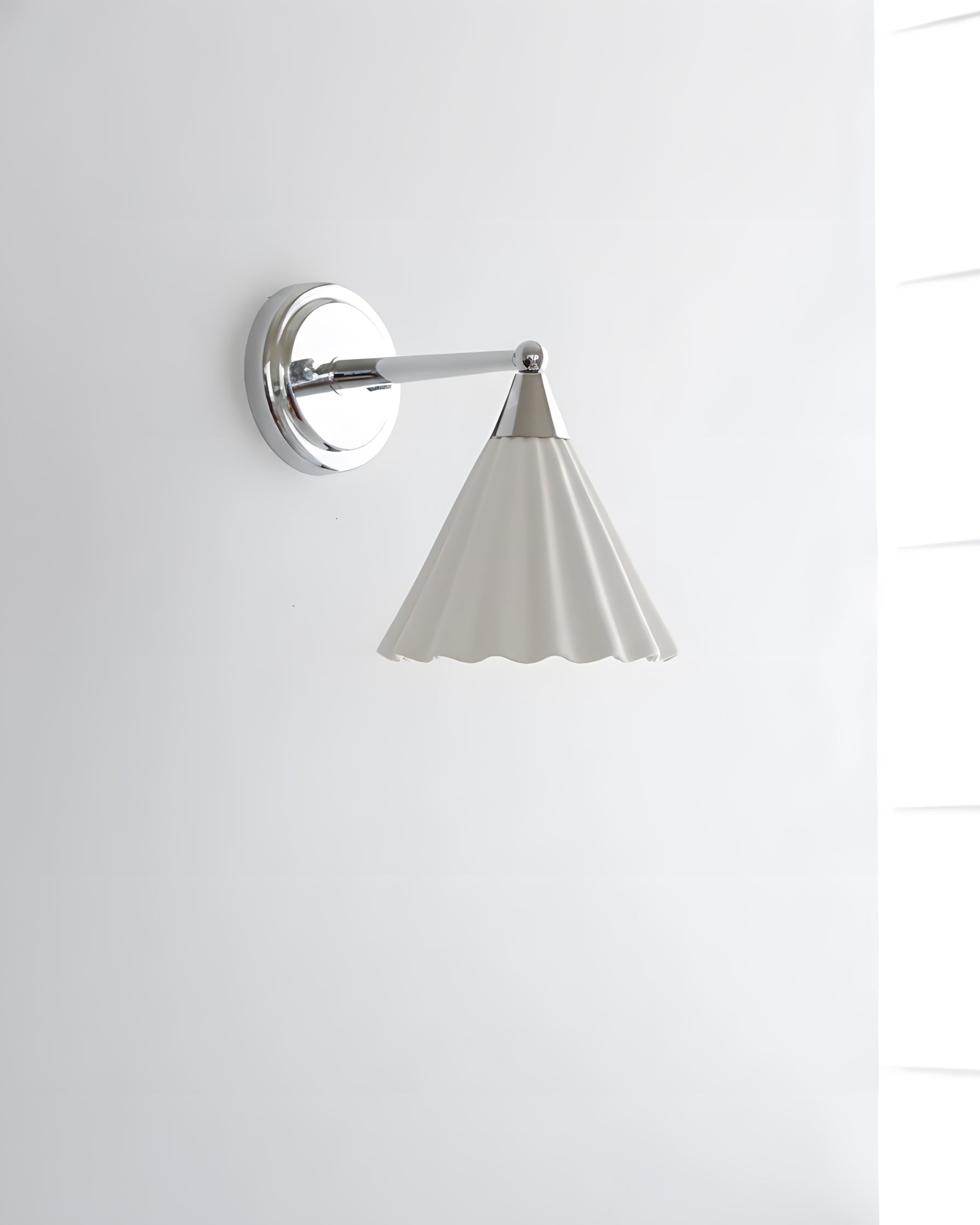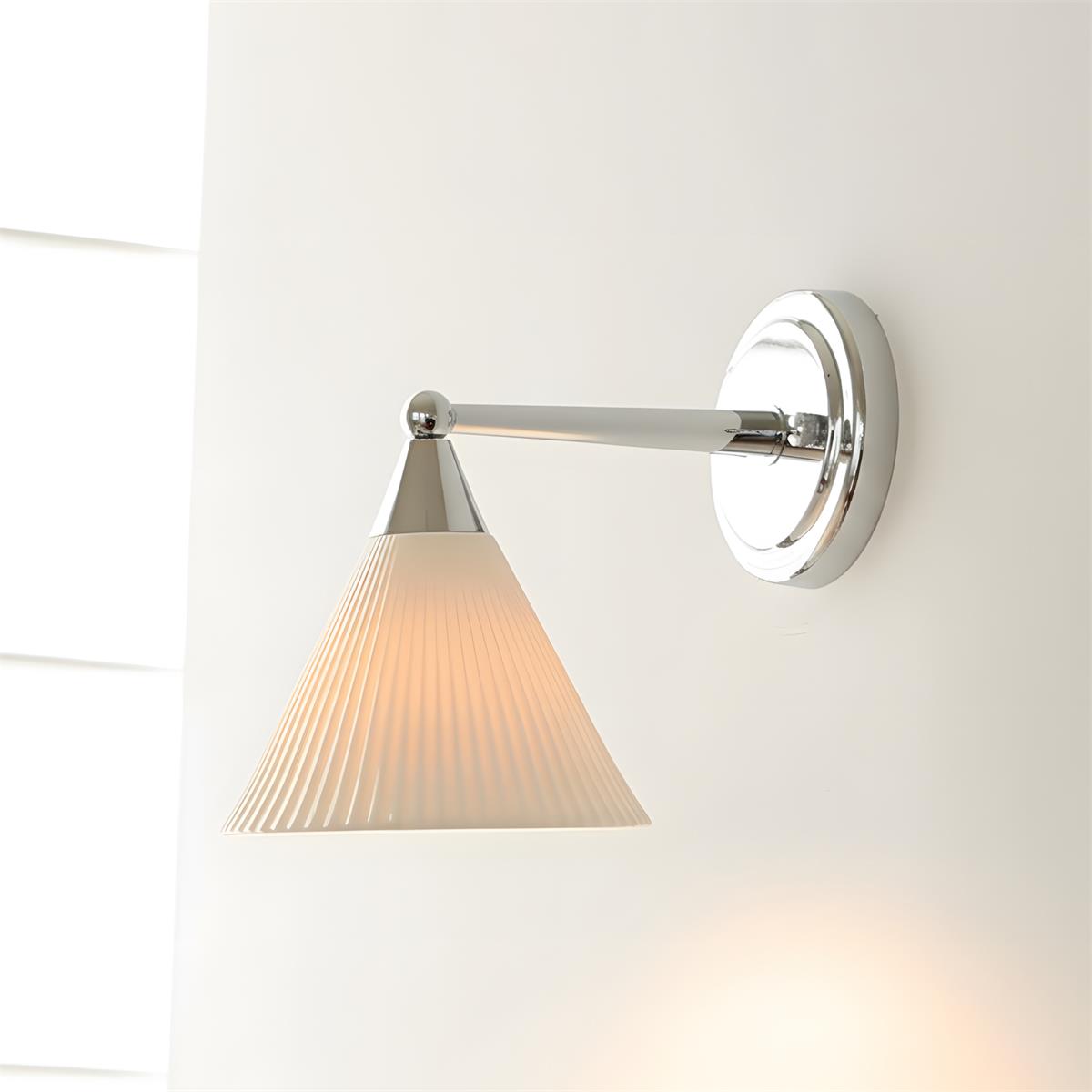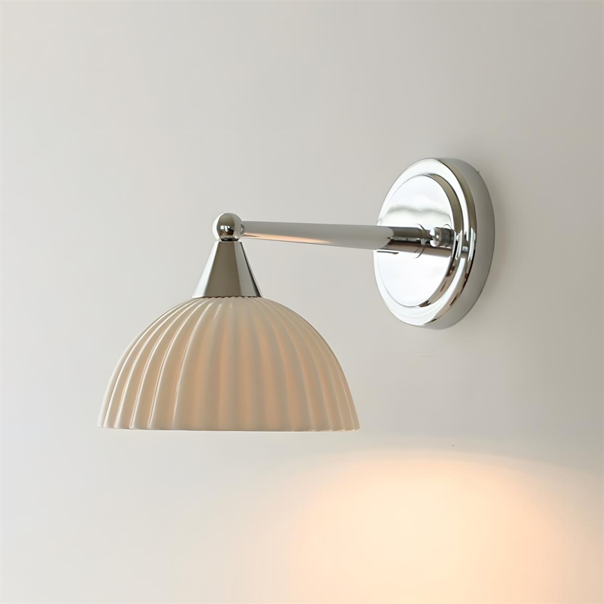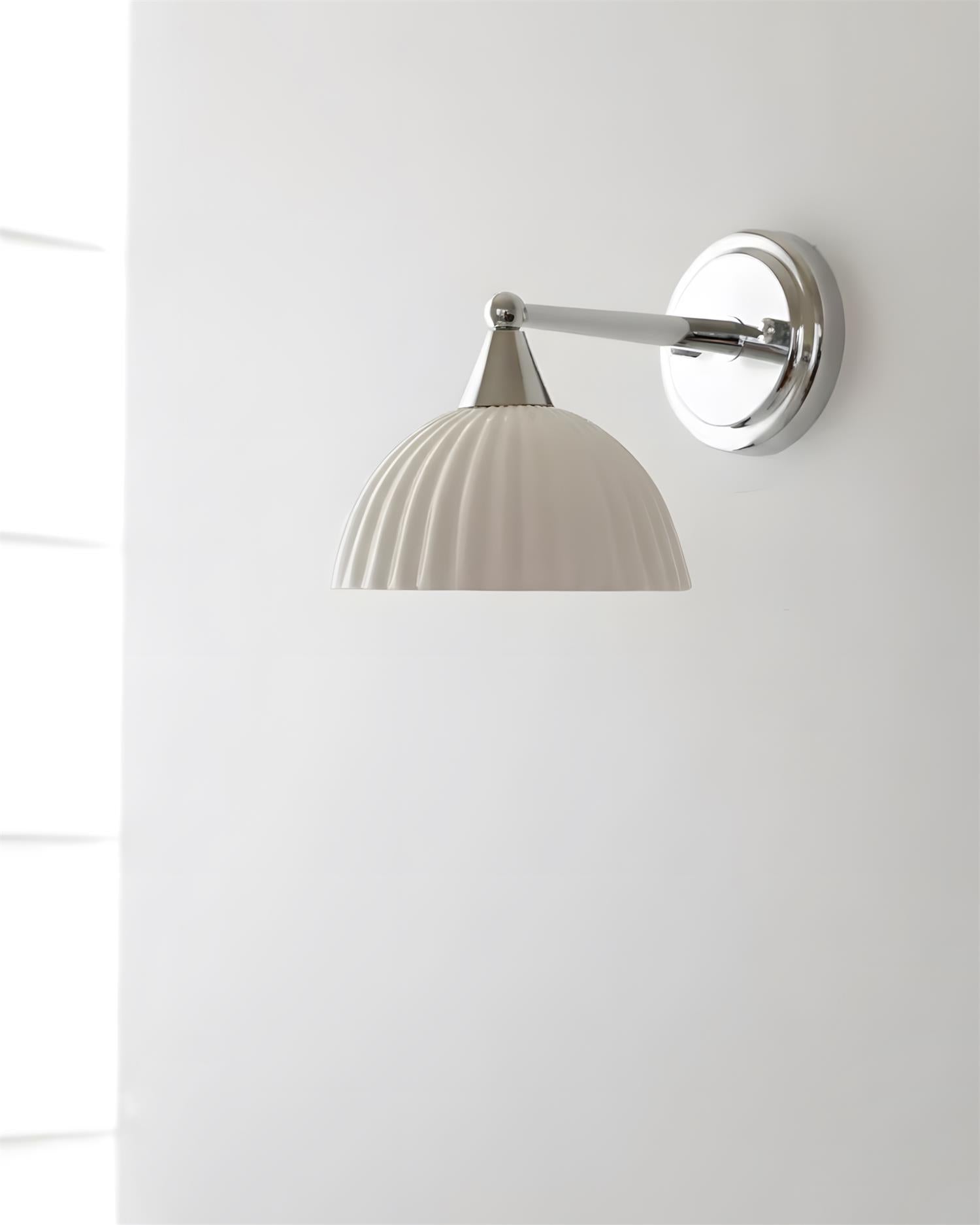 The Luna Scallop Wall Lamp effortlessly combines vintage elegance with modern craftsmanship. The fluted design of its Ceramics shade, paired with the polished chrome accents, gives this fixture a timeless appeal. The scalloped edges of the shade not only enhance its refined aesthetic but also cast a soft, ambient light, making it an ideal addition to any living room, bedroom, or hallway. The contrast between the metallic finish and delicate texture creates a striking visual, while its compact size ensures it complements various interior styles with ease.