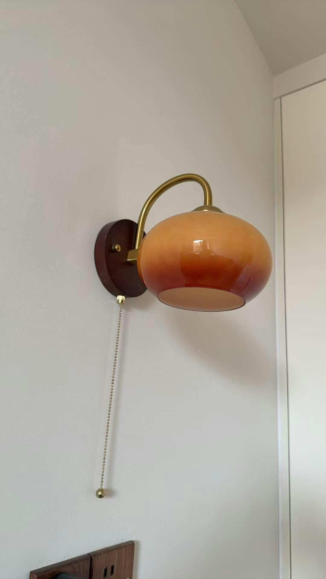 The Mayville Wall Lamp blends vintage elegance with modern functionality. Featuring a gracefully curved brass arm and a glossy glass shade in warm, gradient hues, it casts a soft, inviting glow. The rich wooden base adds warmth and sophistication, making it a perfect addition to bedrooms, living rooms, or hallways. Designed with a convenient pull-chain switch, it offers both style and practicality.