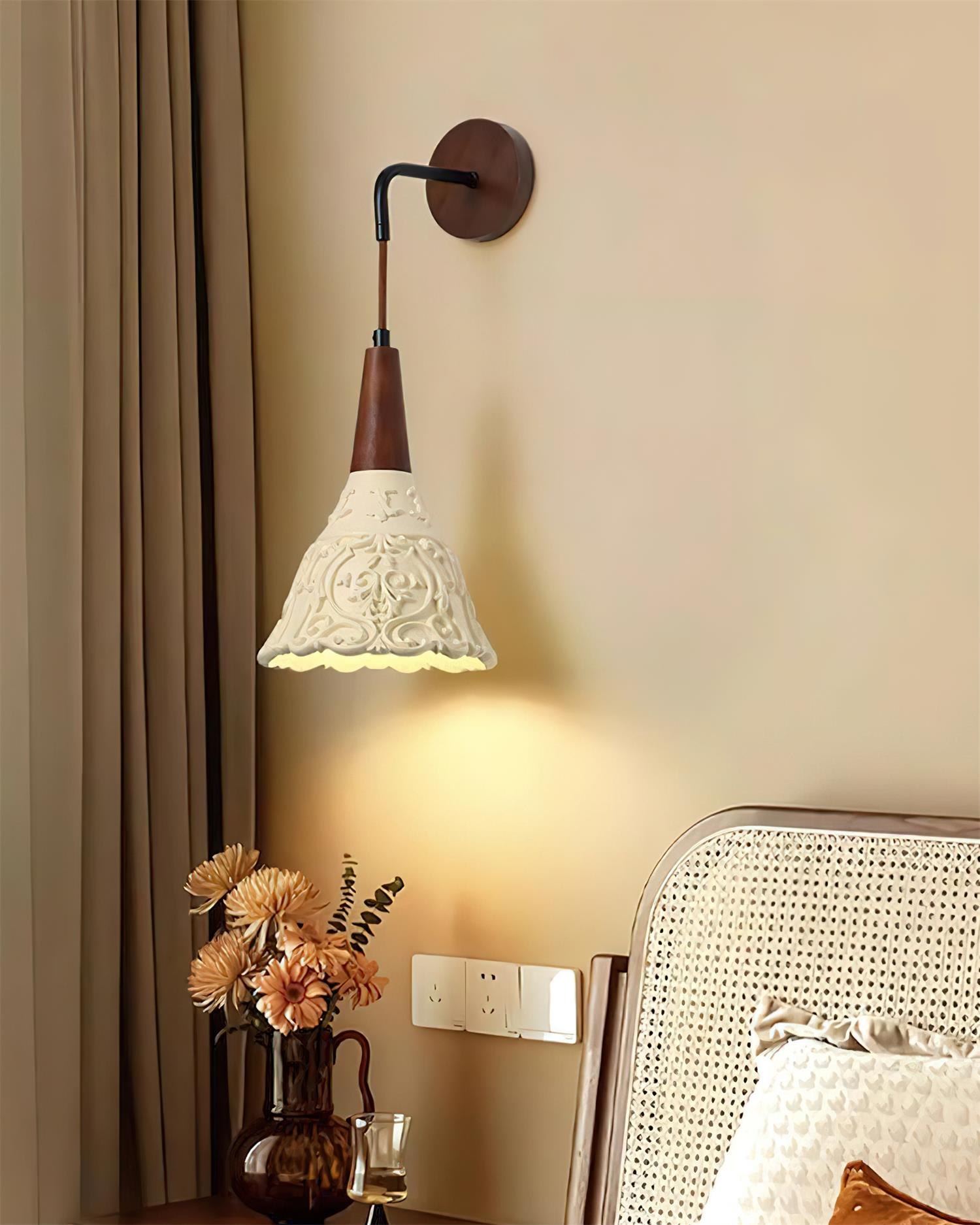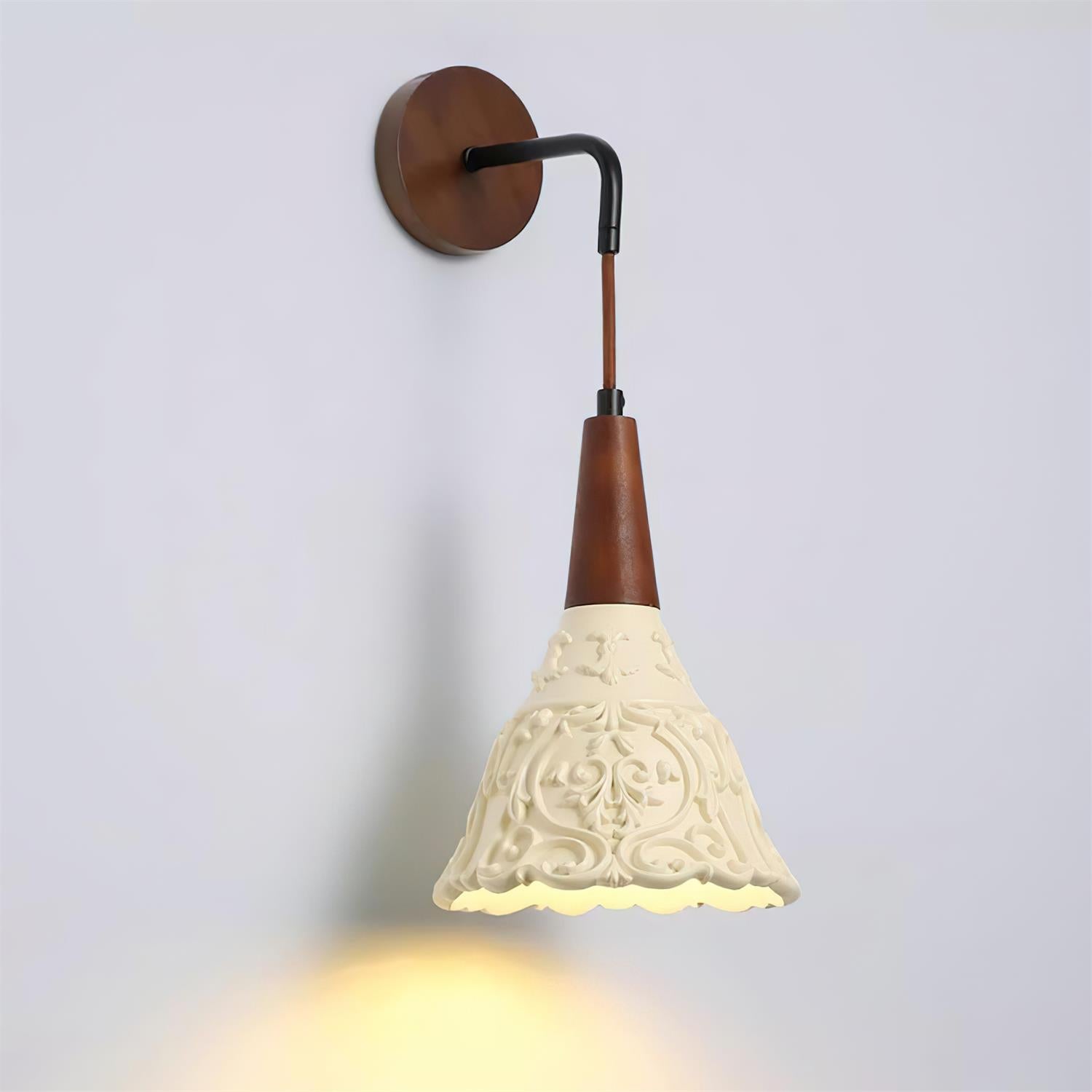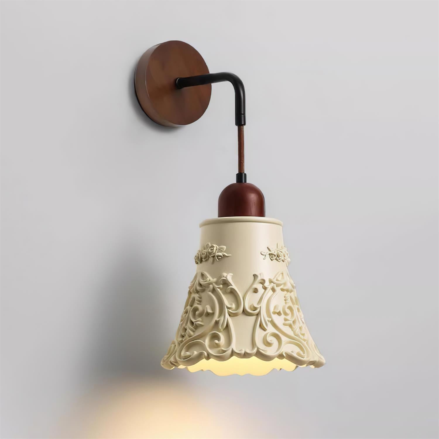 The Ornella Wall Lamp exudes a timeless elegance, seamlessly blending classical design with modern craftsmanship. Its intricately carved shade, made of delicate ivory Resin, features ornate floral patterns that add an air of sophistication to any space. The rich wooden accents in the base and arm provide a warm, inviting contrast, enhancing the lamp's vintage-inspired charm.