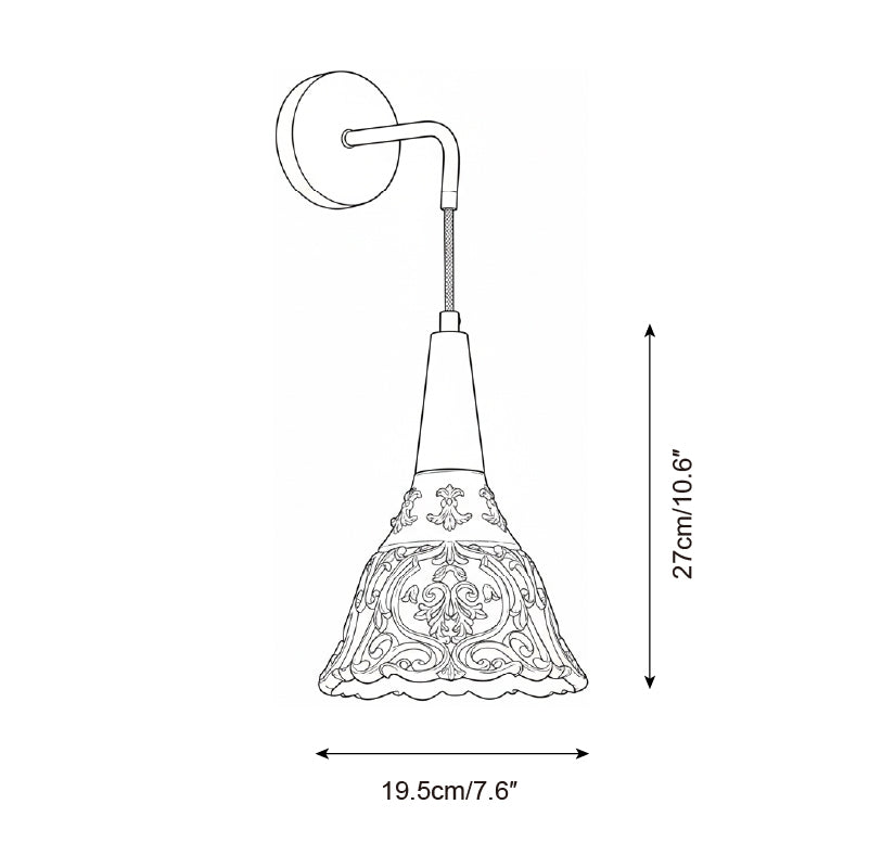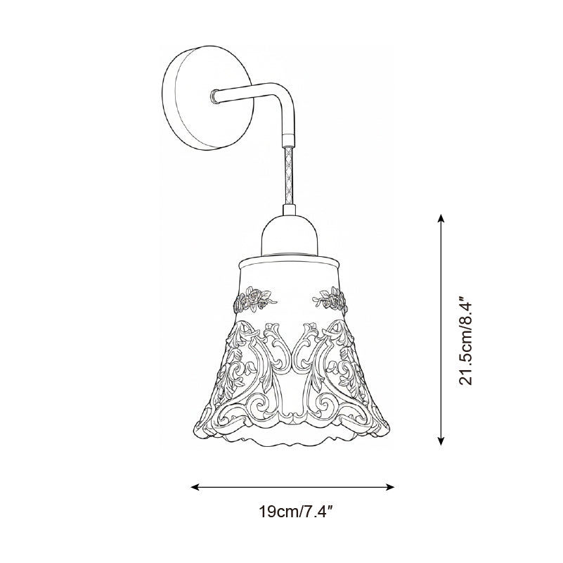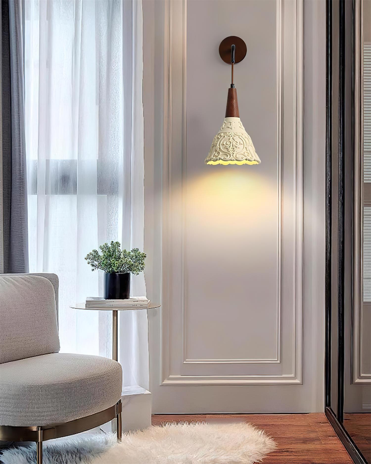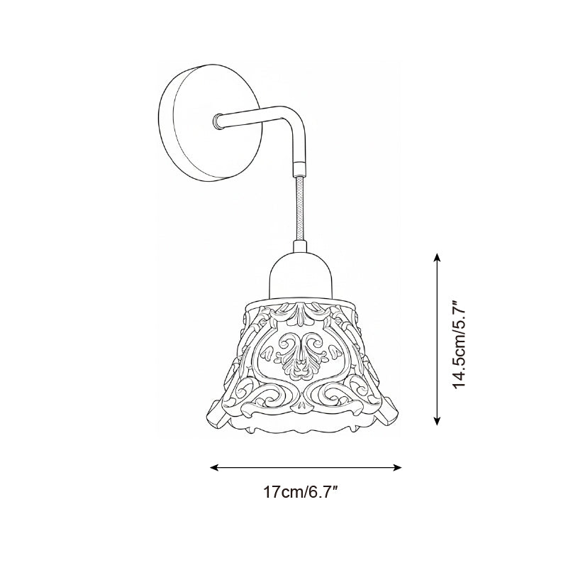 The Ornella Wall Lamp exudes a timeless elegance, seamlessly blending classical design with modern craftsmanship. Its intricately carved shade, made of delicate ivory Resin, features ornate floral patterns that add an air of sophistication to any space. The rich wooden accents in the base and arm provide a warm, inviting contrast, enhancing the lamp's vintage-inspired charm.