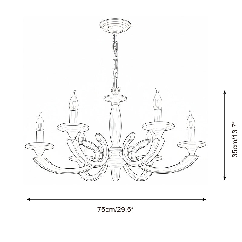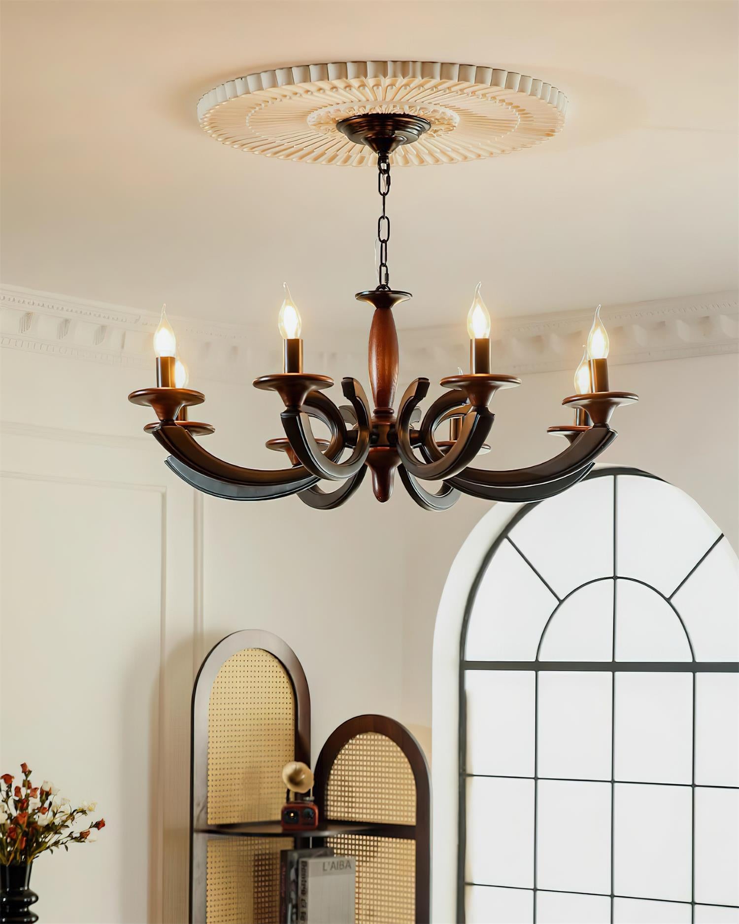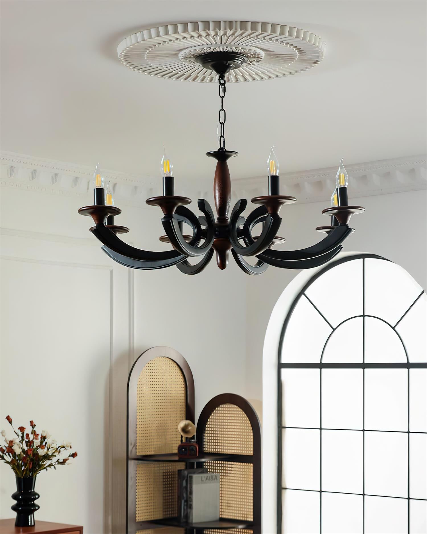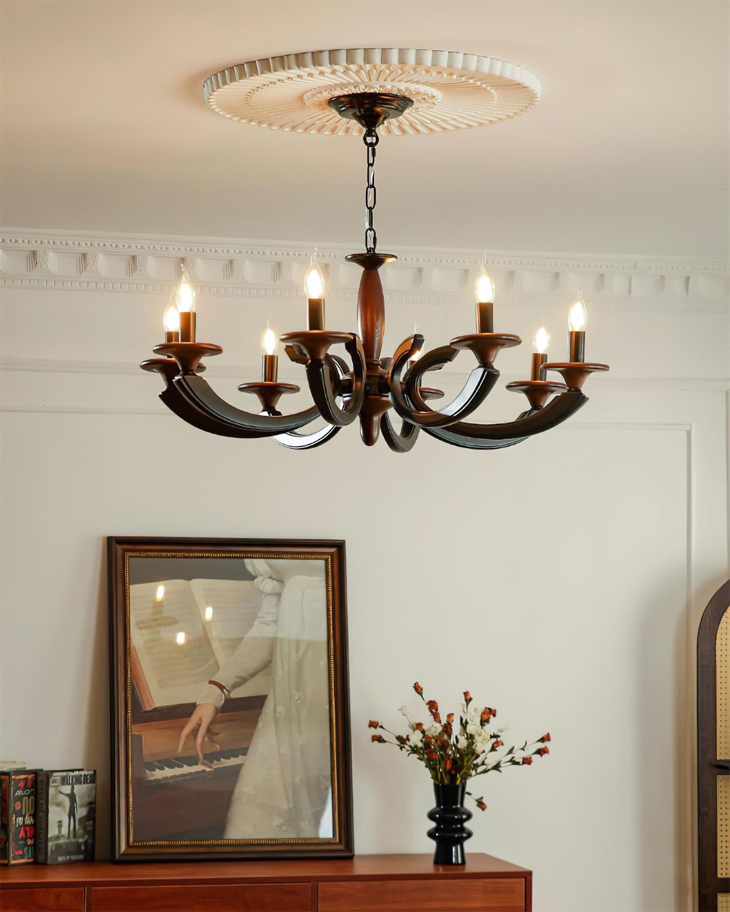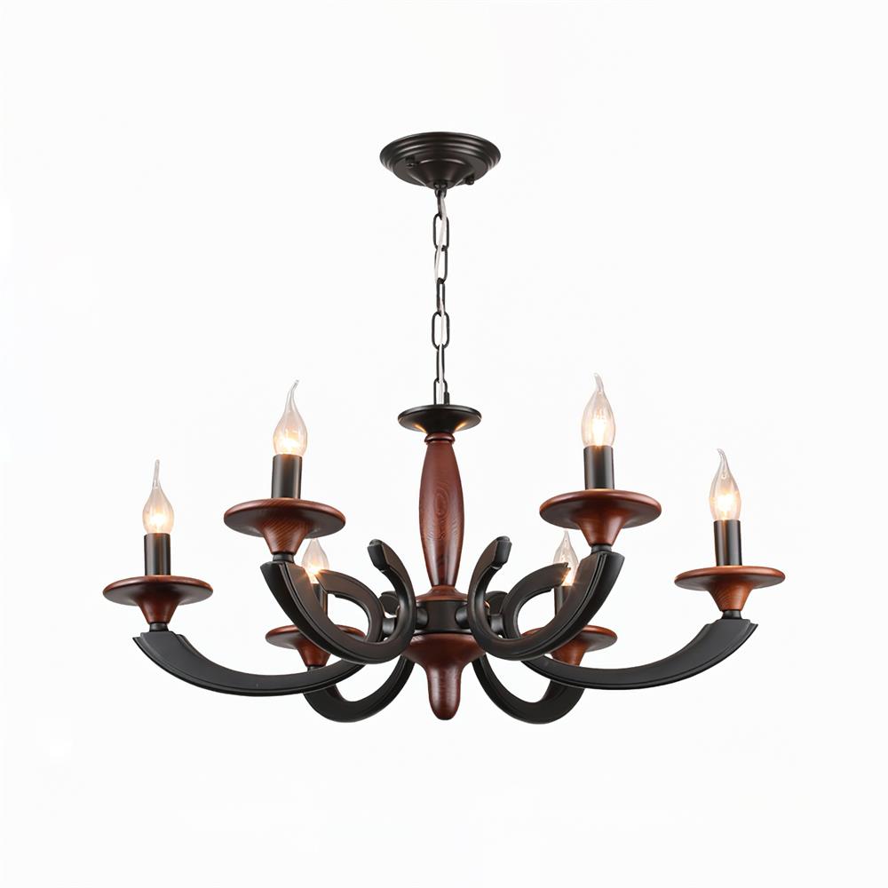 The Eldric Chandelier reimagines classical elegance with a sculptural twist. Its gracefully curved arms, crafted from rich wood and dark metal, evoke the warmth of traditional candlelight while maintaining a modern architectural rhythm. Each flame-shaped bulb enhances the chandelier’s timeless allure, casting a soft, ambient glow that transforms any room into a refined, inviting space. Perfect for those who appreciate craftsmanship, balance, and the quiet drama of design.