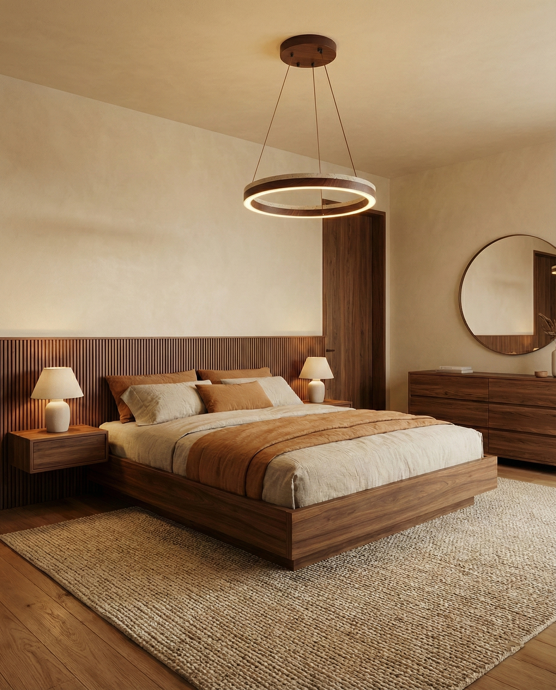 The Solaro Chandelier reimagines celestial geometry in a refined material palette. A harmonious fusion of rich wood grain and natural travertine forms a perfectly proportioned ring that floats effortlessly in space, suspended by slender cables that enhance its visual lightness. The embedded LED light source casts an even, radiant glow—highlighting the warm textures of the stone while providing practical, ambient illumination.