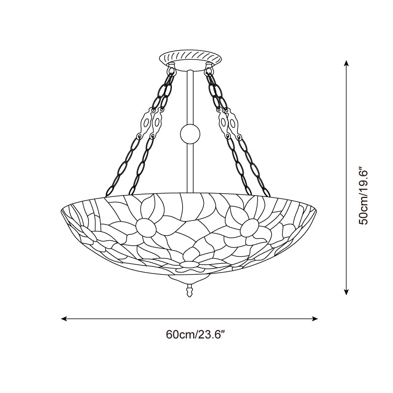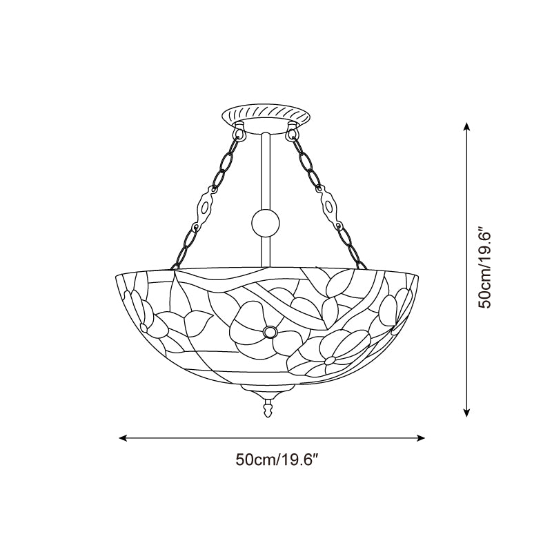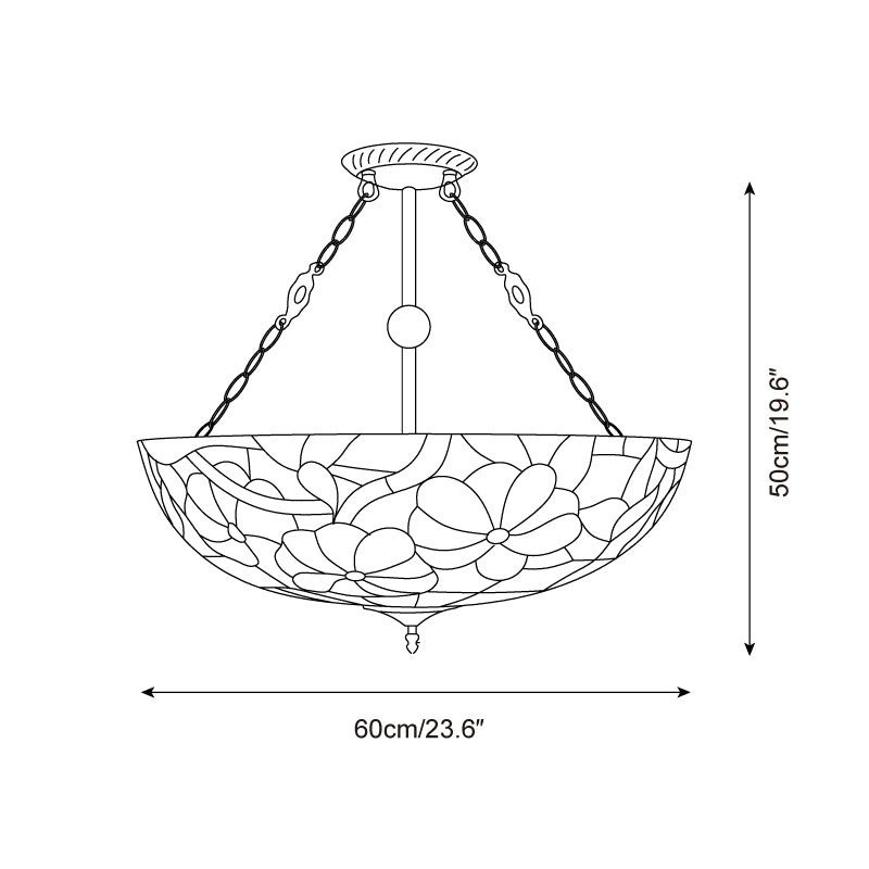 Evoking the golden warmth of a sun-dappled garden, the Sunnylace Chandelier is a radiant celebration of nature’s brilliance. Handcrafted with intricate stained glass, its bowl-shaped shade blossoms with vibrant florals—bold reds, soft pinks, tranquil blues—woven among winding golden branches and lush green leaves.