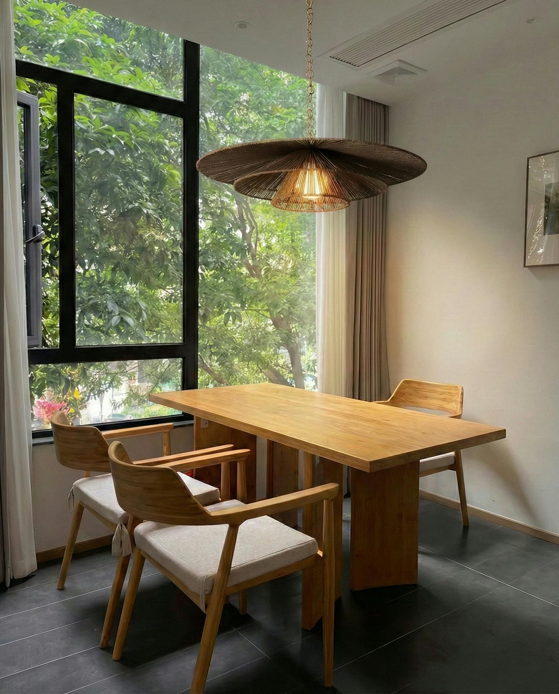 The Solayne Chandelier brings an effortless sculptural elegance to any space, pairing airy woven craftsmanship with a striking tiered silhouette. Its wide, sun-hat–inspired form is built from meticulously wrapped fibers that radiate outward in delicate, linear patterns, casting soft, dappled shadows as light filters through. Suspended from a refined gold chain, Solayne feels both organic and modern—an artful statement piece that adds warmth, texture, and quiet sophistication to dining rooms, lounges, and serene minimalist interiors.