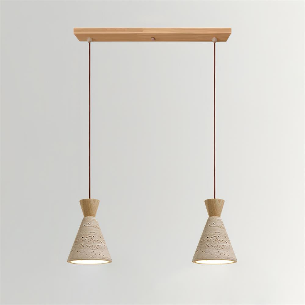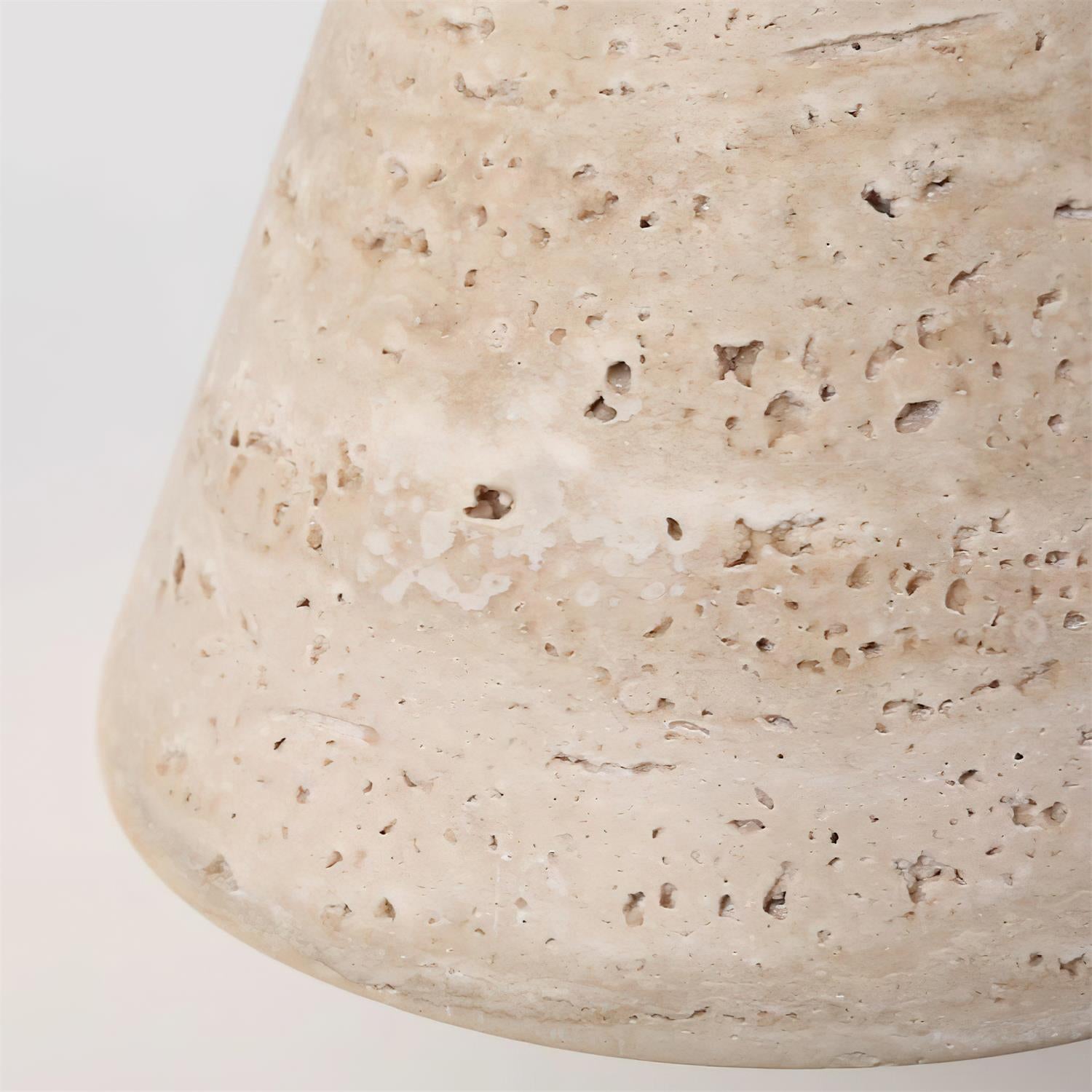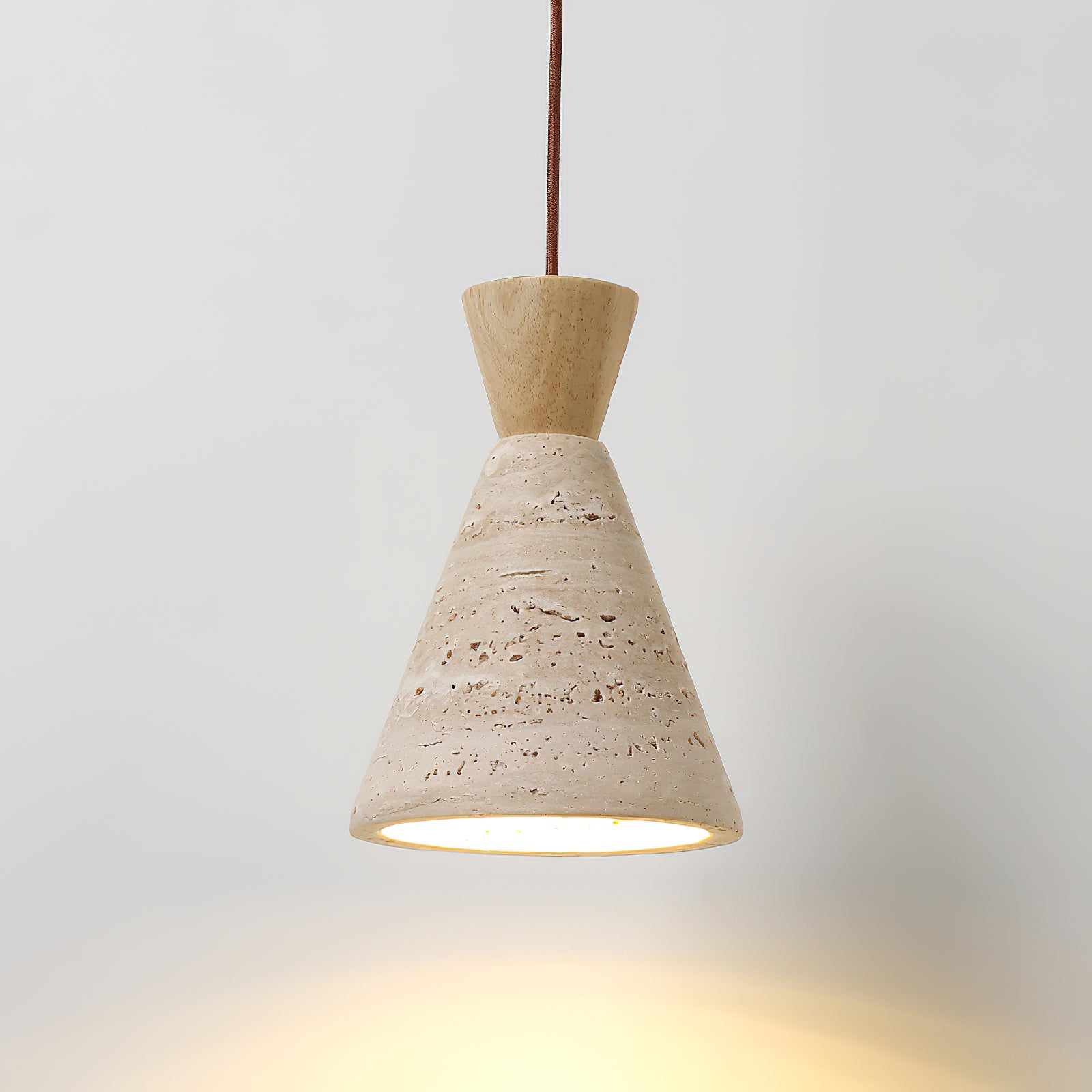 The Cielo Pendant Lamp is a striking piece that celebrates the beauty of natural materials and minimalist form. Its conical shade is crafted from porous travertine, a stone with a rich, tactile surface that creates a unique interplay of light and shadow. The shade is elegantly topped with a simple, contrasting wood fixture in either a warm or darker tone, which enhances its sculptural quality.