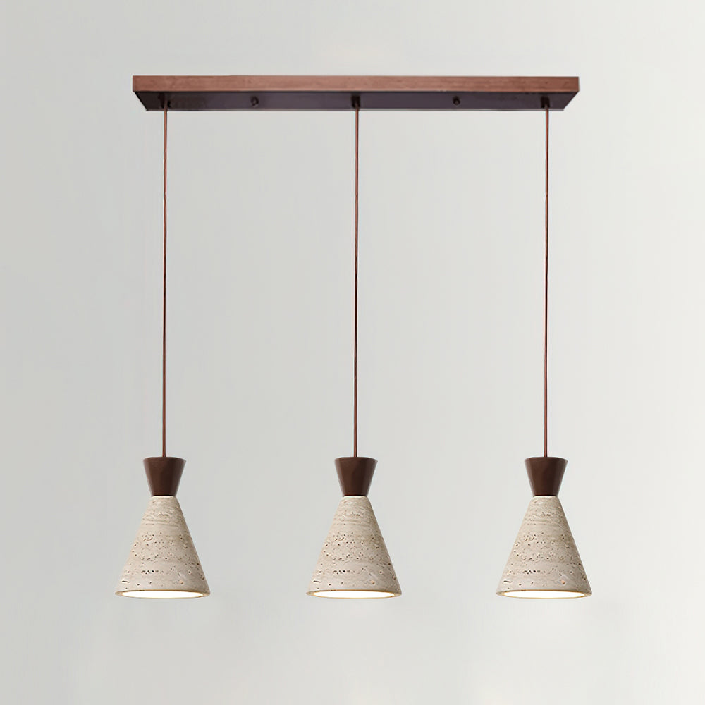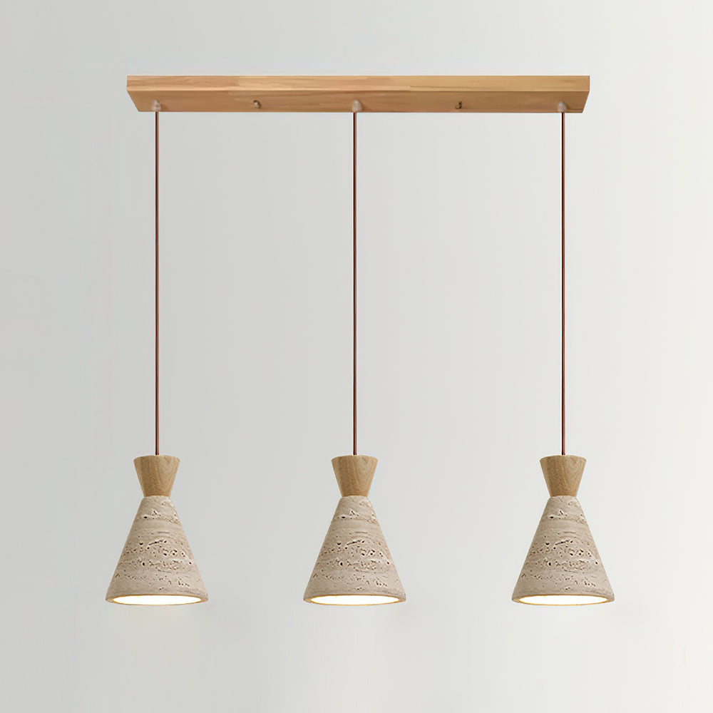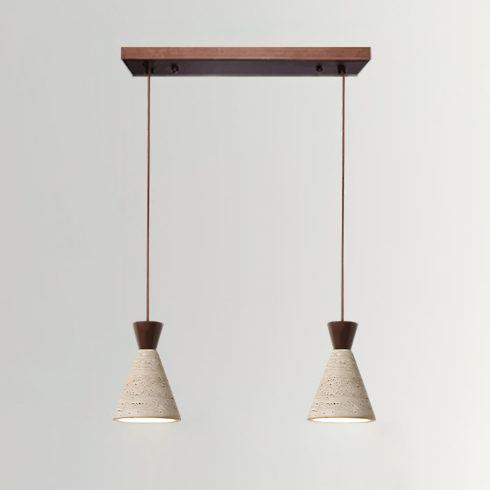 The Cielo Pendant Lamp is a striking piece that celebrates the beauty of natural materials and minimalist form. Its conical shade is crafted from porous travertine, a stone with a rich, tactile surface that creates a unique interplay of light and shadow. The shade is elegantly topped with a simple, contrasting wood fixture in either a warm or darker tone, which enhances its sculptural quality.