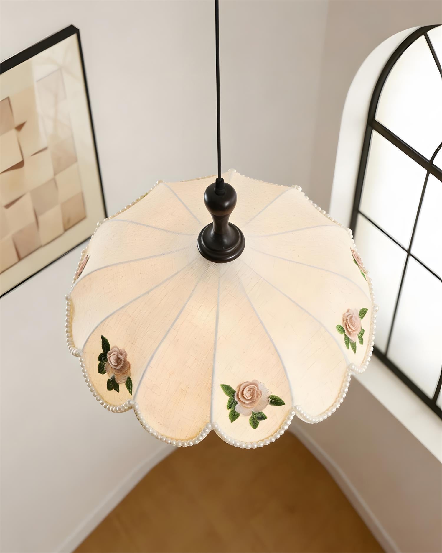 The Pearlune Pendant Lamp brings together romantic vintage charm and delicate decorative detailing through a softly scalloped silhouette that feels graceful, feminine, and timeless. Its warm ivory shade is accented with floral appliqué motifs and pearl-like trim, creating a couture-inspired look that adds texture, softness, and refined ornamentation to the design, while the dark wood-toned top detail introduces a subtle sense of contrast and classic warmth.