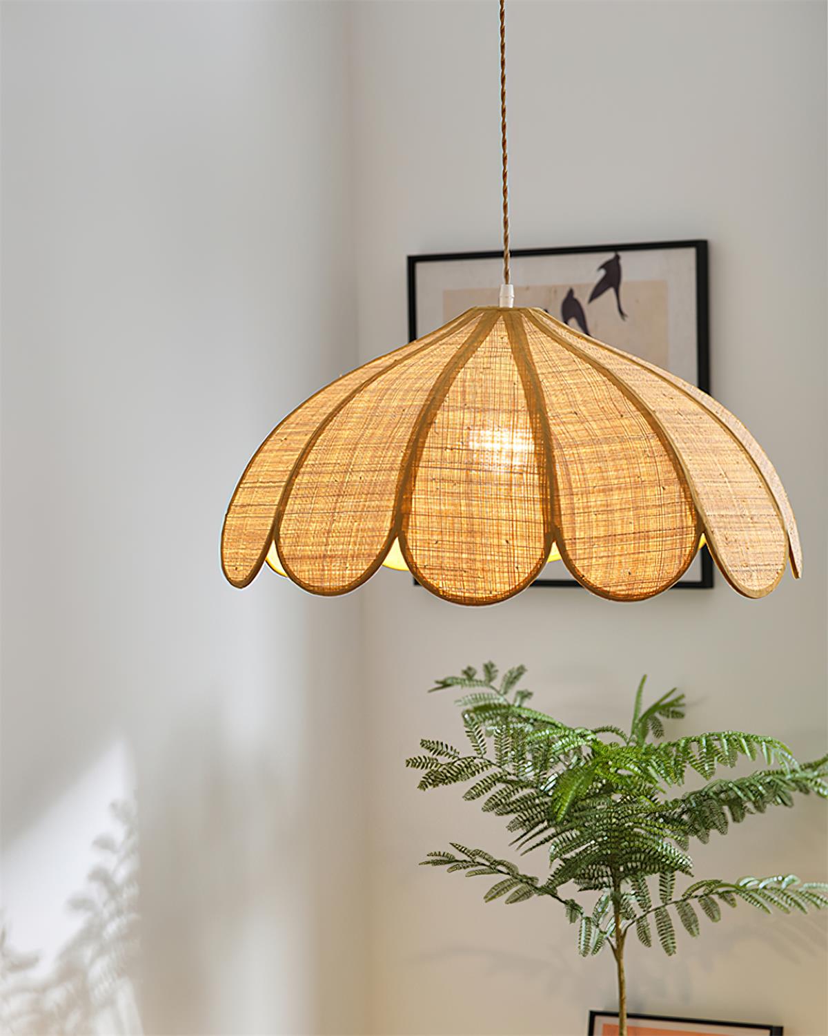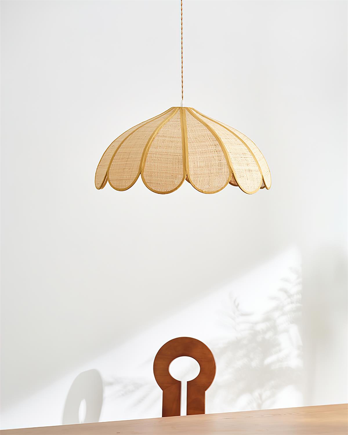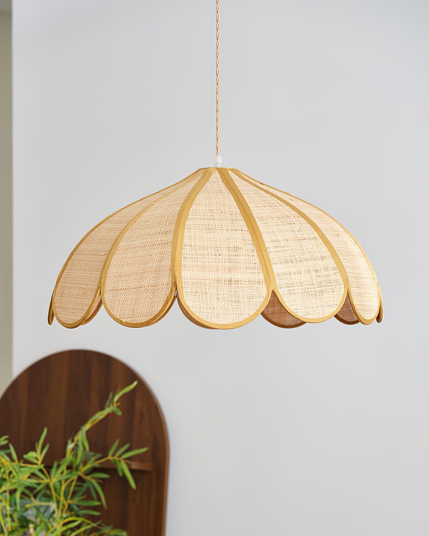 The Sukina Pendant Lamp captures the essence of organic elegance with its petal-like scalloped shade crafted from natural woven fibers. Its gentle curves and warm texture evoke a sense of softness and serenity, making it an ideal piece for spaces that embrace lightness and calm. Suspended with a braided cord, this lamp blends artisanal charm with contemporary design, casting a warm, diffused glow that transforms any room into a tranquil retreat.