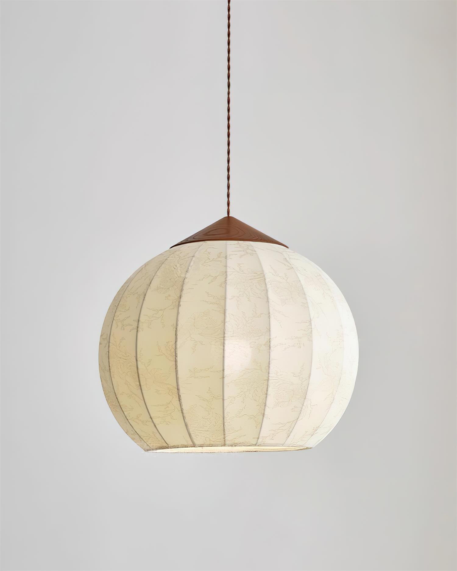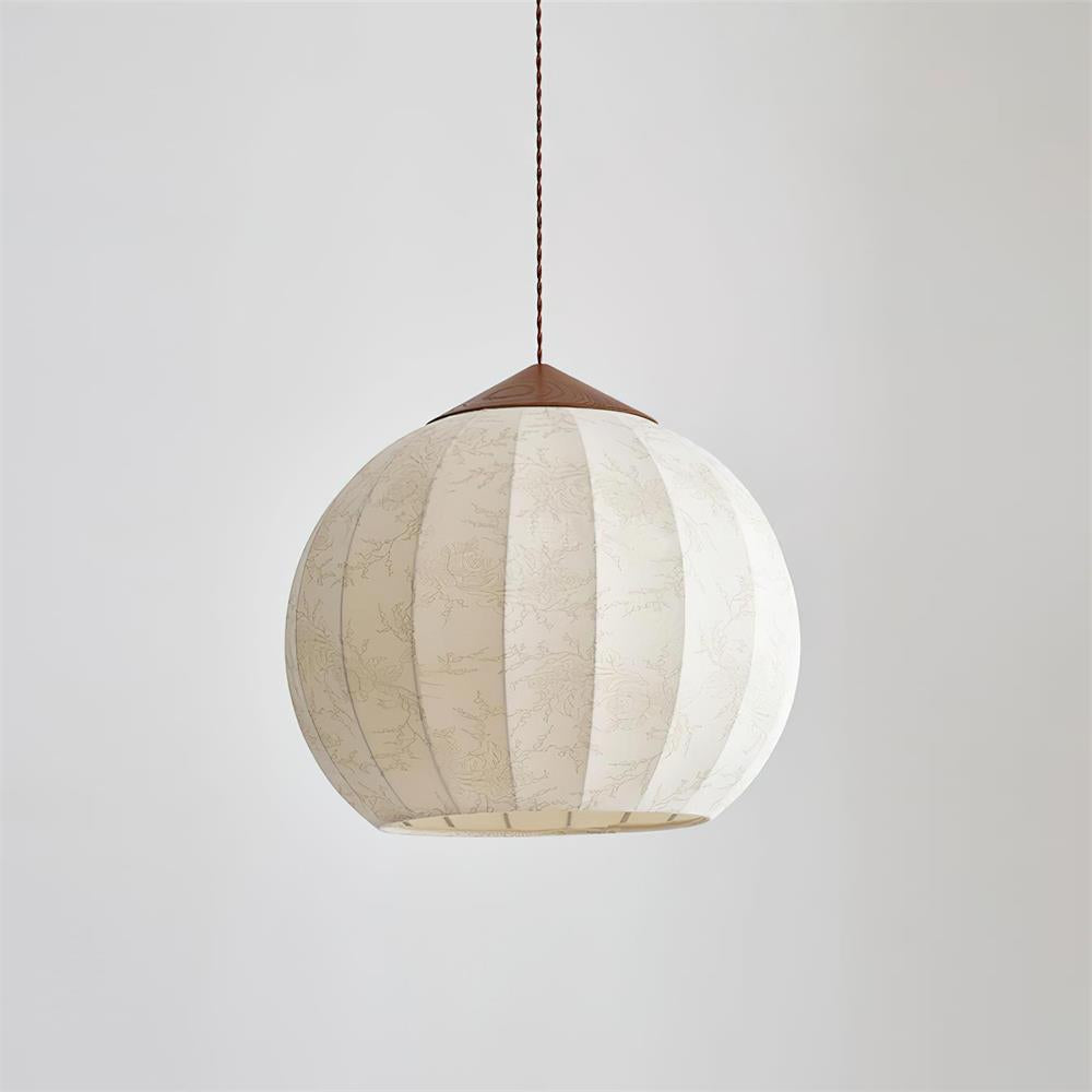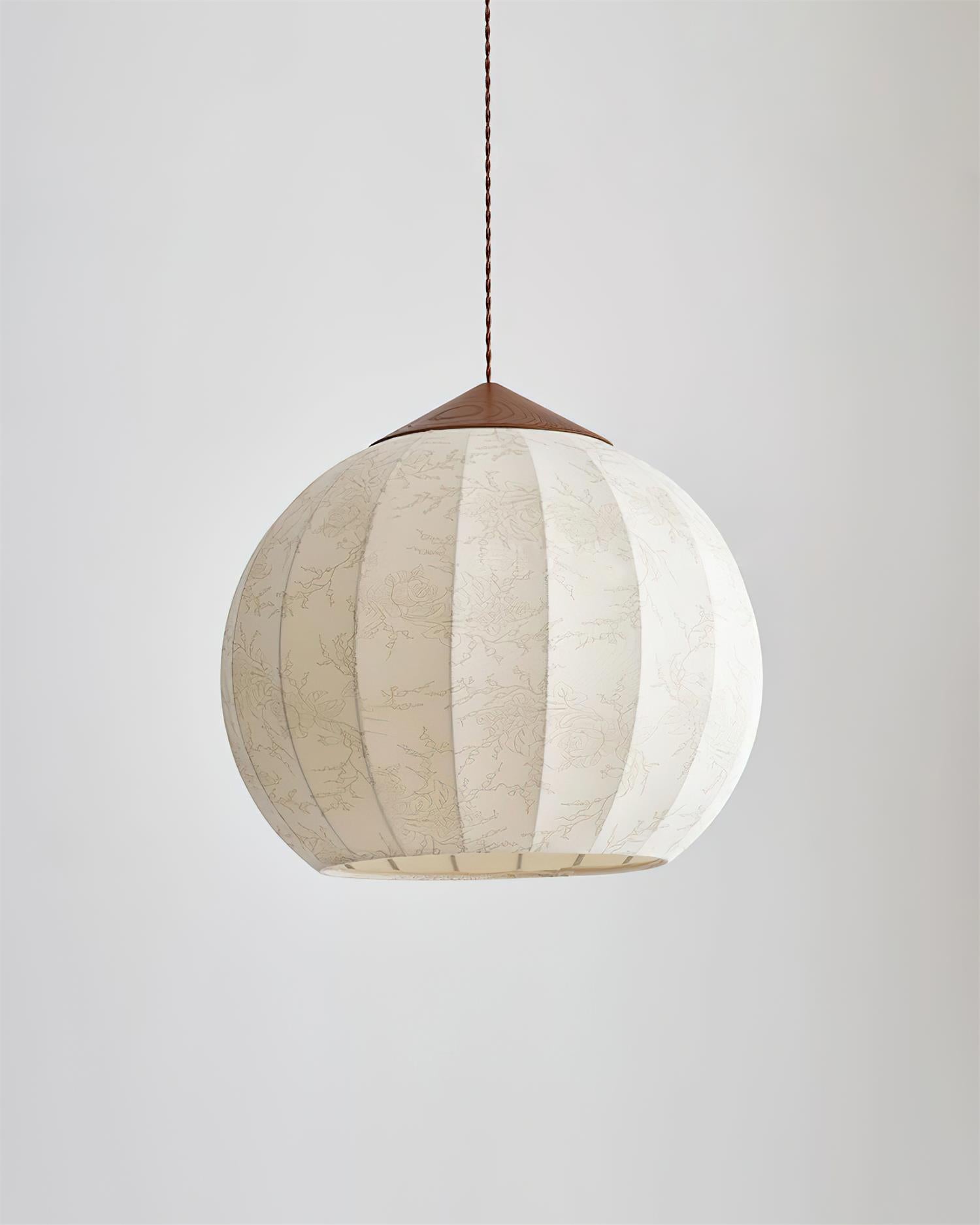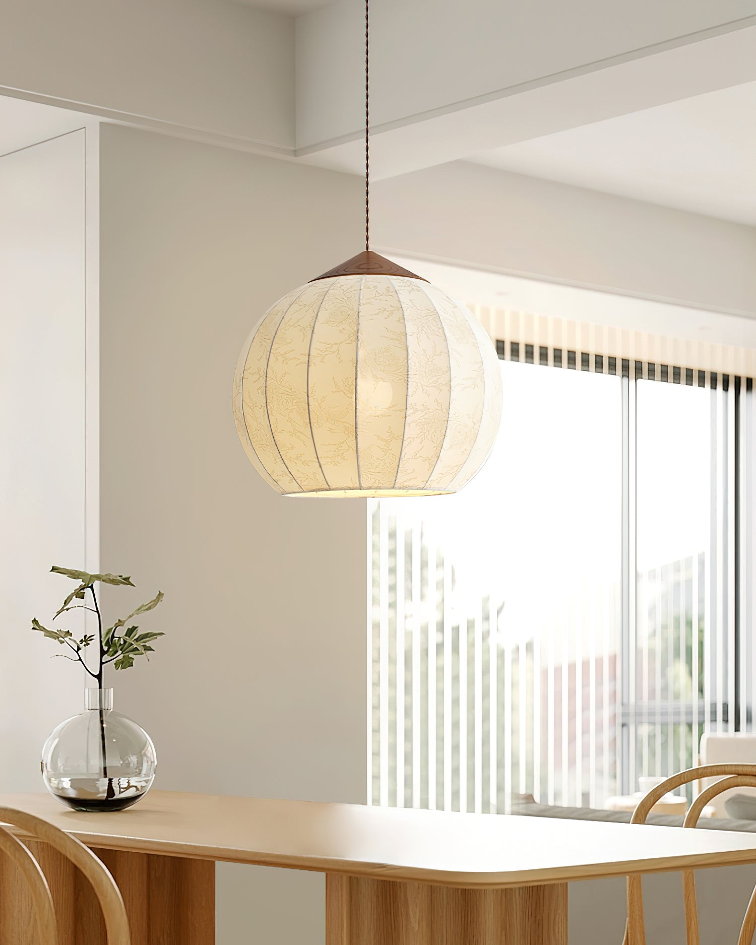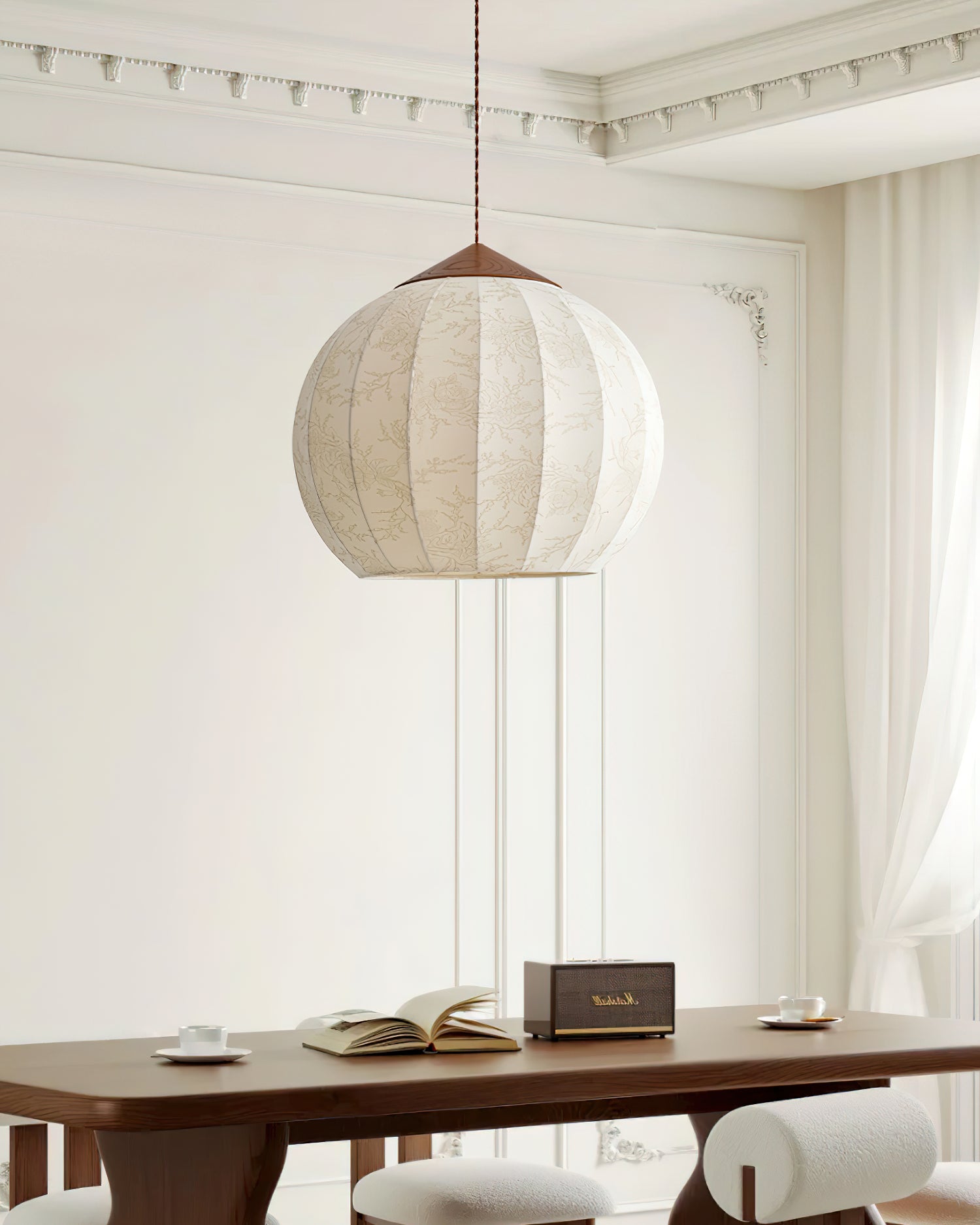 The Veyona Pendant Lamp exudes timeless elegance with its delicate fabric shade adorned with a subtle floral pattern, creating a sophisticated and serene atmosphere. The light flows gracefully through its soft, white stripes, enhanced by the natural warmth of the wooden top, offering a harmonious blend of modern and classic design. whether in a dining area or a cozy living room, this pendant light is a statement piece that enhances both ambiance and style.