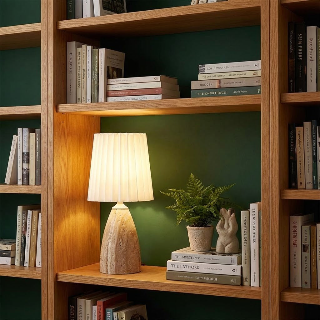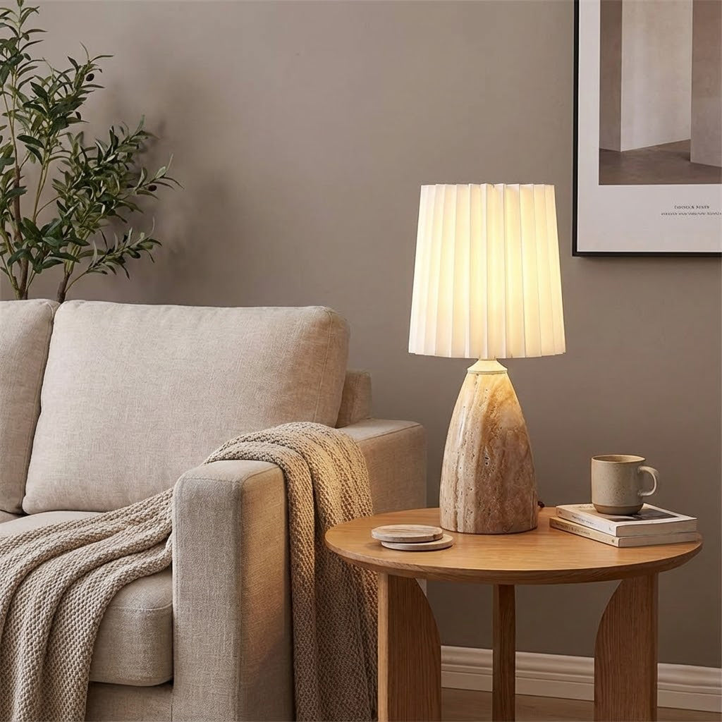 The Fina Table Lamp combines natural elegance and refined design to elevate any space. Featuring a travertine stone base, each lamp showcases unique textures and patterns, making it a one-of-a-kind piece. The pleated lampshade diffuses a warm and inviting glow, creating a cozy and sophisticated ambiance.This lamp’s solid construction and timeless design make it a versatile addition to both modern and classic interiors.