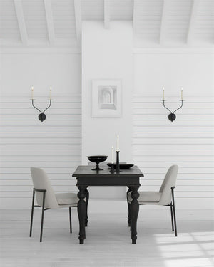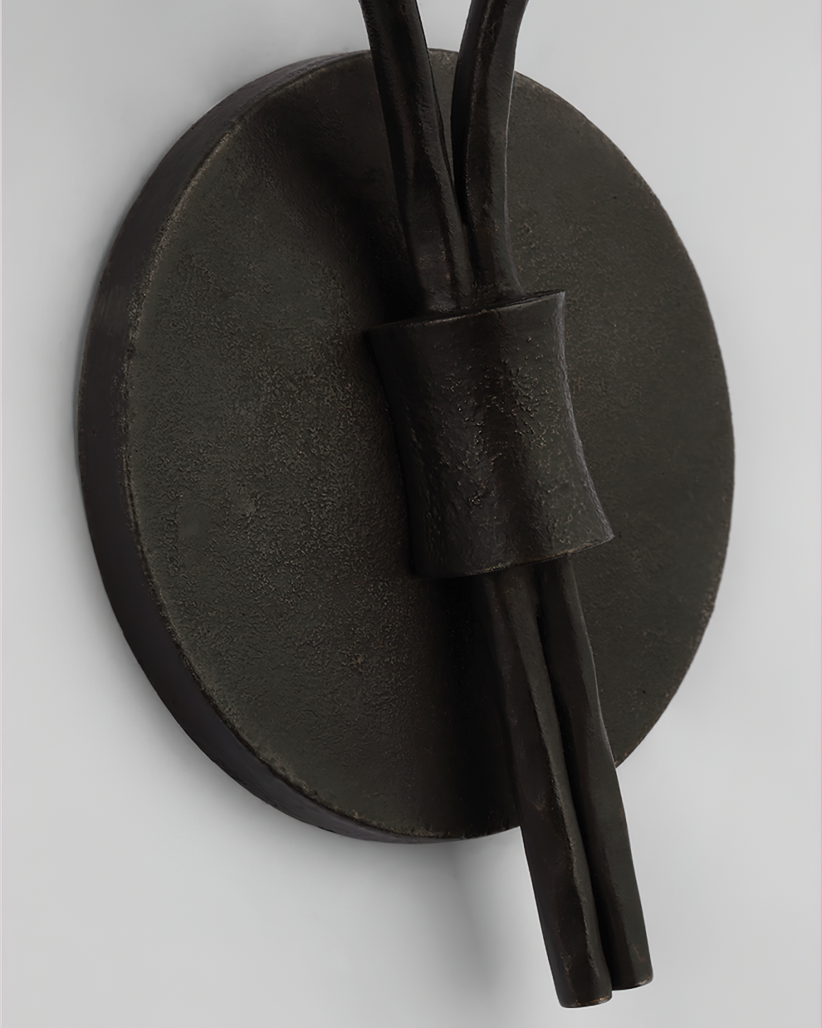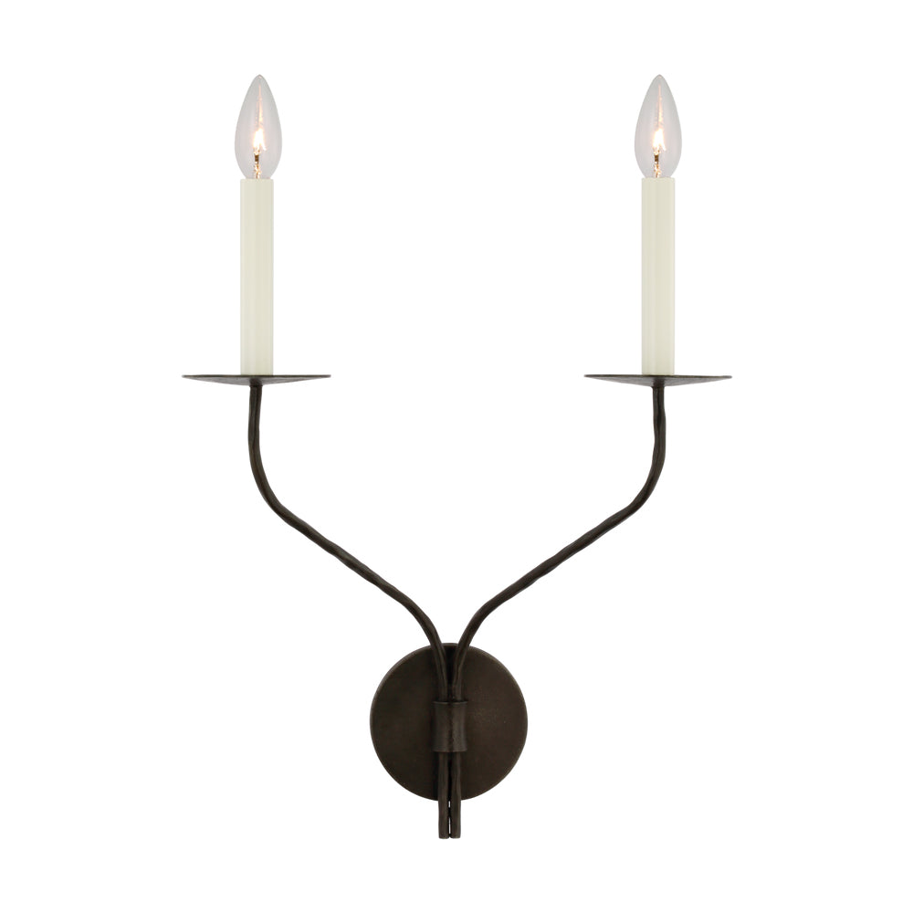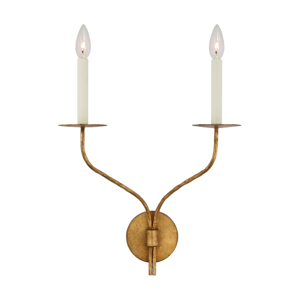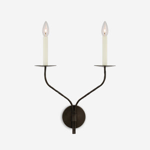 The Belfair Large Double Wall Lamp blends classical charm with understated elegance. Inspired by antique candelabras, its dual arms branch gracefully from a central base, finished in either rich gold or a refined blackened bronze. The slender, hand-forged arms hold candle-style bulbs that evoke a timeless ambiance, casting a warm and inviting glow. Ideal for framing a mirror, flanking a bed, or adding sculptural sophistication to a hallway, this wall lamp offers a perfect balance of minimalism and artisanal detail.