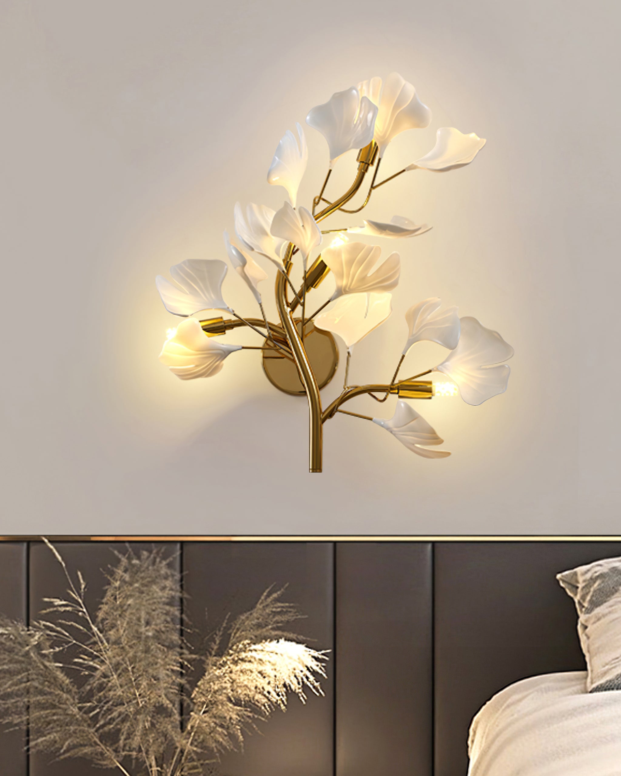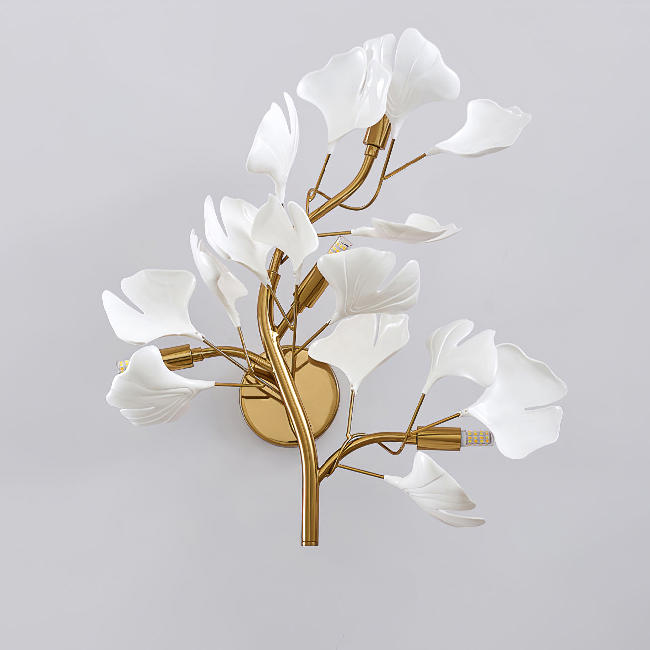 Diese Lampe ist vom Ginkgoblatt inspiriert und stellt eine meisterhafte Darstellung natürlicher Schönheit und Eleganz dar. Jedes Blatt wurde mit Präzision und Sorgfalt gefertigt und strahlt ein weiches, stimmungsvolles Licht aus, das einen warmen Schein erzeugt, der die goldfarbenen Zweige ergänzt. Diese Leuchte ist nicht nur eine Lichtquelle, sondern ein skulpturales Statement-Stück, das Eleganz und Anmut verkörpert.