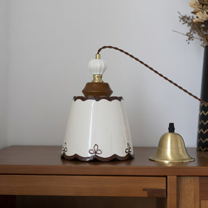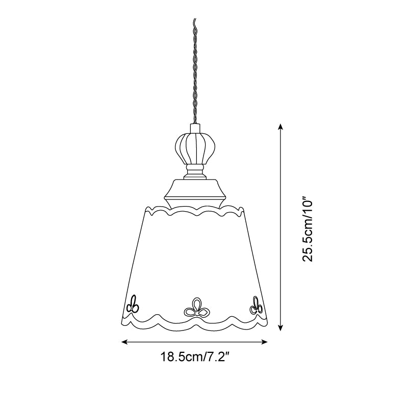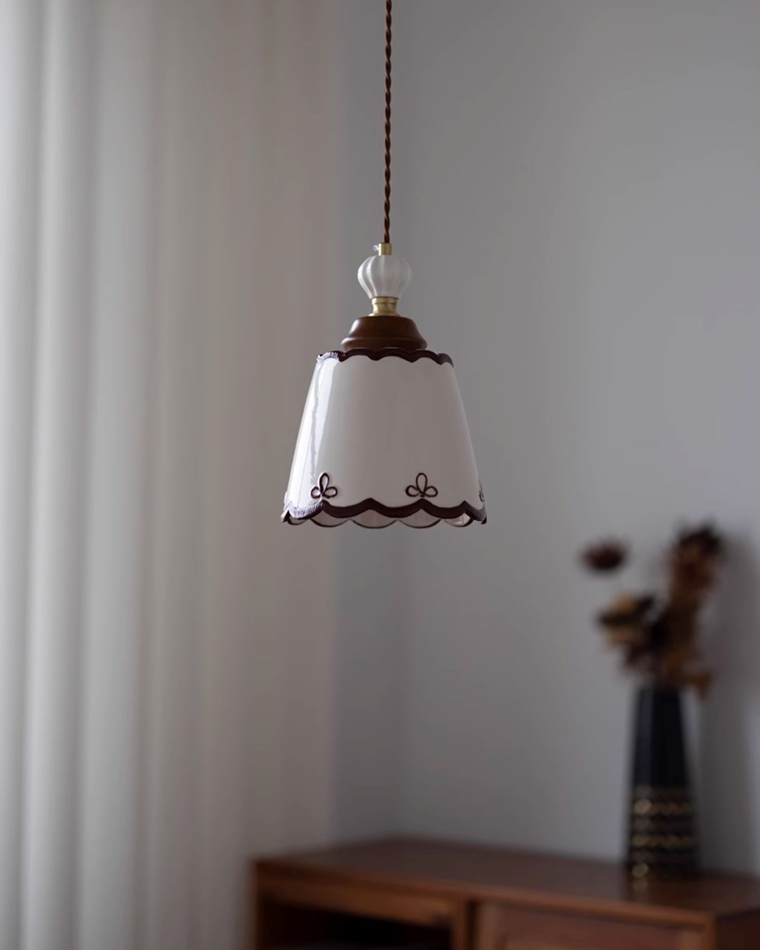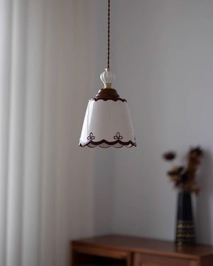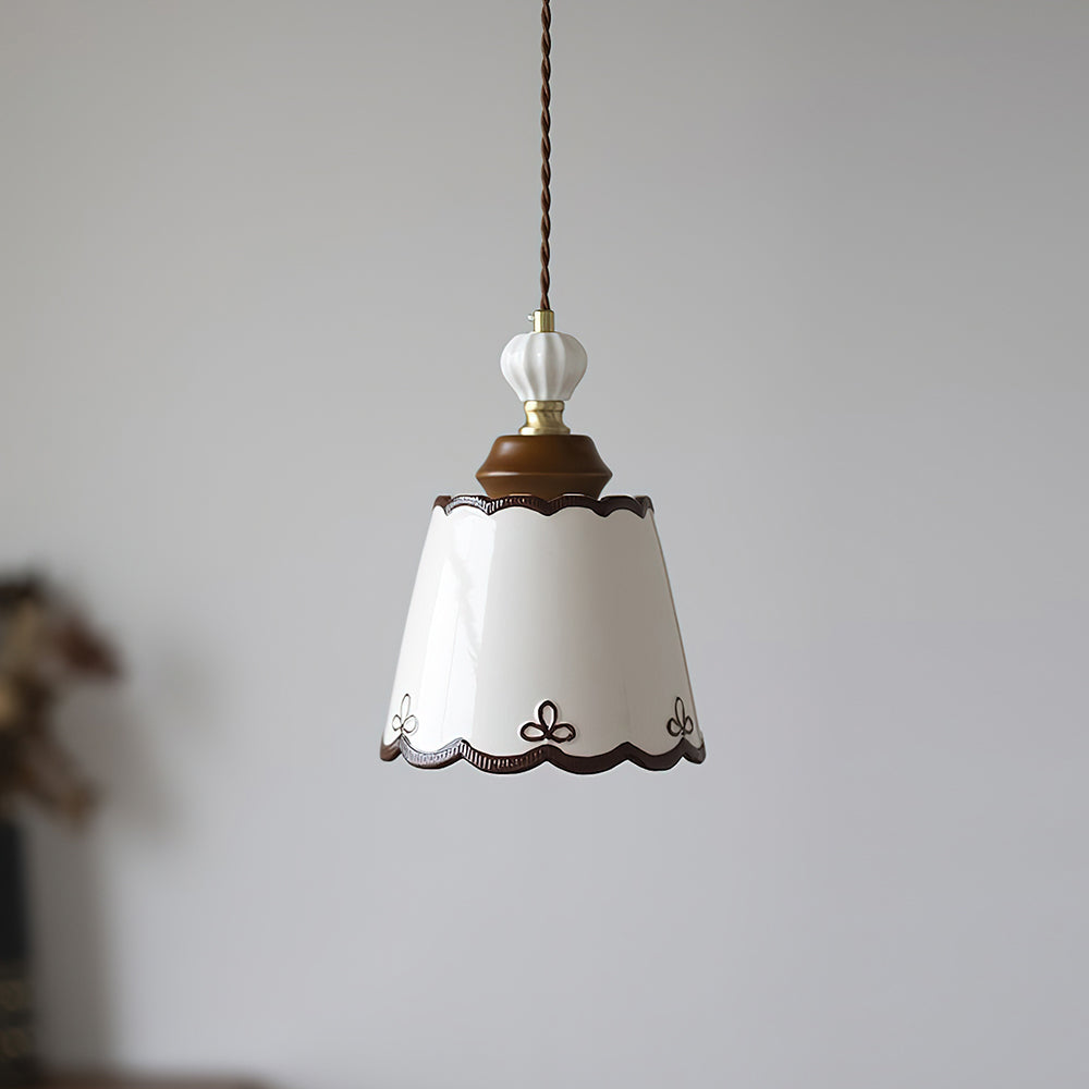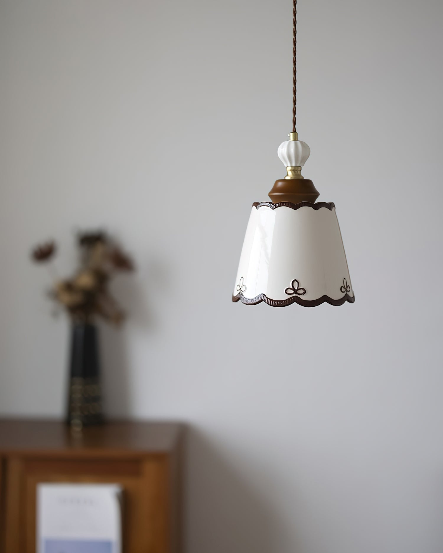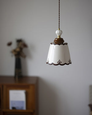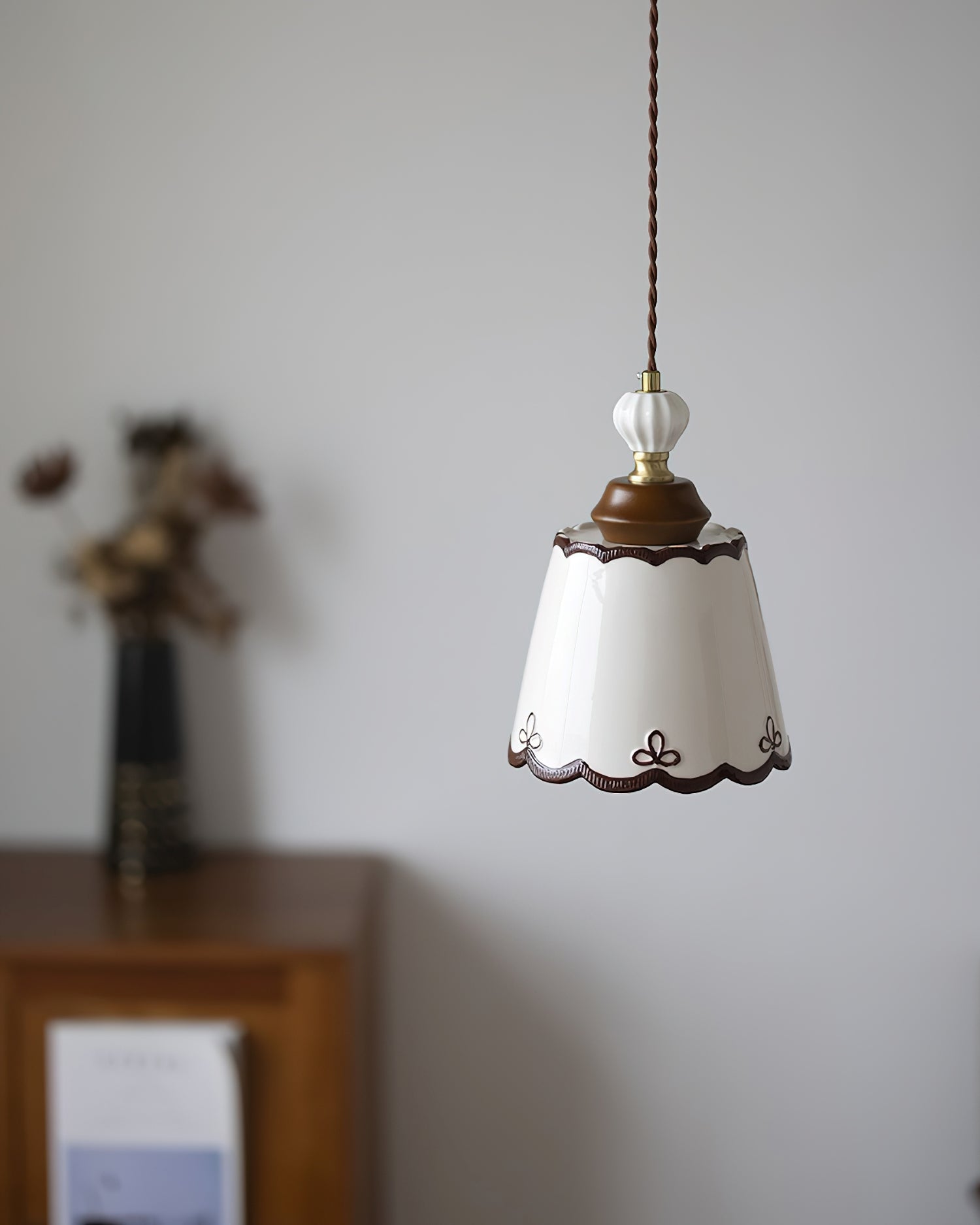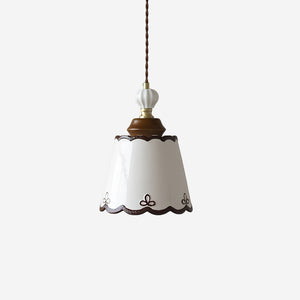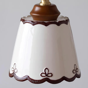 This Klimt Ceramics Pendant Lamp features a beautifully crafted ceramic shade with delicate, hand-painted accents. The charming design incorporates scalloped edges and floral motifs, adding a soft, vintage-inspired touch to any space. The glossy white finish is complemented by a warm bronze-colored trim, creating a sophisticated contrast that highlights the lamp’s timeless appeal.