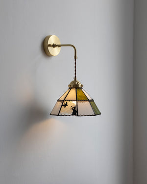 The Leporine Wall Lamp invites whimsy into your space with a delicate balance of nostalgia and storytelling. Crafted from stained glass in soft olive and frosted whites, each panel reveals playful silhouettes of rabbits caught in mid-leap — a charming nod to nature’s gentler moments. The brass arm adds a touch of refinement, while the twisted cord enhances its vintage soul.