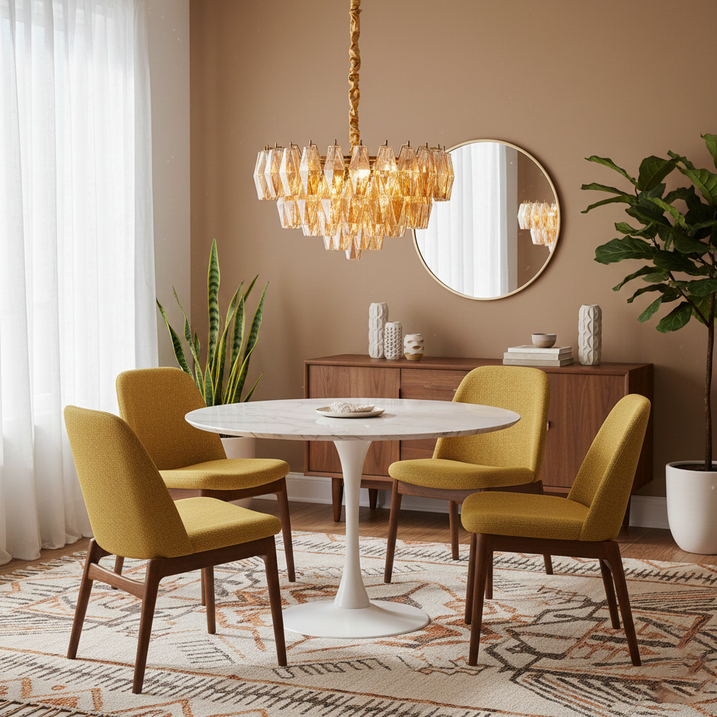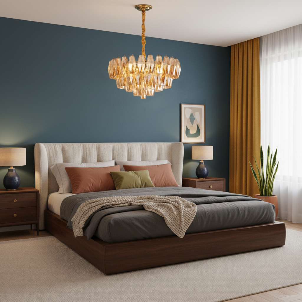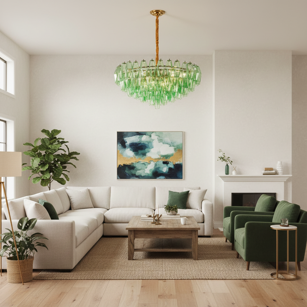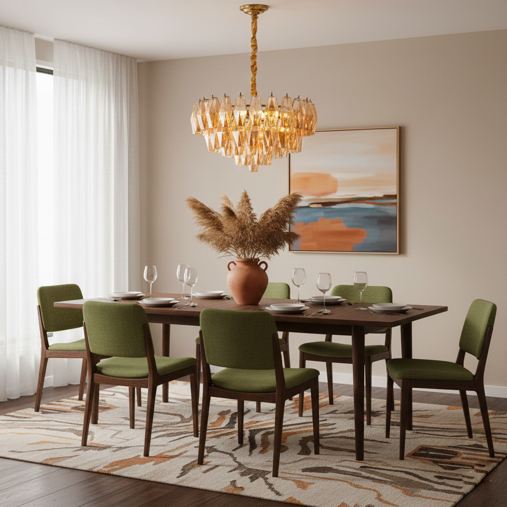 Like dewdrops caught in morning light, the Selvara Chandelier floats with an effortless balance of geometry and glow. Its tiered silhouette—composed of hand-blown glass prisms in vibrant amber or verdant green—evokes both natural rhythm and architectural poise. The brass-accented frame and velvet-wrapped suspension enhance its elegant profile, adding warmth and tactile richness. Selvara brings a radiant energy that feels both grounded and ethereal—a statement of organic modernism in its most luminous form.