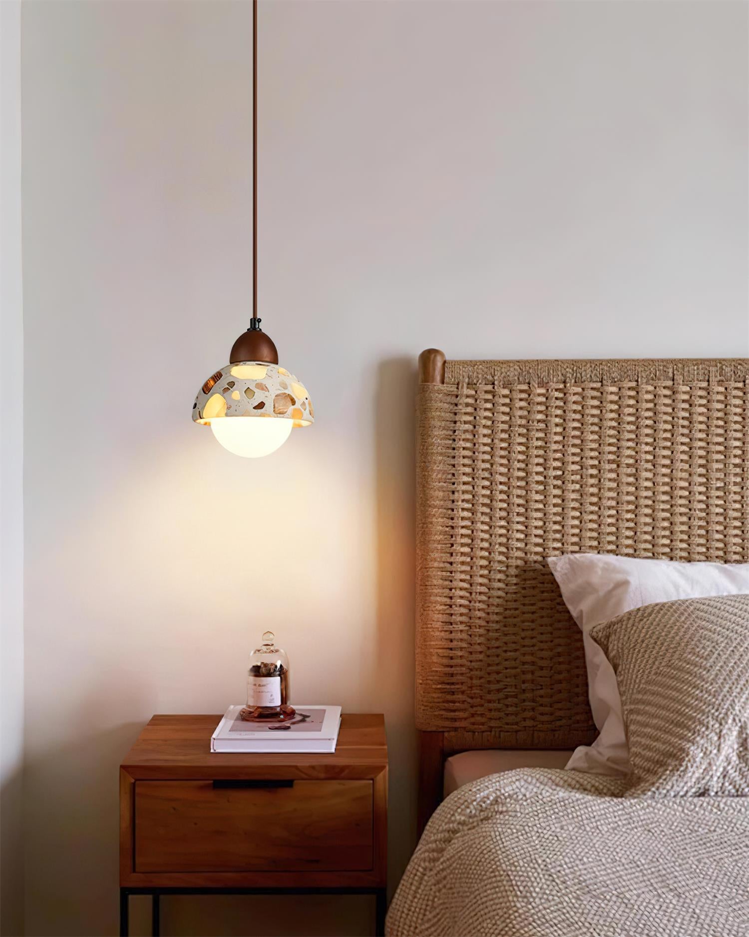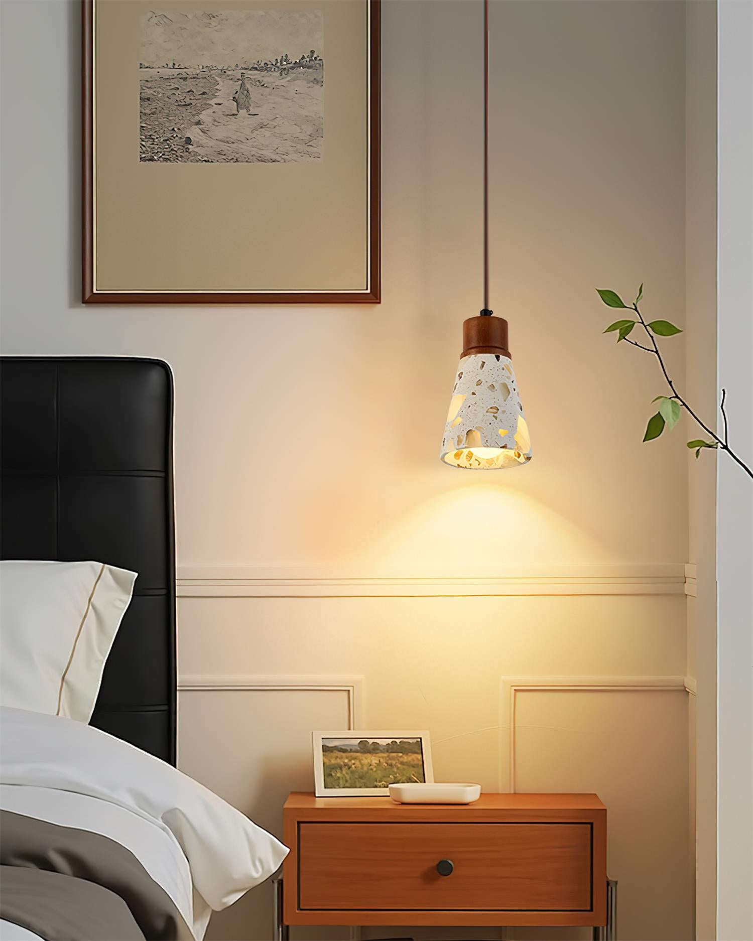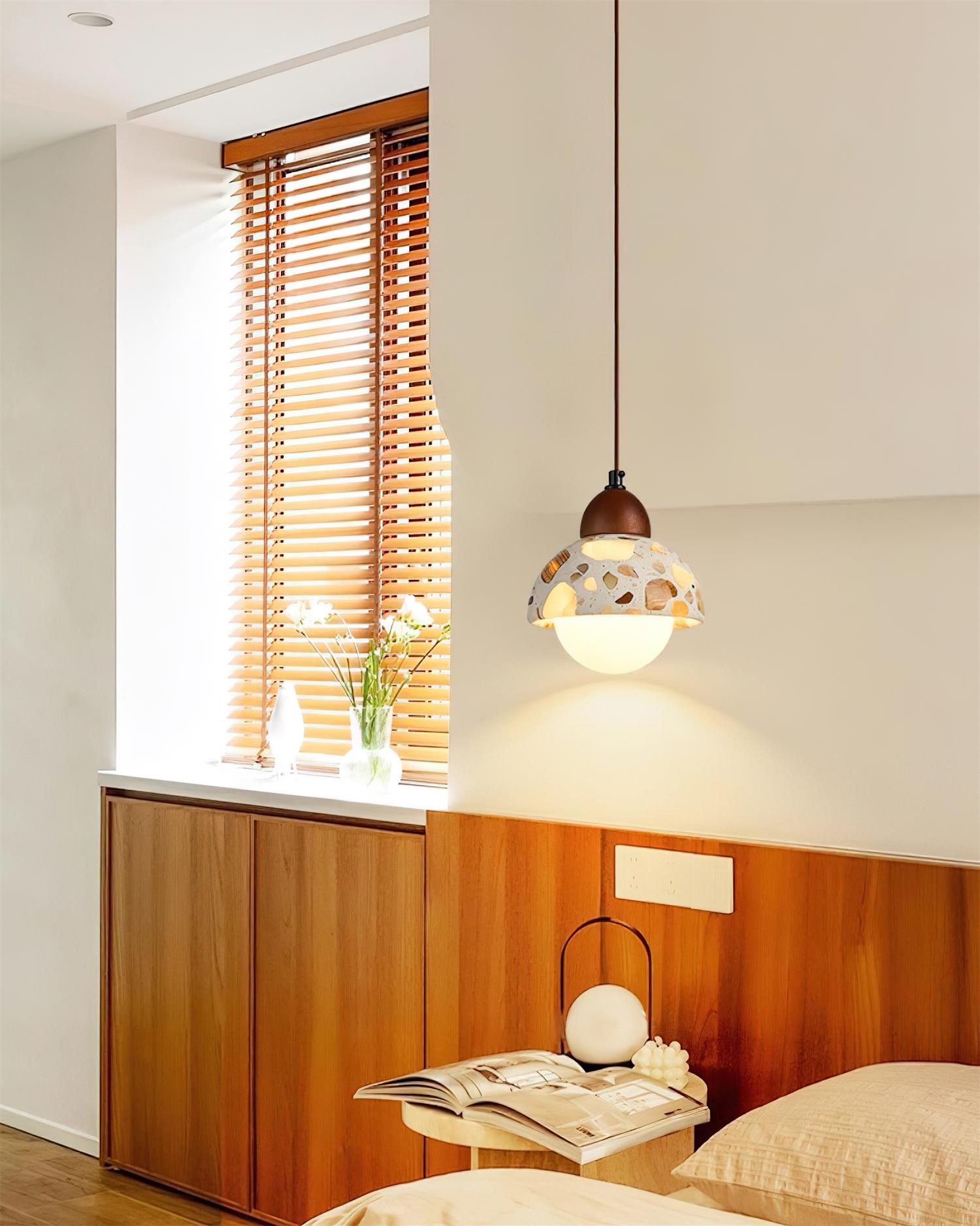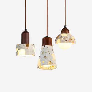 The Tressa Pendant Lamp collection blends sculptural form with earthy character, featuring terrazzo-style stone inlays and smooth wooden accents. Each variation highlights a unique silhouette—whether conical, dome-like, or cylindrical—creating a striking yet natural focal point. Ideal for dining corners or cozy reading nooks, these pendant lamps cast a warm, inviting glow that enhances any space with organic elegance and artisanal charm.