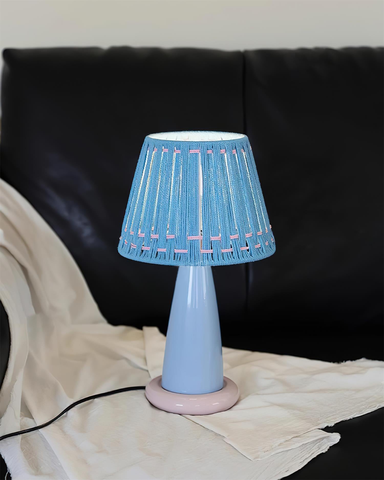 The Breeze Table Lamp brings a playful charm to any setting with its pastel palette and handcrafted details. Its smooth ceramic base, glazed in soft blue with a blush-toned ring, provides a gentle contrast to the woven shade stitched in complementary hues. When lit, the shade reveals a warm, textured glow that shifts the mood from fresh daylight vibrancy to cozy evening ambiance.