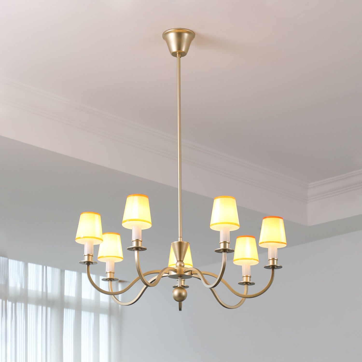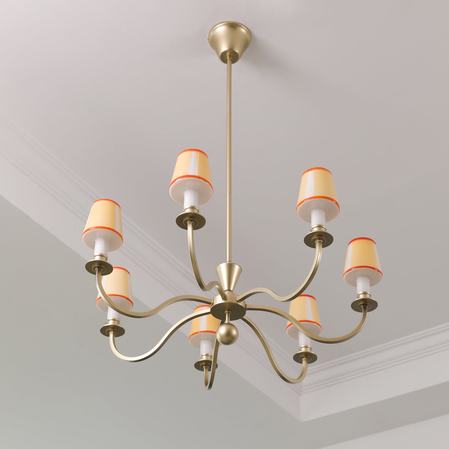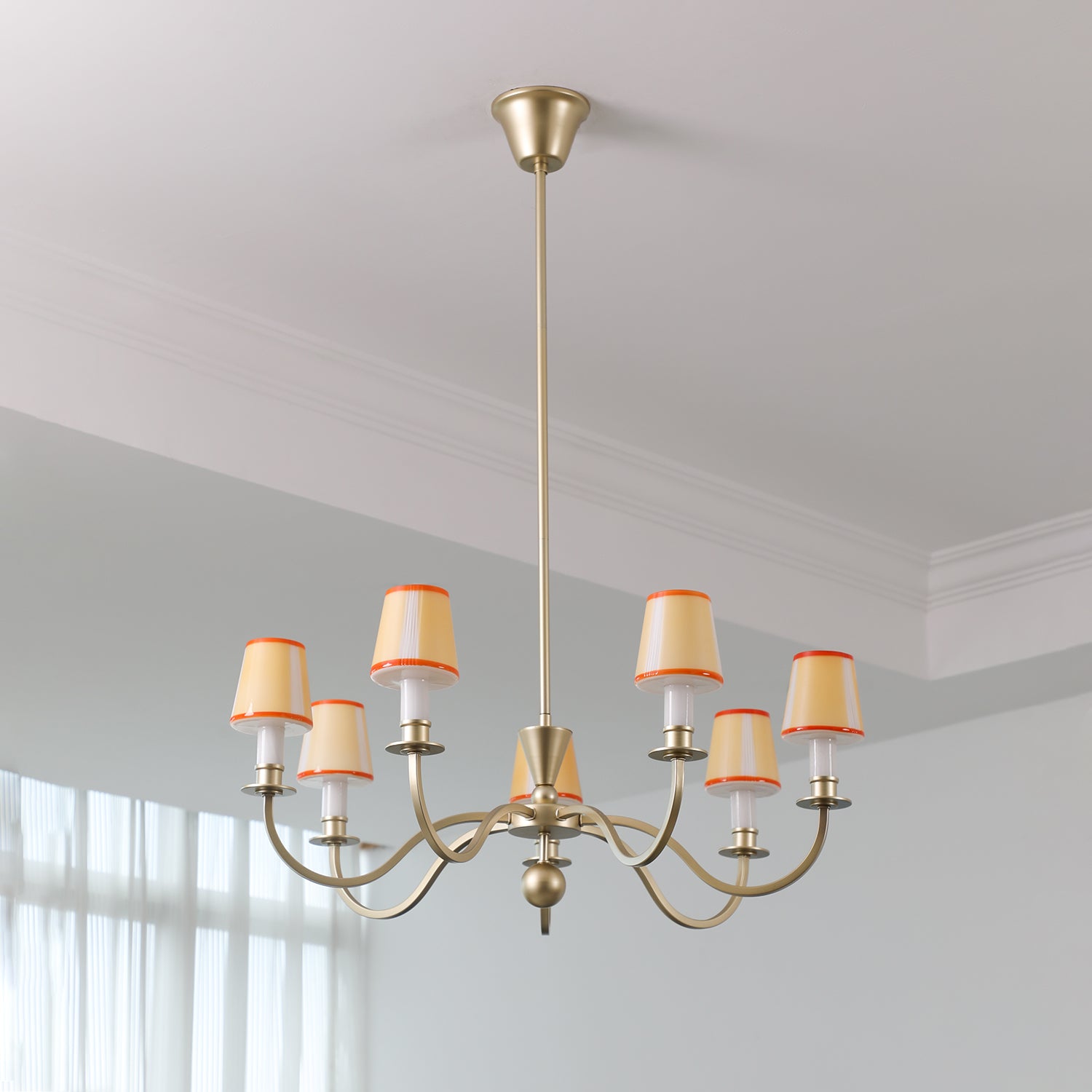 The Elviera Chandelier blends timeless elegance with a touch of playful charm, featuring slender golden arms that gracefully extend to hold delicate lampshades accented with a subtle orange trim. Its balanced composition creates a warm, inviting glow, making it ideal for dining rooms, living spaces, or entryways that call for refined yet approachable sophistication. With its harmonious design and soft illumination, the Elviera Chandelier adds both character and grace to any interior.