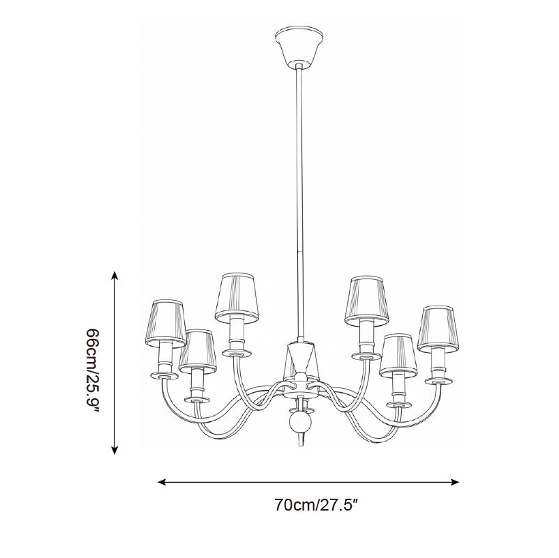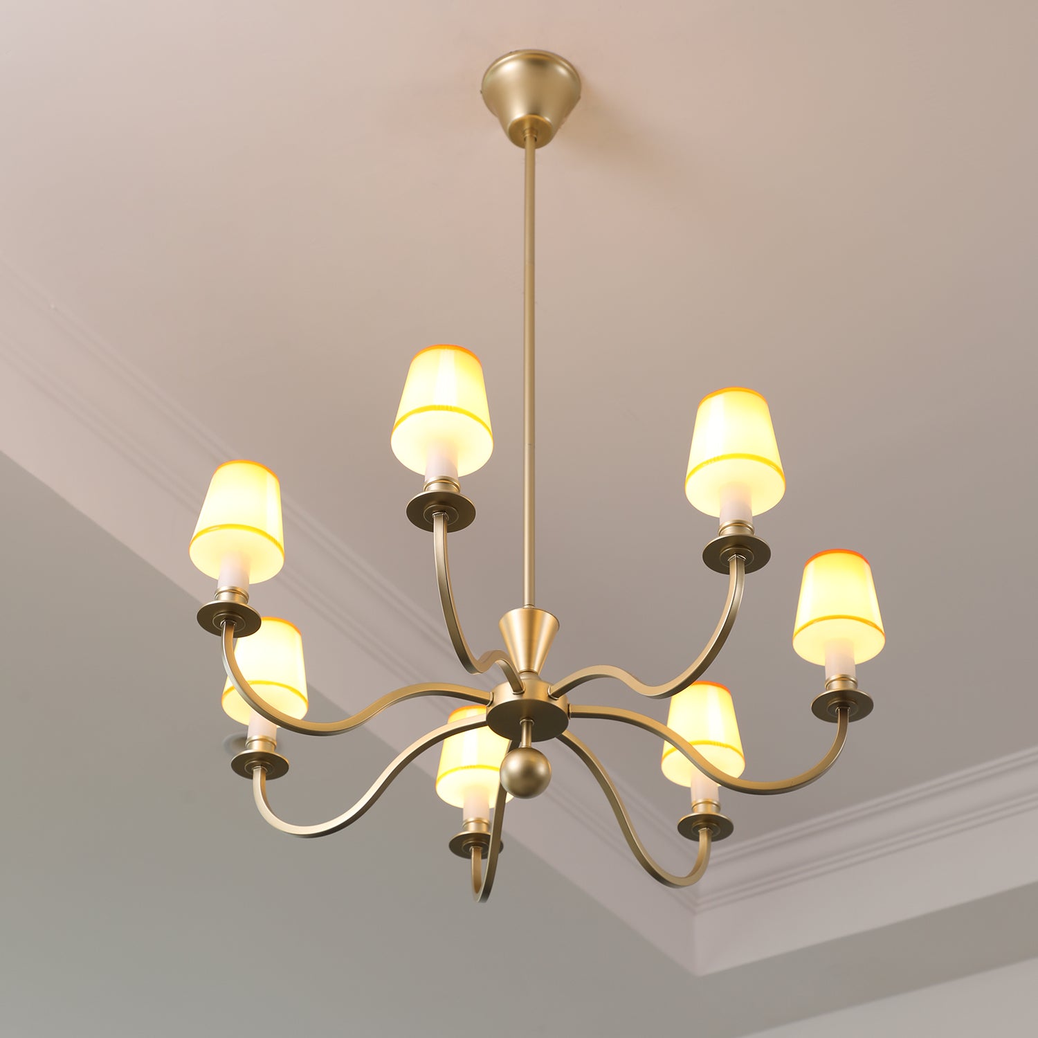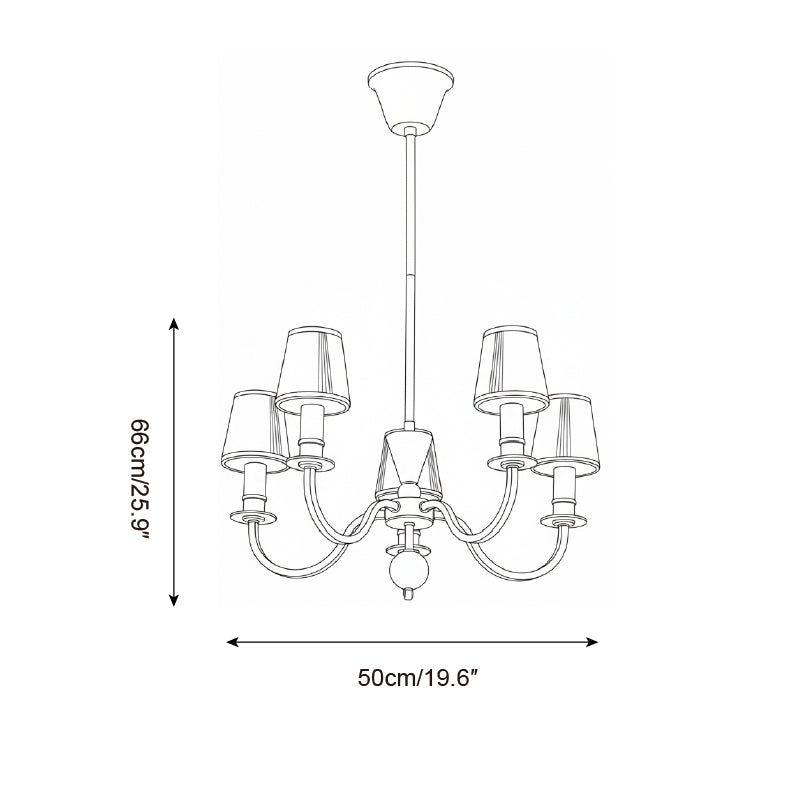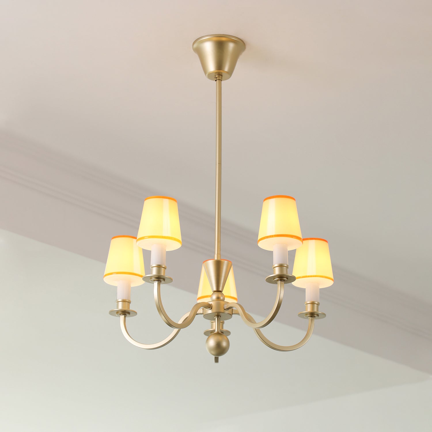 The Elviera Chandelier blends timeless elegance with a touch of playful charm, featuring slender golden arms that gracefully extend to hold delicate lampshades accented with a subtle orange trim. Its balanced composition creates a warm, inviting glow, making it ideal for dining rooms, living spaces, or entryways that call for refined yet approachable sophistication. With its harmonious design and soft illumination, the Elviera Chandelier adds both character and grace to any interior.