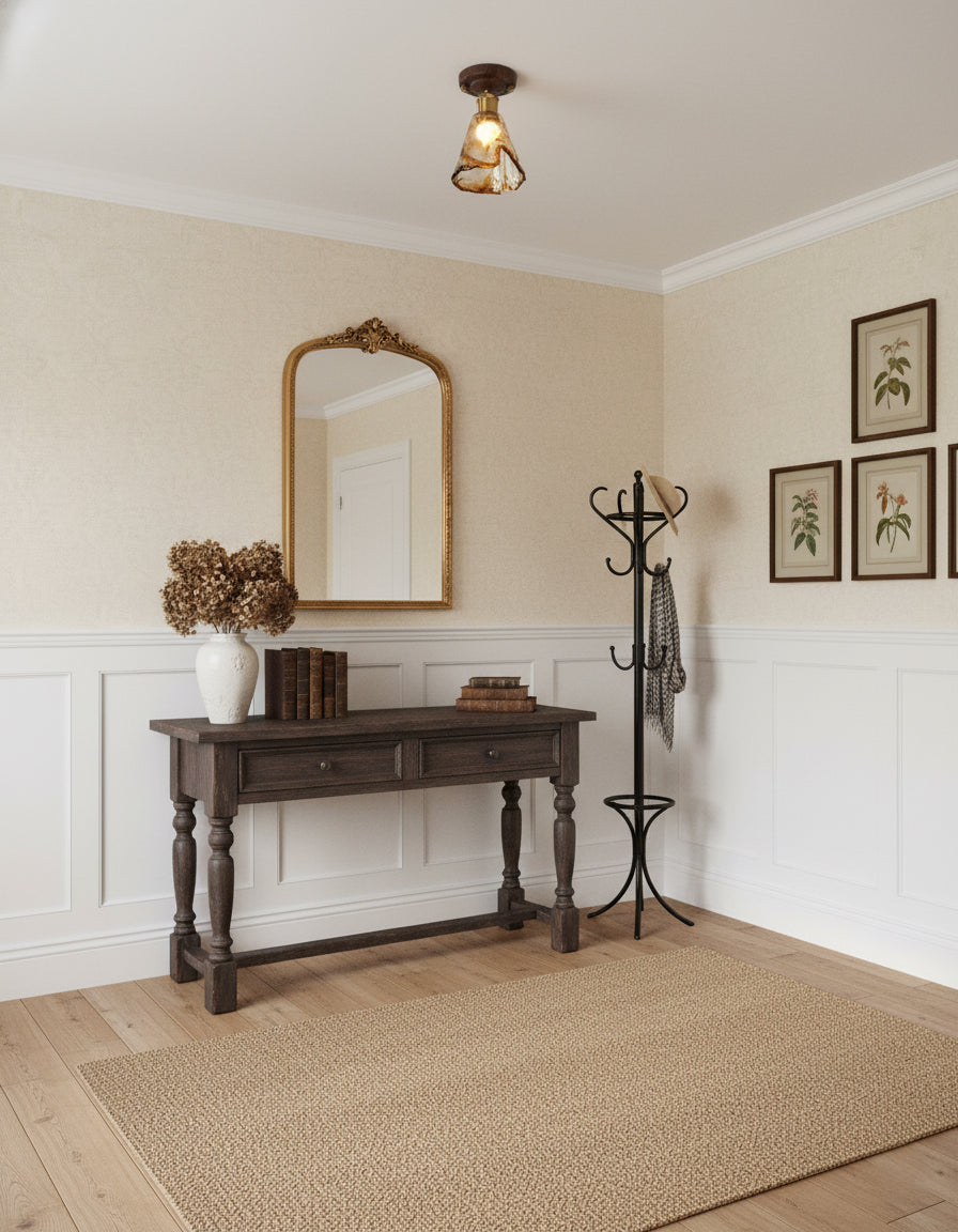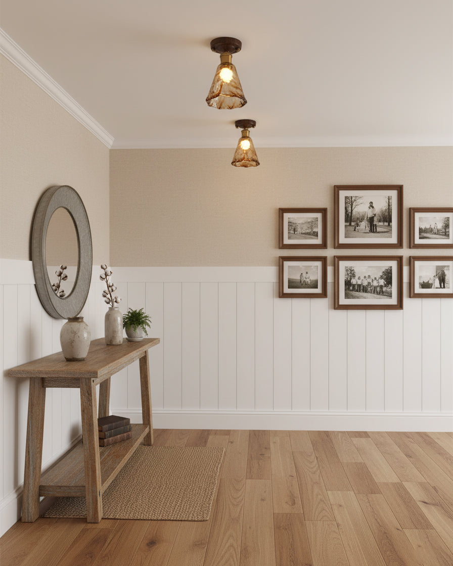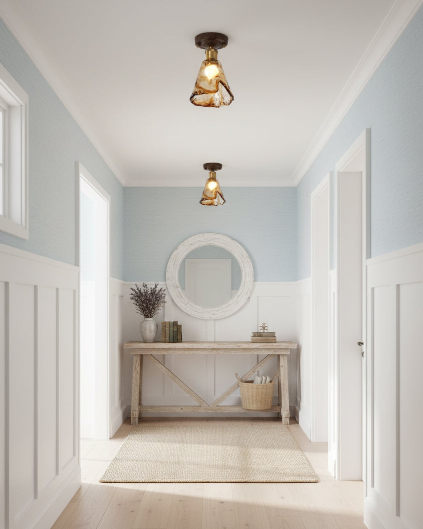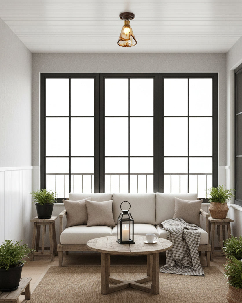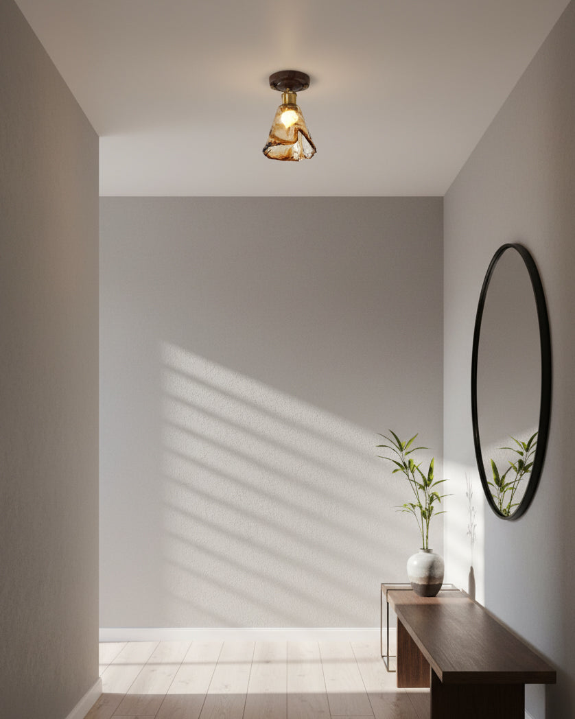 The Nalia Amber Ceiling Light from Docos combines rustic charm with modern elegance, featuring an amber-tinted glass shade with a molten texture, Metal accents, and a rich wooden base. Perfect for creating a warm, sophisticated glow in any room, this stylish fixture adds a refined touch to your space.