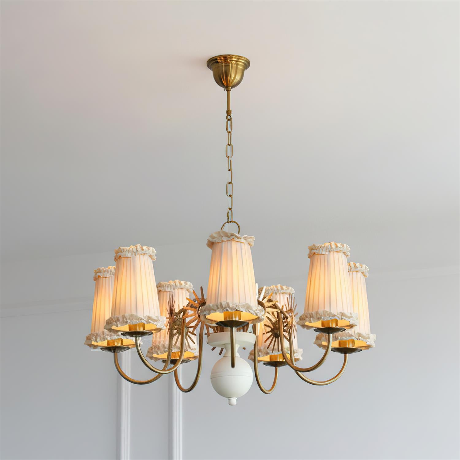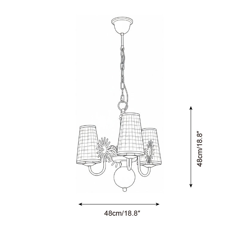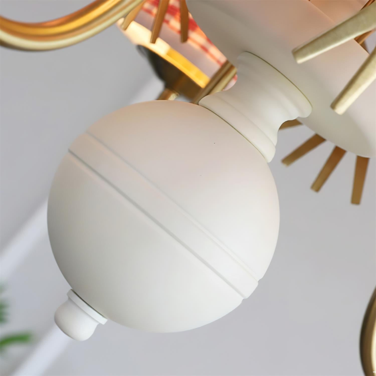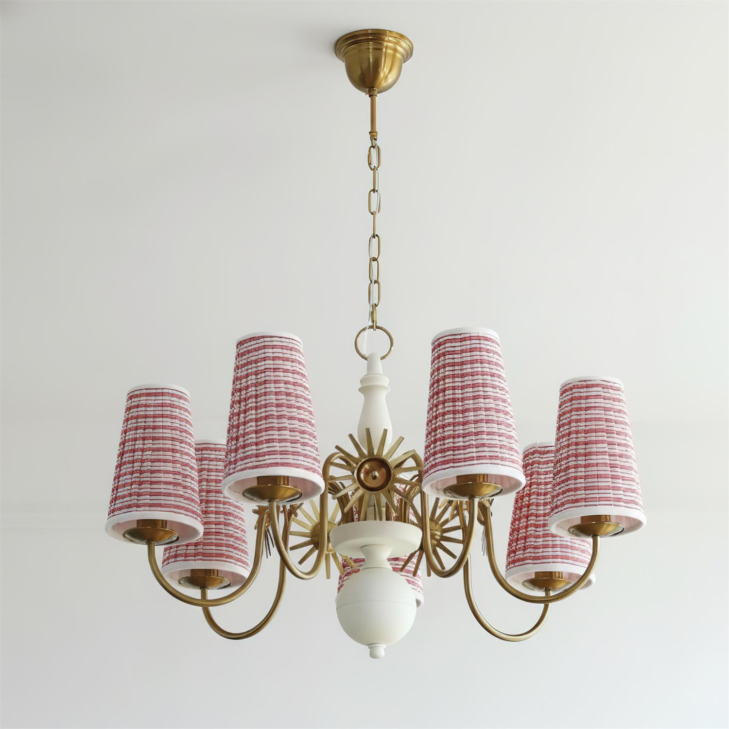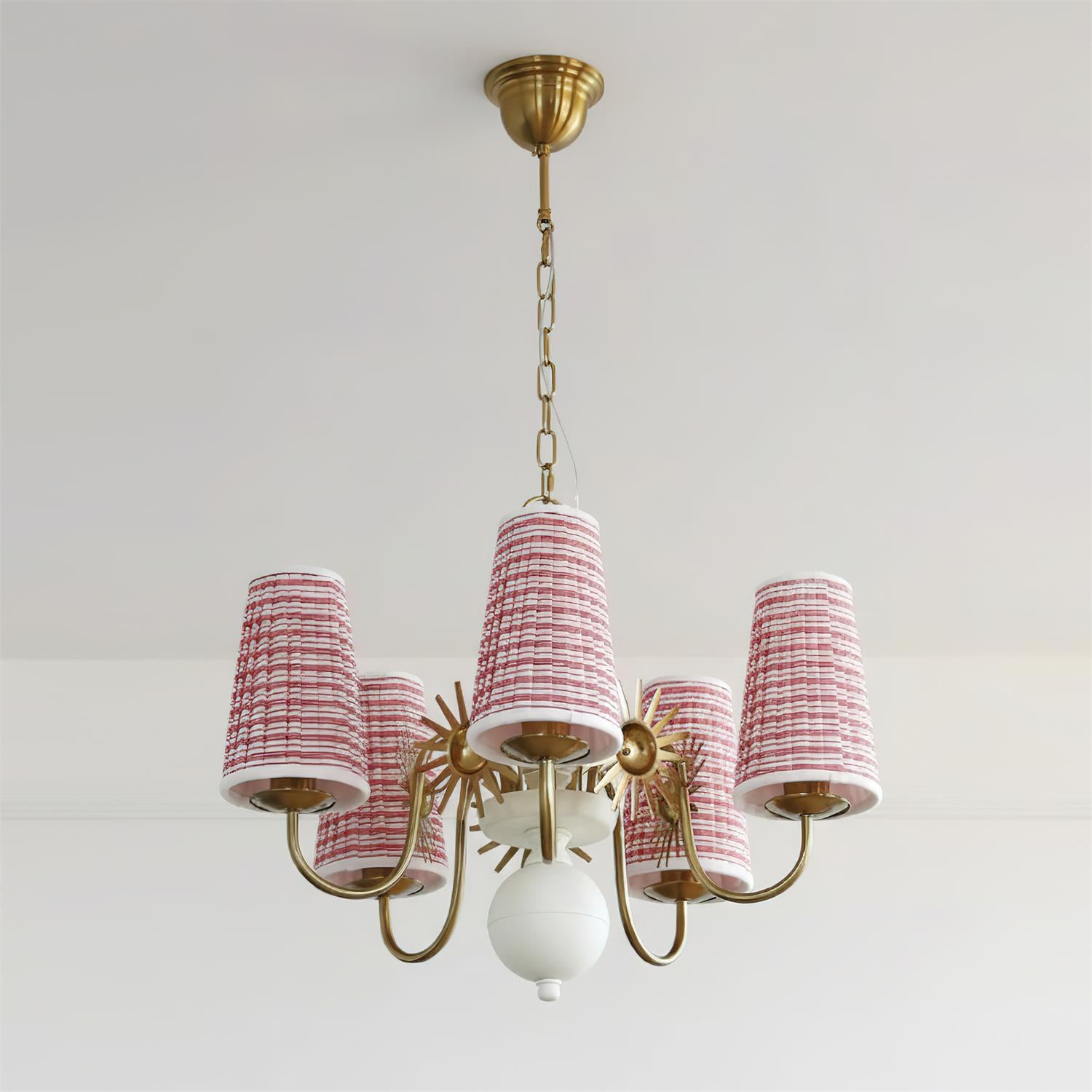 The Ravina Chandelier captures a playful yet elegant spirit, blending nostalgic charm with modern craftsmanship. Its brass arms extend gracefully from a sculpted white core, adorned with handwoven red-and-white fabric shades that radiate warmth and personality. The subtle contrast of textures and tones brings a touch of vintage whimsy to contemporary interiors, making Ravina not just a source of light, but a statement of joyful sophistication.
