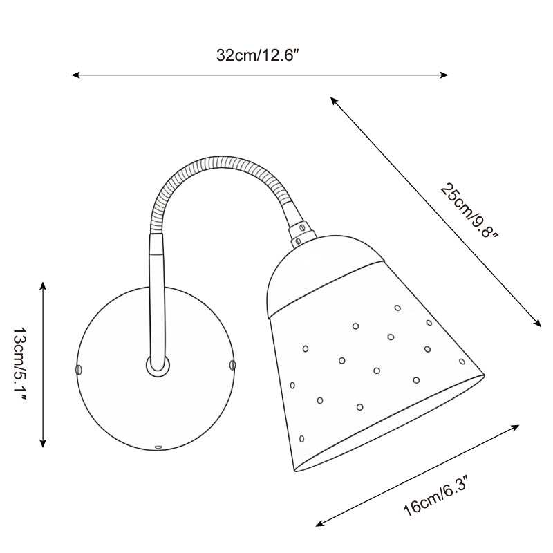 The Filo Wall Lamp brings a playful, mid-century spirit to the wall—bold color, clean geometry, and a slender gooseneck that lets the shade float exactly where you need it. A glossy round backplate anchors the design, while the two-tone metal shade casts a focused, cozy pool of light; tiny pin-perforations add a soft sprinkle of glow for extra atmosphere.