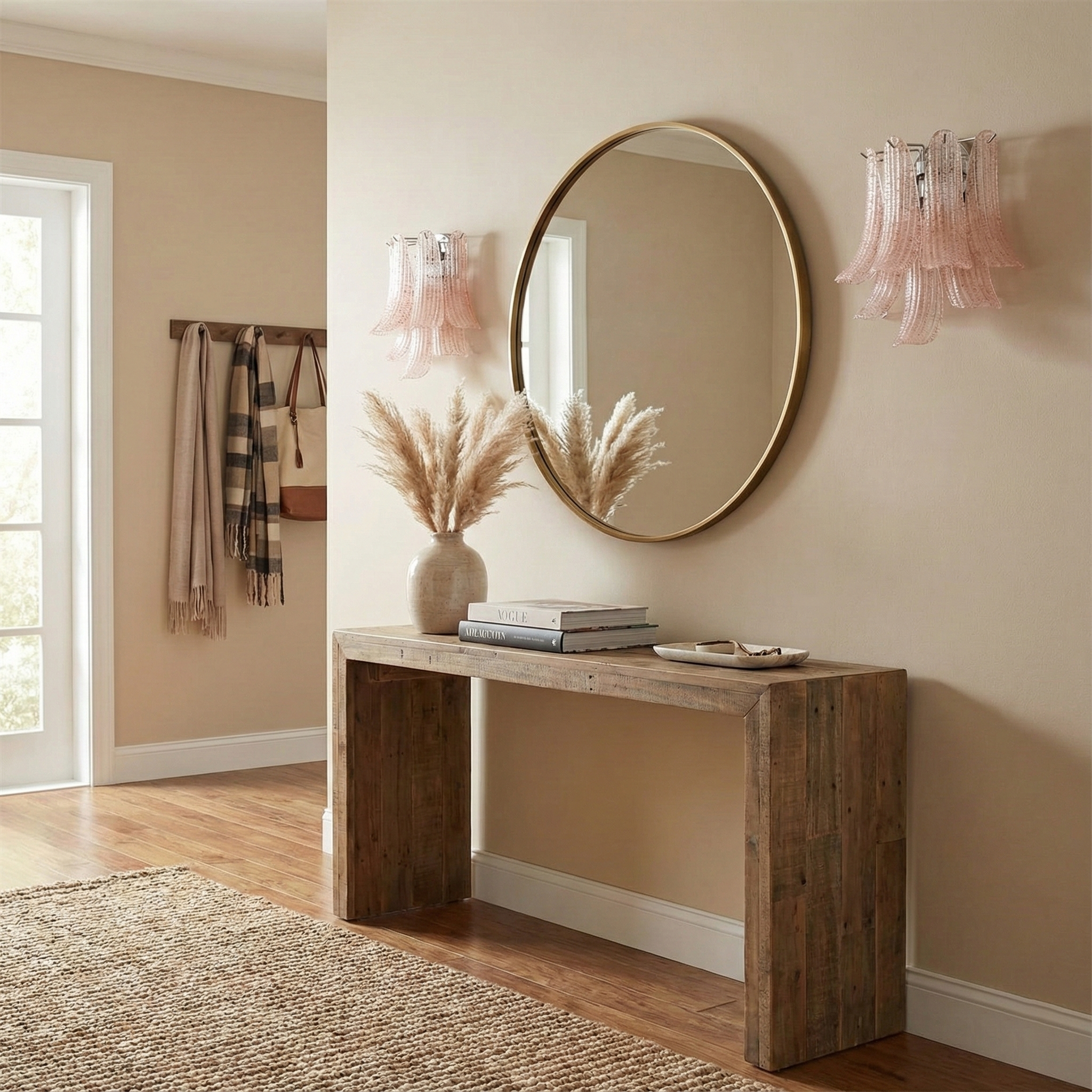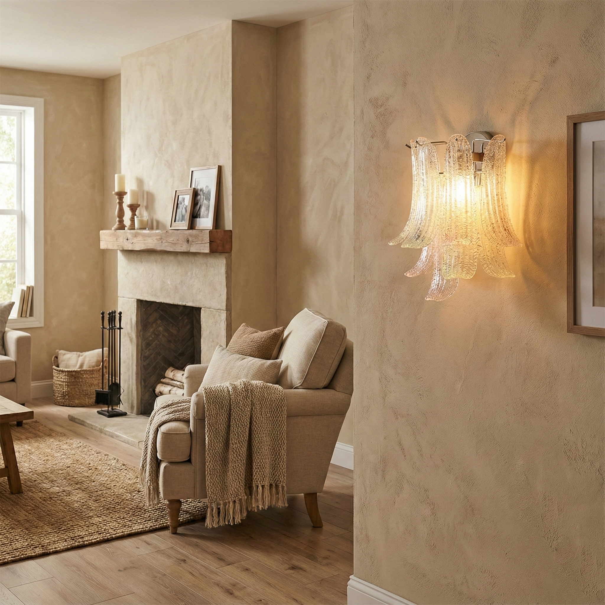 The Nason Wall Lamp blends Venetian-inspired craftsmanship with a playful yet sophisticated form. Each petal-like glass piece is hand-textured, creating a layered composition that diffuses light in soft, radiant waves. Ideal for those who appreciate artful lighting with a touch of vintage glamour.