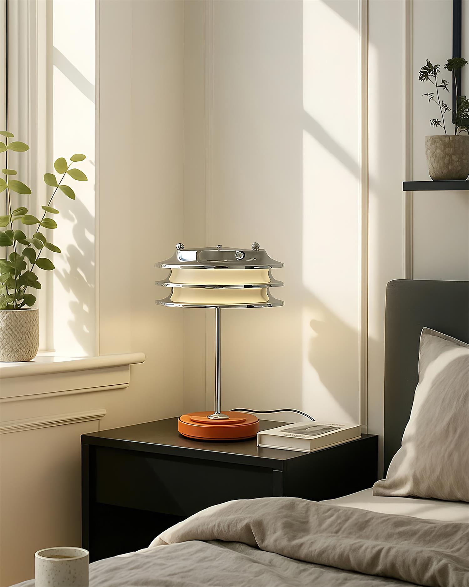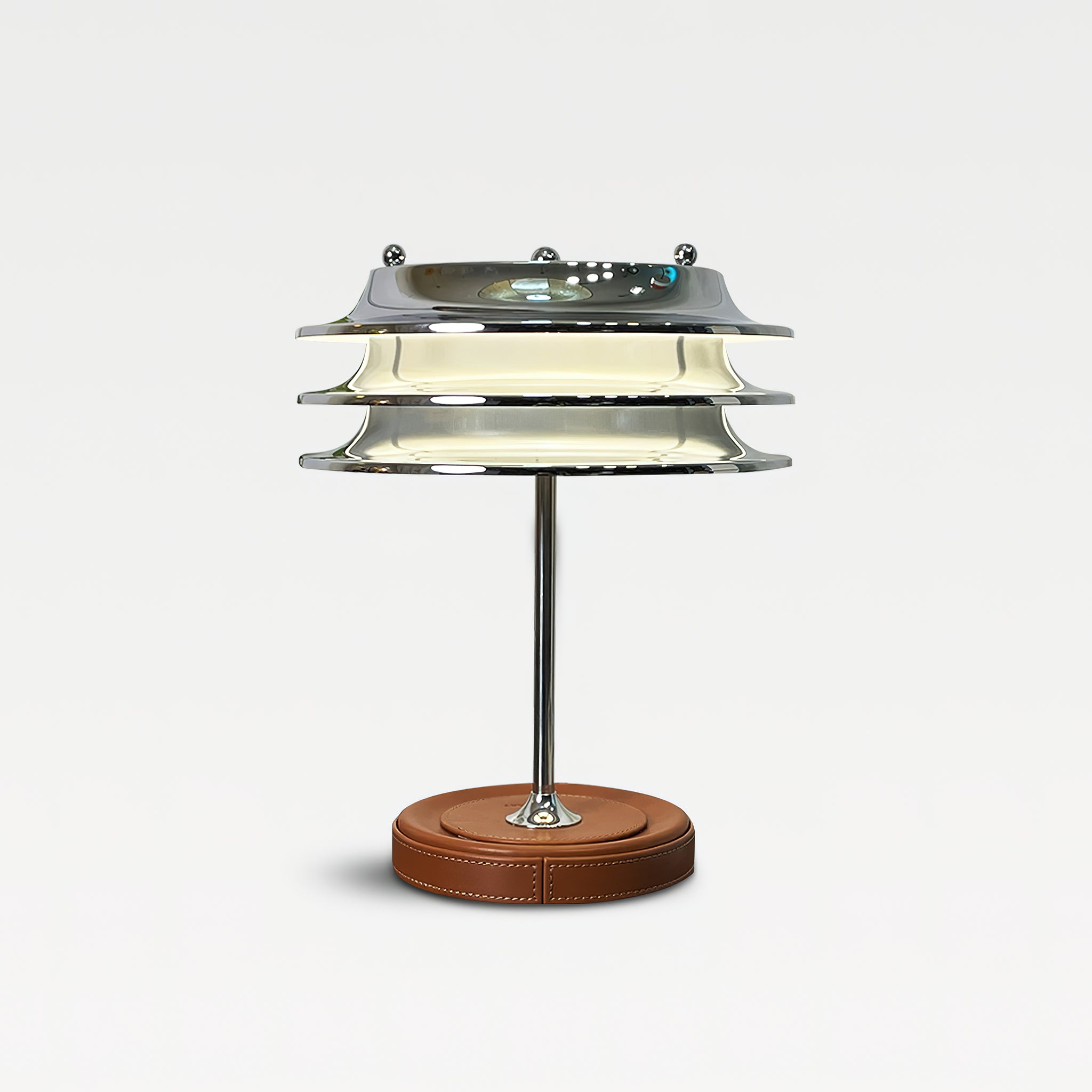 The Veltrix Table Lamp is a striking blend of futuristic form and refined craftsmanship, designed to command attention in any setting. Its layered chrome shade creates a sleek, architectural silhouette, while the soft diffusion of light adds warmth to its bold metallic finish. Balanced on a slender stem with a stitched leather base, it combines industrial edge with artisanal detail.