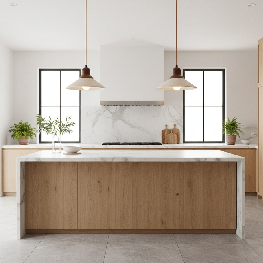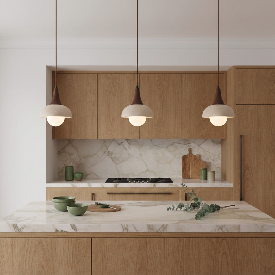 The Modiva Pendant Lamp brings together natural elegance and modern simplicity through its harmonious blend of travertine stone shades and warm wooden accents. Each pendant is uniquely shaped, creating a dynamic yet balanced composition when grouped together, while the smooth globe lights soften the overall aesthetic with a gentle glow. Perfect for kitchens, dining areas, or creative studios, the Modiva adds character and refinement to any space, celebrating craftsmanship and the timeless beauty of organic materials.