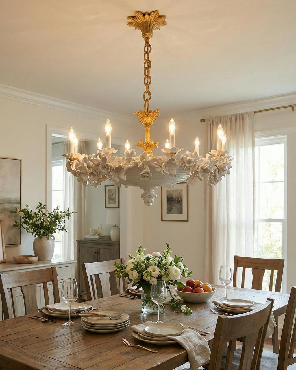 What I appreciate most is how balanced the design feels. The gold adds a classic accent, while the white floral structure feels airy and bright. It ties together our traditional-style room beautifully.