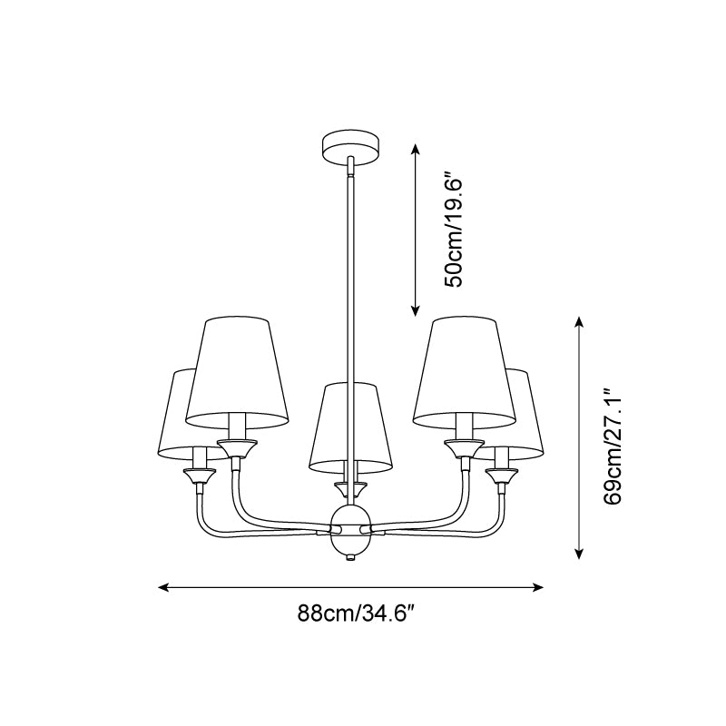 The design of this light fixture is inspired by classic and transitional styles, emphasizing simplicity and balanced symmetry in its form. The evenly spaced arms and traditional tapered shades contribute to a harmonious aesthetic, while the matte black finish introduces a contemporary feel. Eschewing excessive detail, the design focuses on clean lines and functional elegance, resulting in a versatile lighting solution intended to complement various interior decors with its timeless appeal.