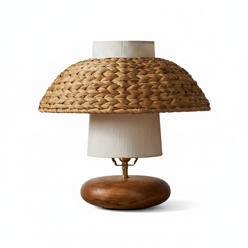 The Earthbound Table Lamp exudes a harmonious blend of nature and craftsmanship, featuring a beautifully woven rattan shade that captures the essence of organic textures. Its minimalist design is complemented by a warm wooden base, offering a grounded, earthy aesthetic that is both timeless and modern. The light, filtered through the intricate weave, creates a soft, ambient glow, perfect for adding warmth and character to any space.