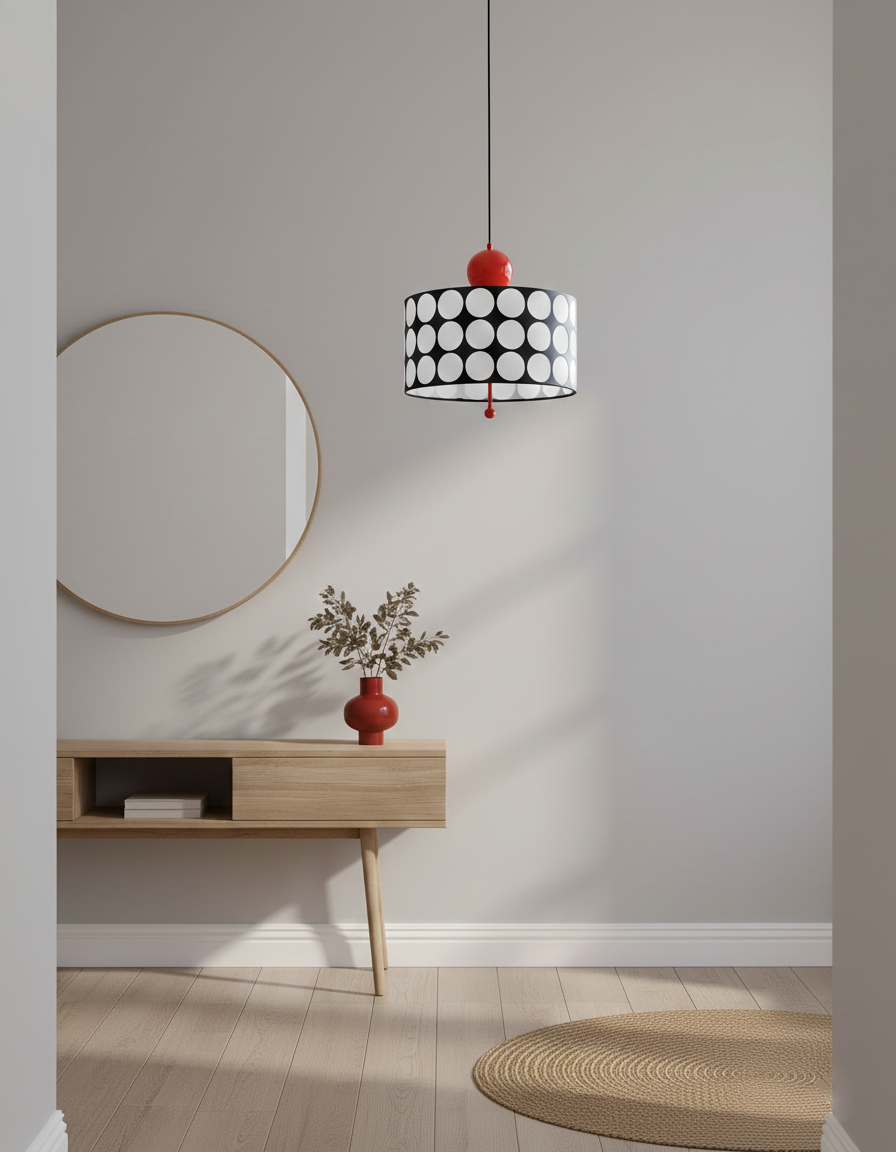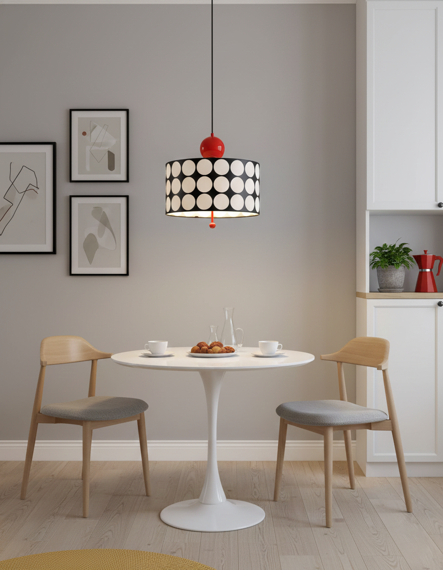 The Dottie Lattice Pendant Lamp a piece of French vintage elegance, reimagined as a stunning dining room pendant light. Its timeless black and white checkered design, accentuated with bold red accents, adds a touch of classic charm to your dining space. This lampshade effortlessly captures the essence of a bygone era while infusing your room with a playful and chic ambiance.