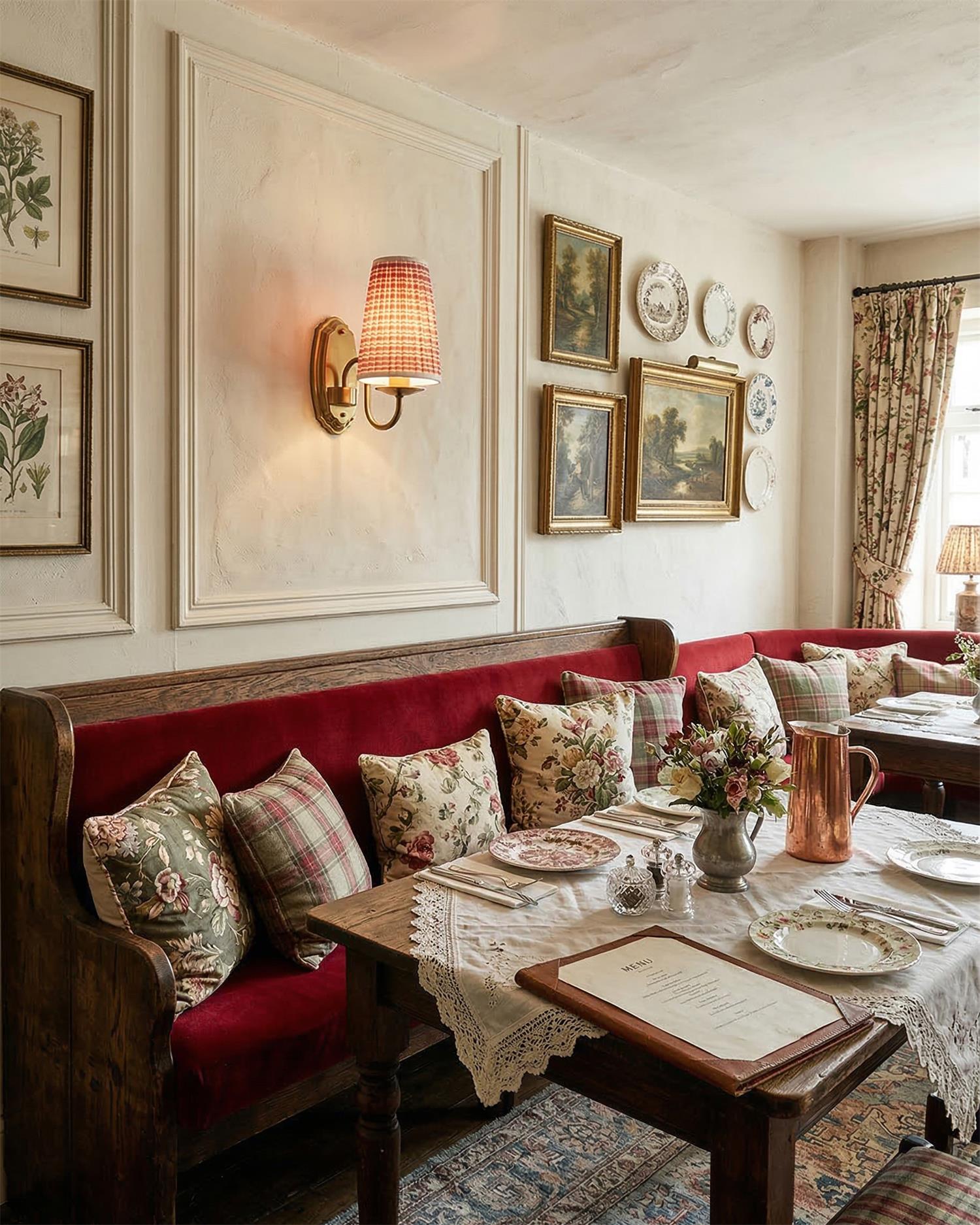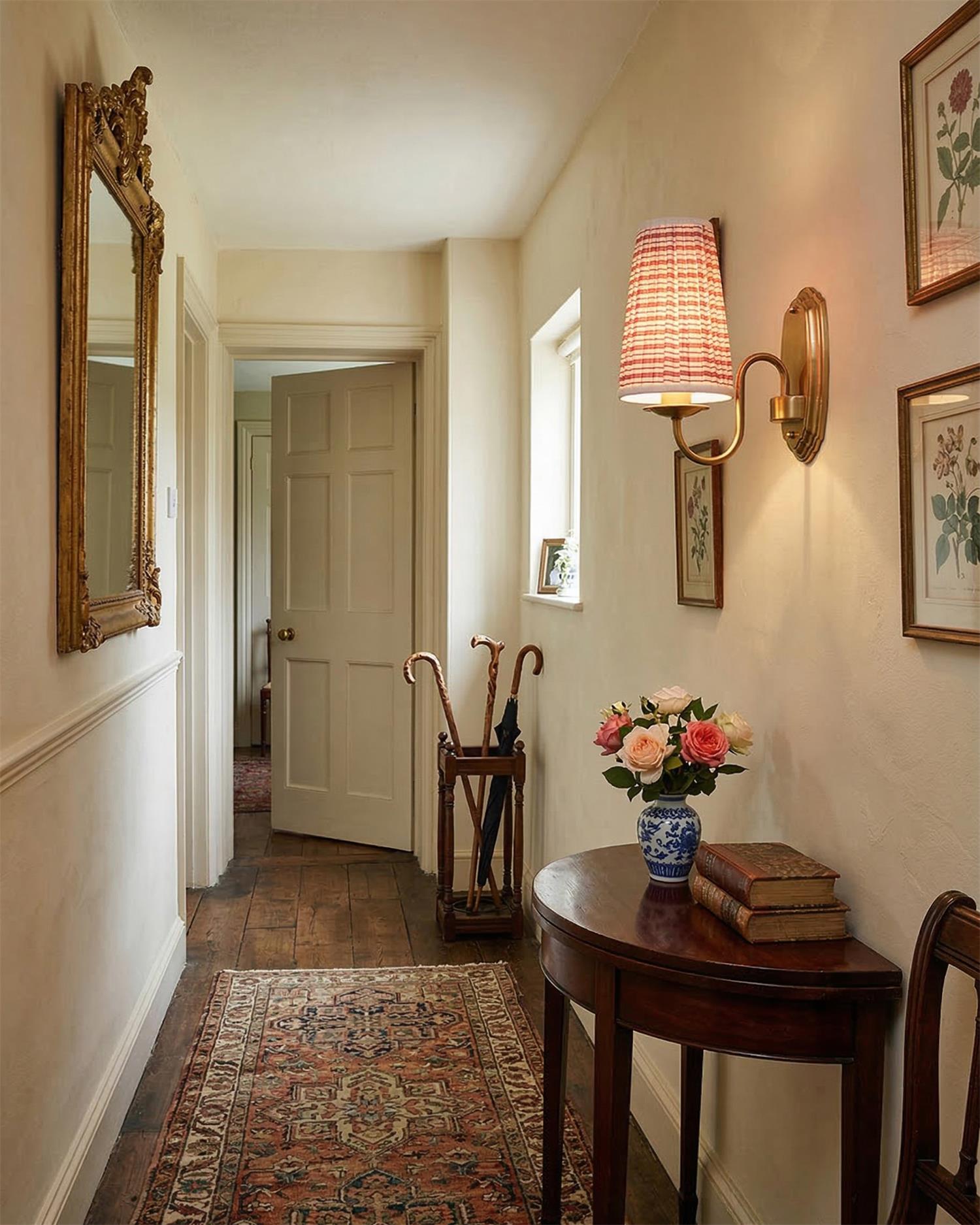 The Aveline Wall Lamp embodies timeless elegance with its beautifully woven red and white fabric shade, creating a delicate play of light and shadow. The soft, textured pattern contrasts gracefully with the polished Metal arm and backplate, which lend the fixture a refined, vintage charm. Perfect for adding a cozy yet sophisticated touch to your hallway, bedroom, or living space, this wall lamp brings a warm and inviting glow, blending classical style with modern design.