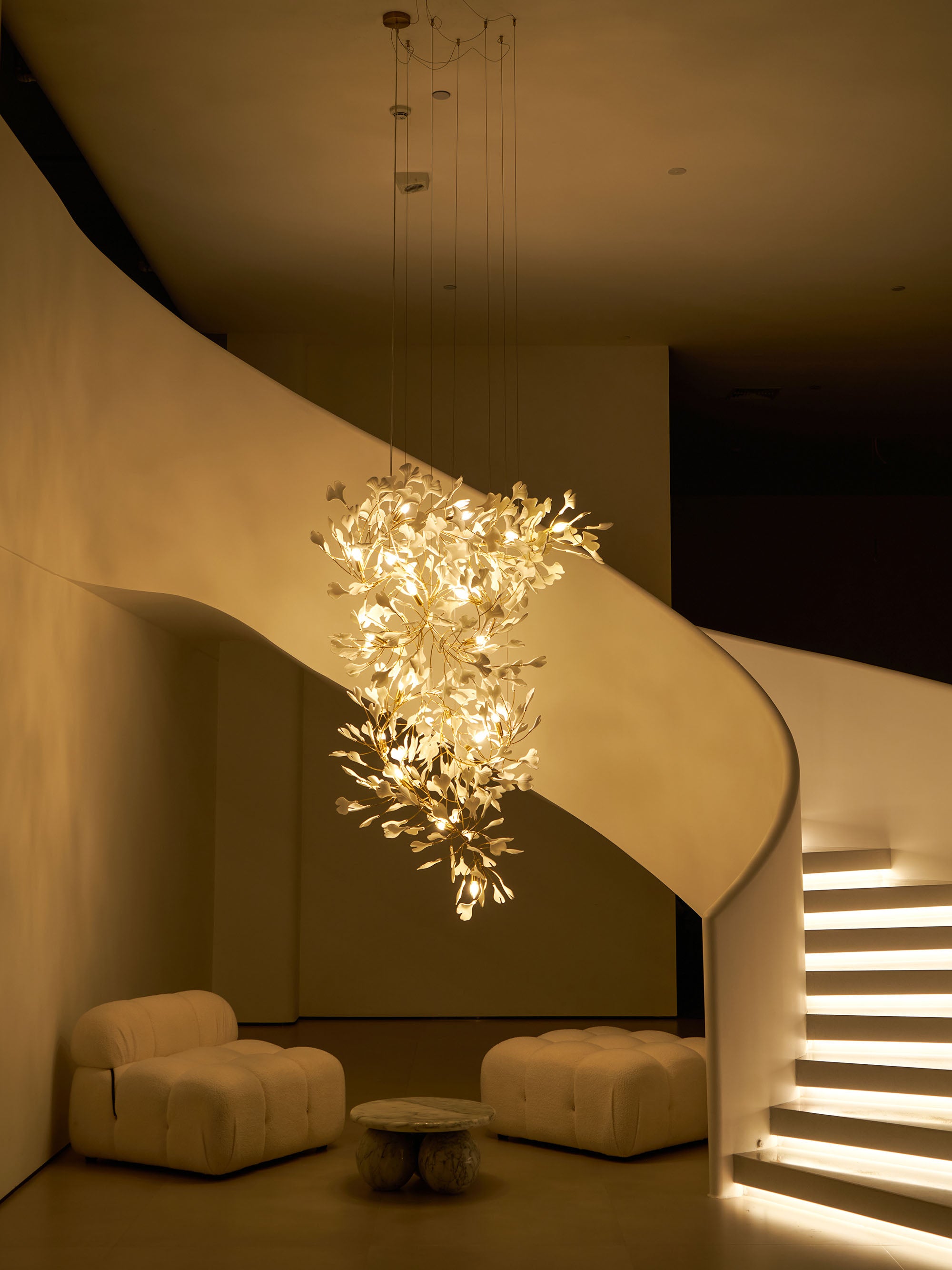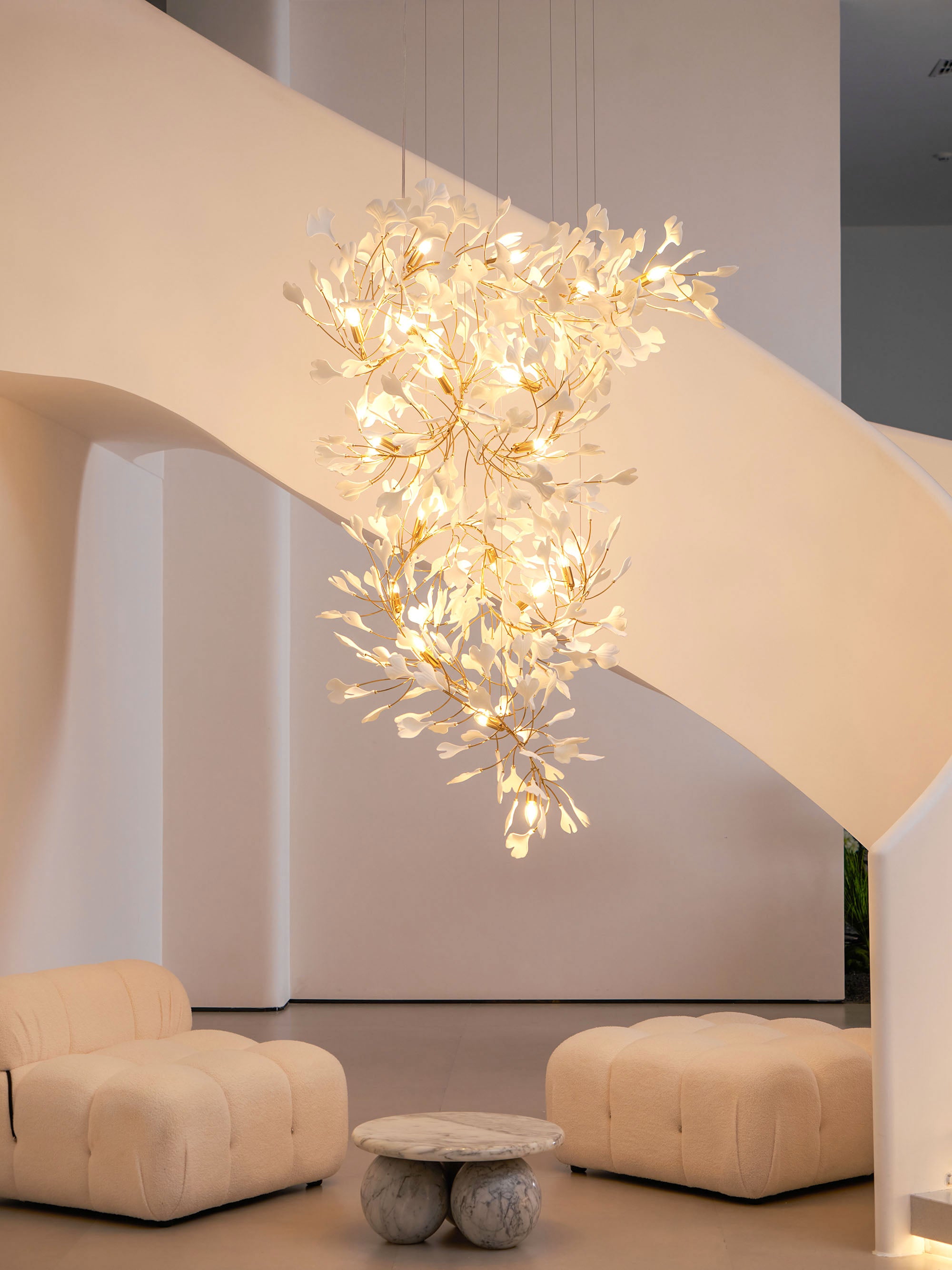 The Gingko Chandelier F Style Inspired by the natural beauty of ginkgo leaves and branches, this pendant lamp seamlessly blends the beauty of nature into interior decor. Each ginkgo leaf and branch shape seems to radiate the harmonious beauty of the outdoors indoors.