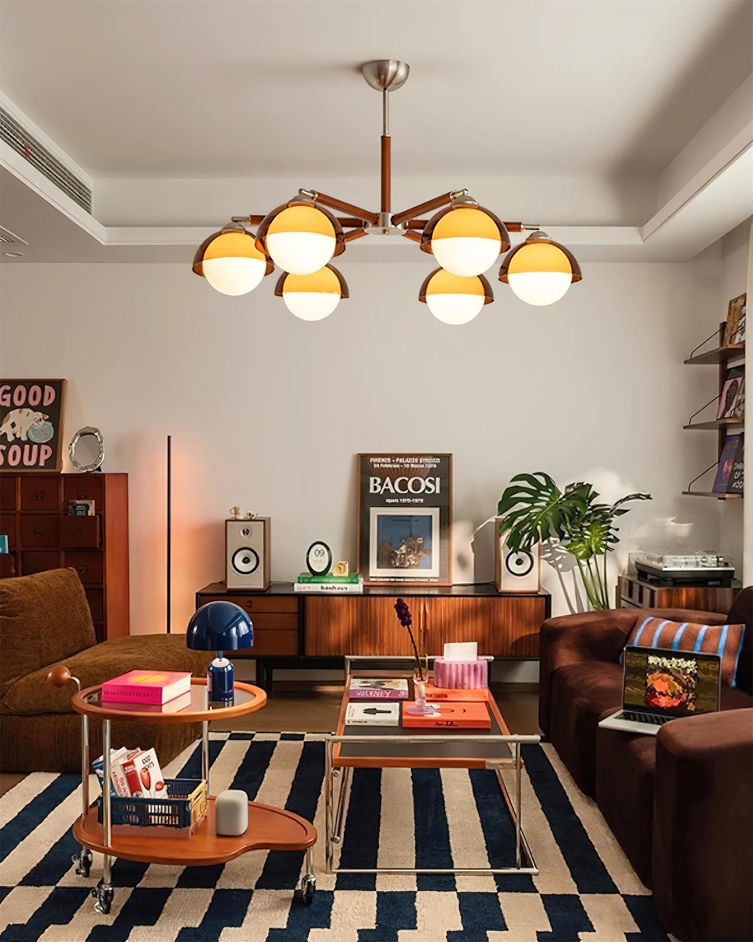 The Belmont Chandelier beautifully blends vintage charm with modern design, featuring spherical Acrylic shades paired with warm wooden accents. The light filters through in soft layers of amber and white, creating a cozy yet elegant atmosphere—like capturing the glow of sunset indoors. With its rhythmic, refined form, this chandelier is perfect for illuminating living rooms, dining areas, or studies, adding a touch of timeless sophistication and transforming any space into a statement of light and style.