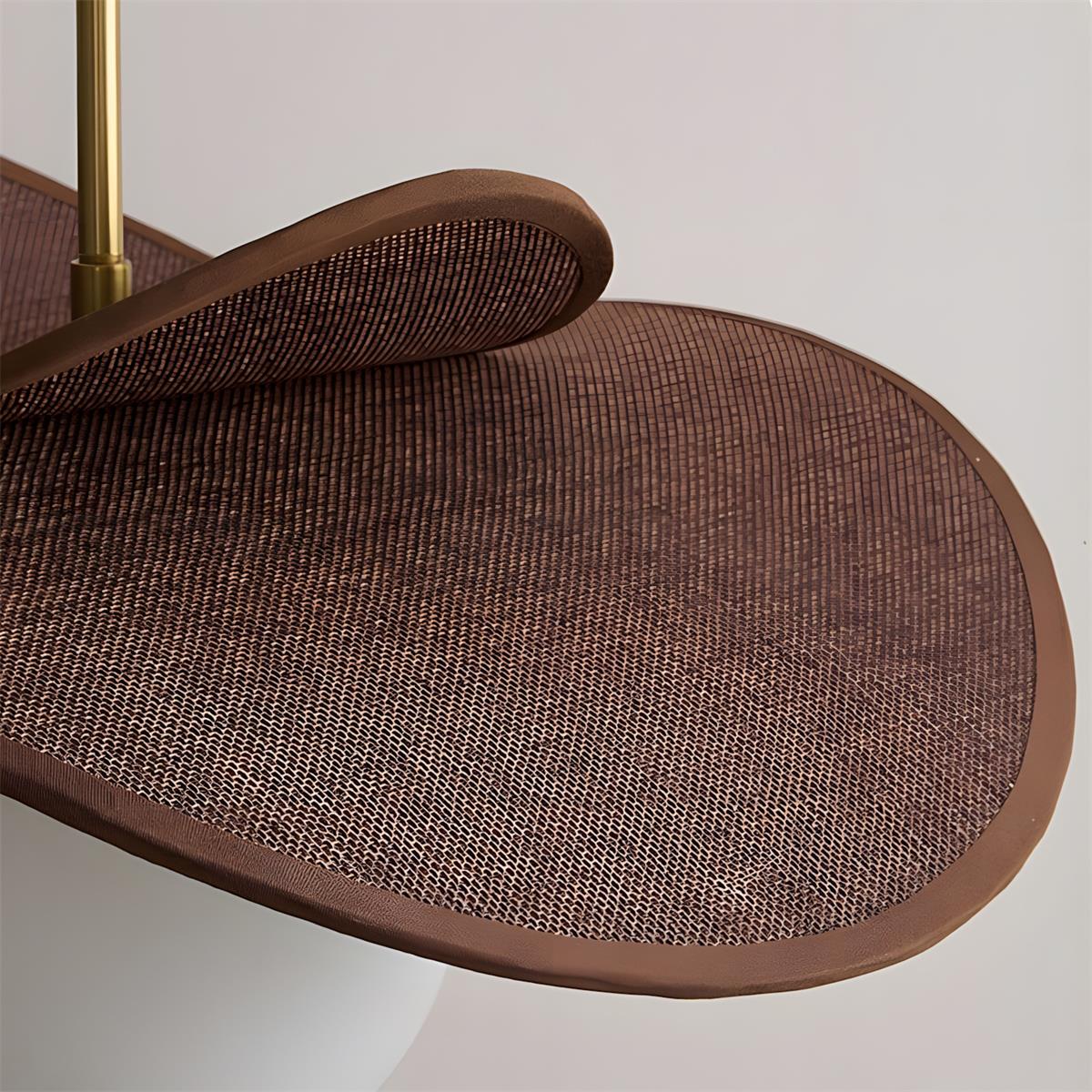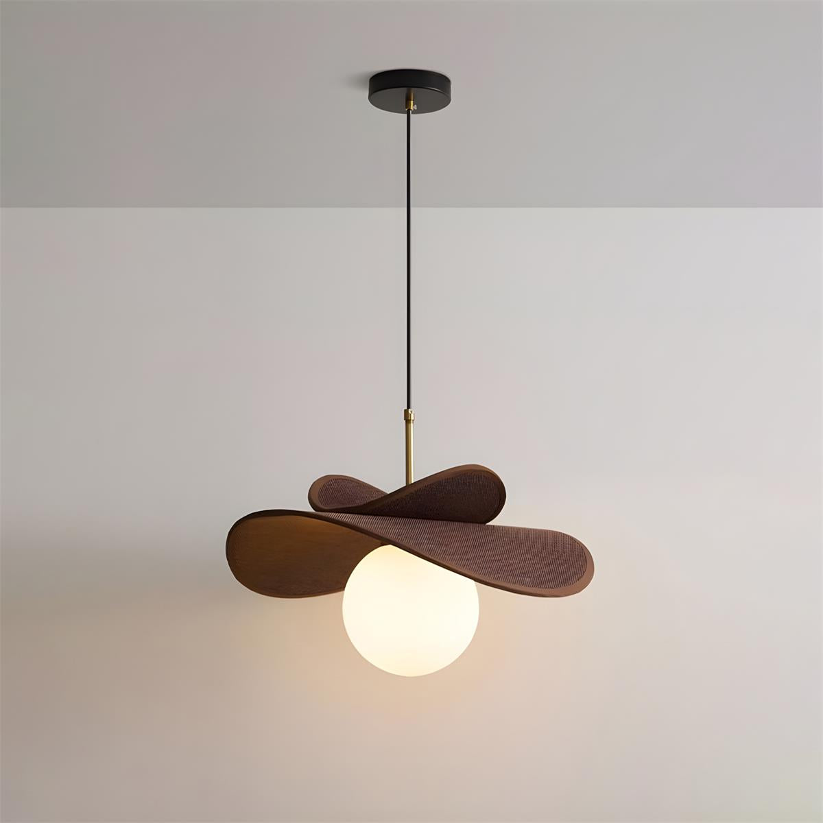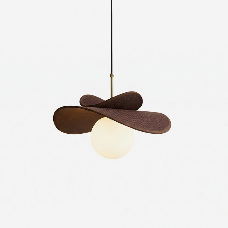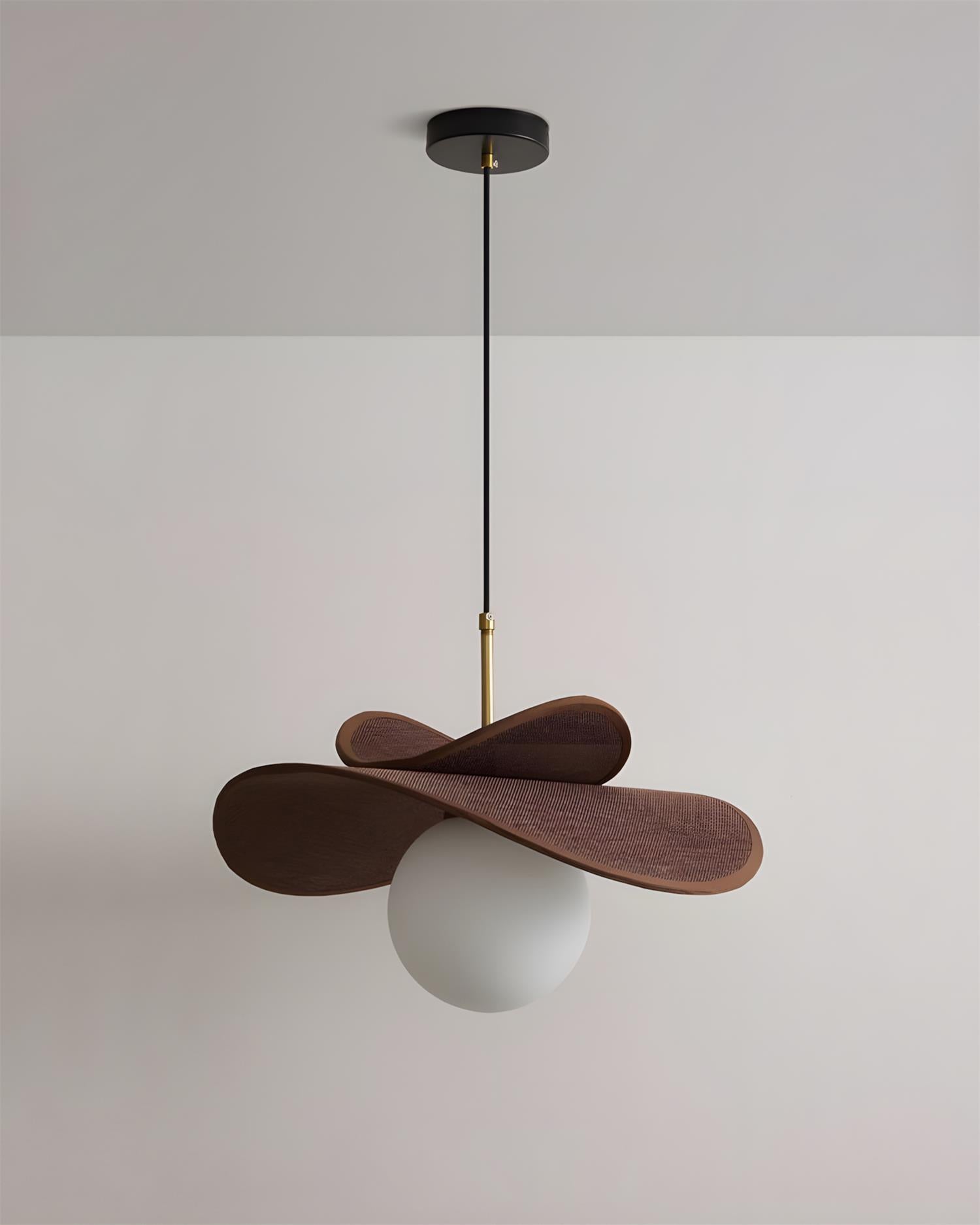 The Caluma Pendant Lamp presents a sculptural, nature-inspired silhouette that feels both modern and warmly organic, with layered Raffia panels unfolding like petals or wings around a softly glowing opal glass core. Its flowing form creates a sense of movement and balance, while the contrast between the dark canopy, brushed metal detail, and rich walnut-like finish adds depth and sophistication to the design.