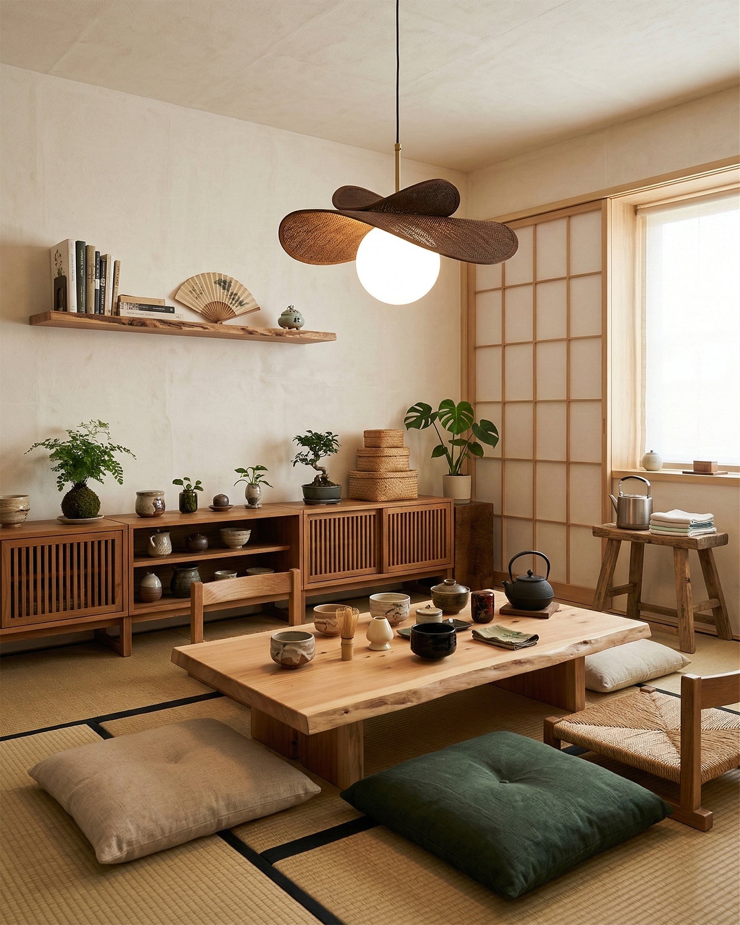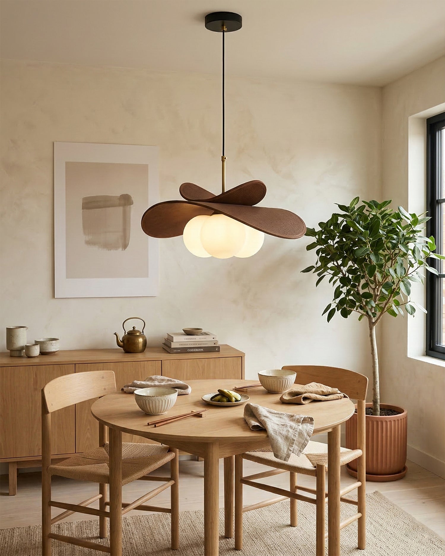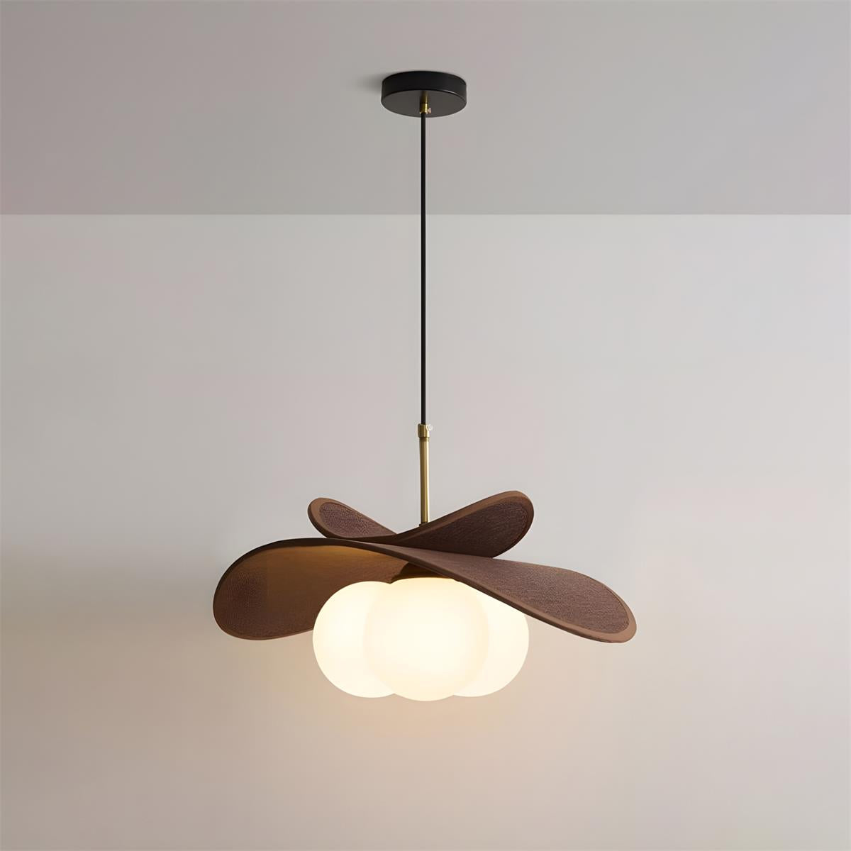 The Caluma Pendant Lamp presents a sculptural, nature-inspired silhouette that feels both modern and warmly organic, with layered Raffia panels unfolding like petals or wings around a softly glowing opal glass core. Its flowing form creates a sense of movement and balance, while the contrast between the dark canopy, brushed metal detail, and rich walnut-like finish adds depth and sophistication to the design.