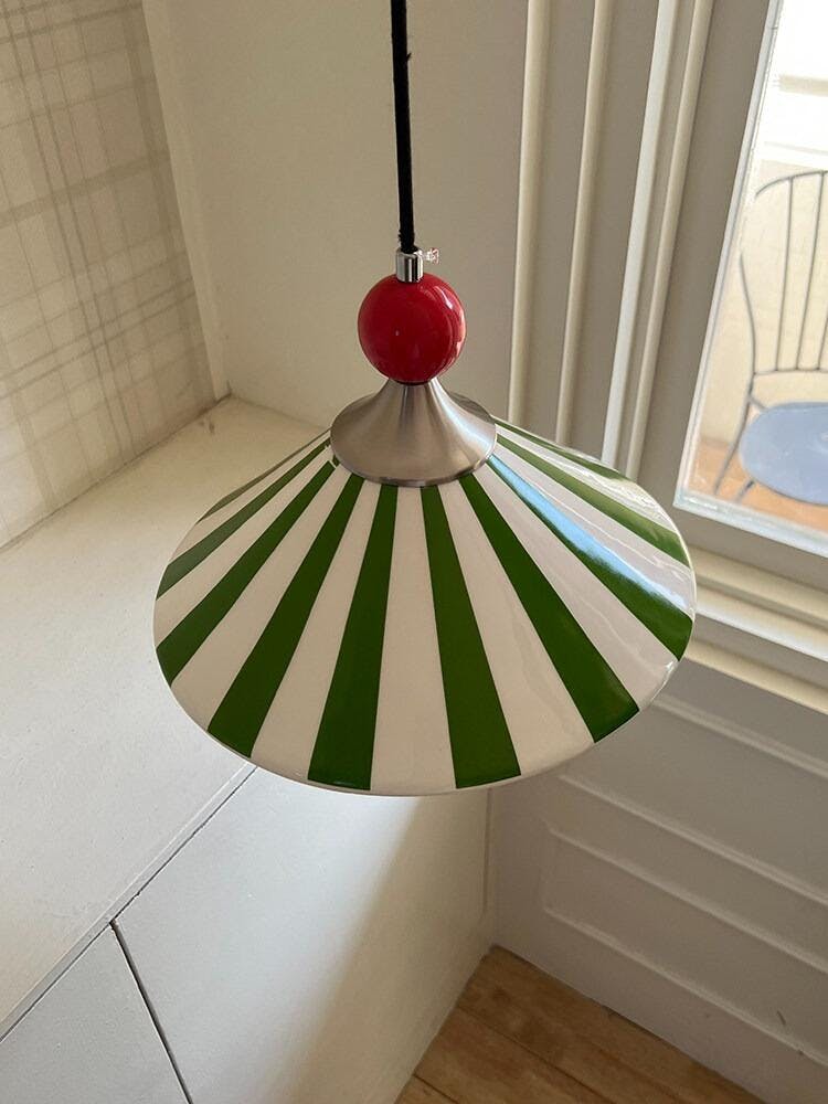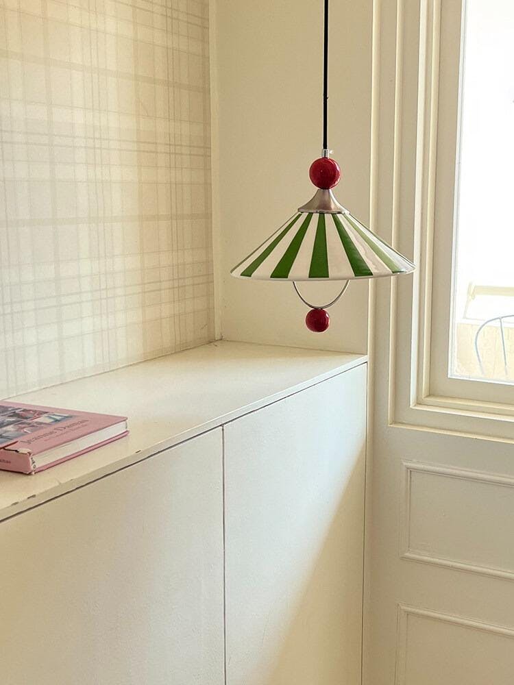 The JollyTwirl Pendant Lamp brings a playful burst of color and charm to any space, blending bold stripes with circus-inspired whimsy. Its wide conical shade, accented by glossy red spheres and clean metal detailing, creates a lively silhouette that feels both retro and delightfully modern. Designed to spark joy and invite conversation, JollyTwirl casts a bright, cheerful glow—perfect for kids’ rooms, creative studios, dining corners, or anywhere that could use a touch of upbeat personality and artistic flair.