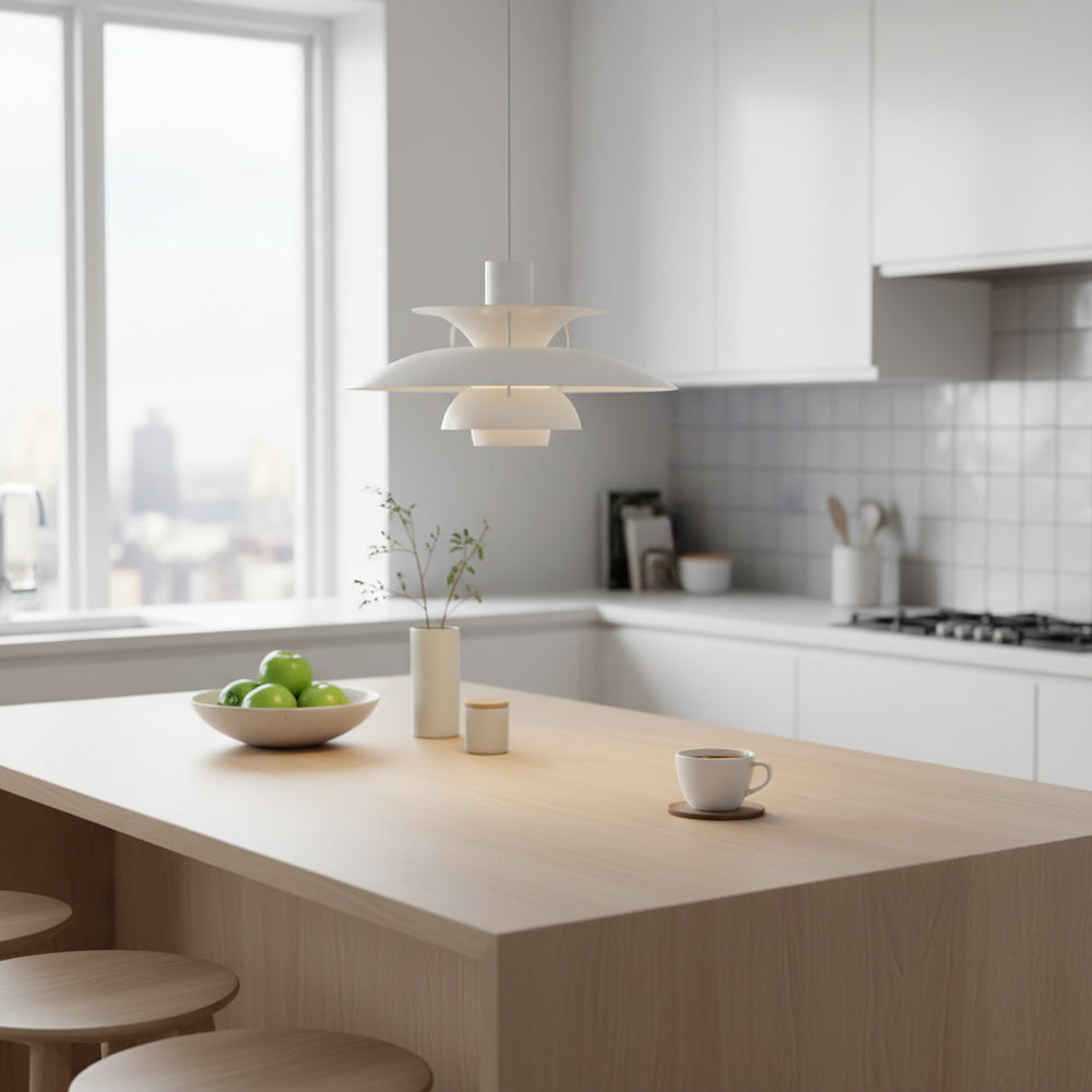 The PH 5 Pendant Lamp features a layered aluminum shade designed to distribute light softly and evenly. Its structure reduces glare while creating balanced illumination, making it a practical choice for dining areas, living spaces, and work environments.