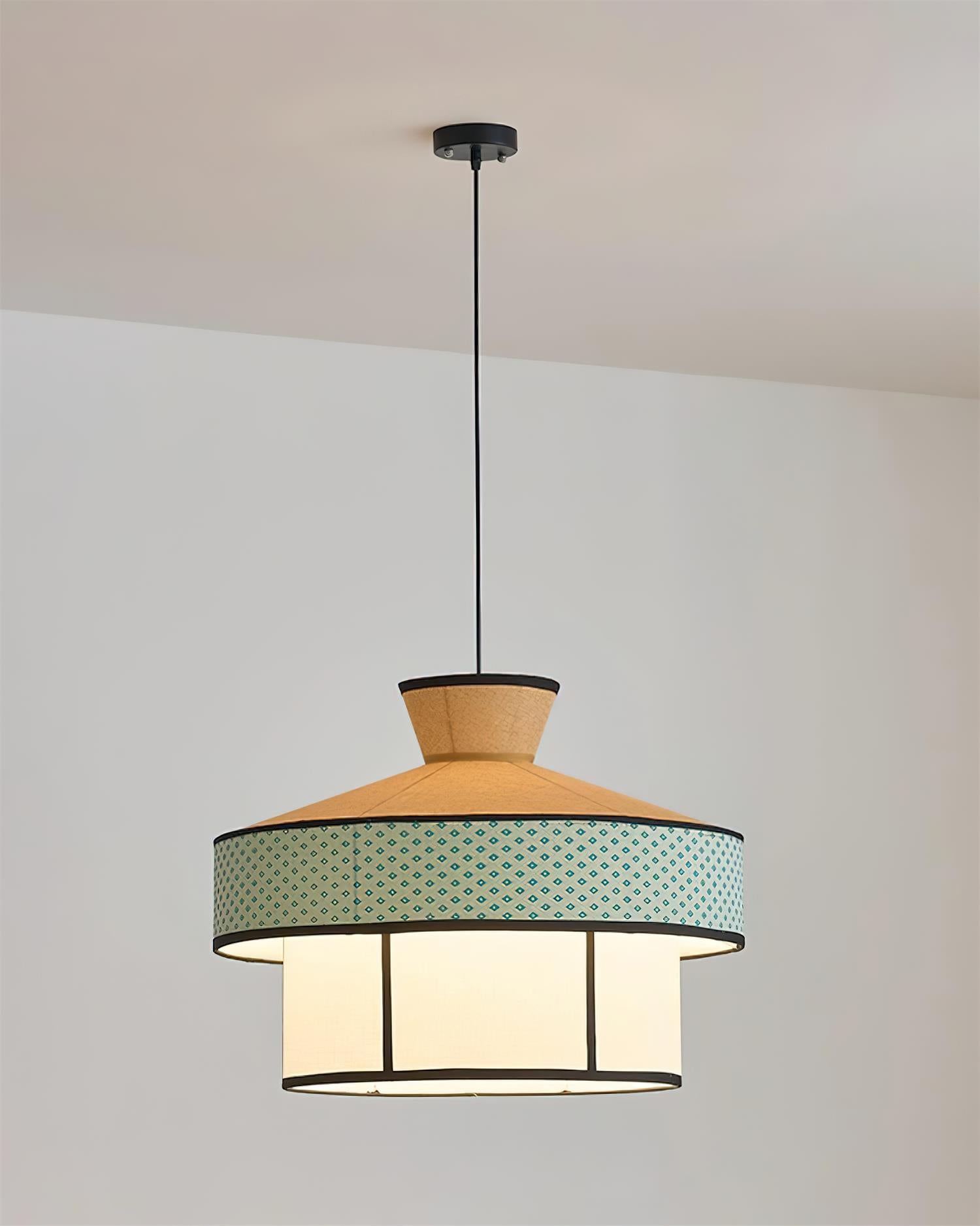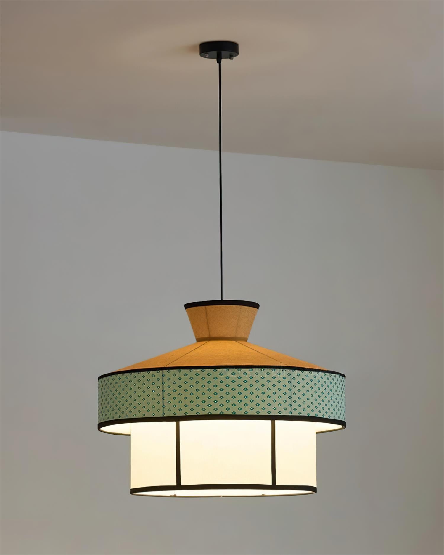 The Kyora Pendant Lamp captures a refined balance between tradition and modernity, drawing inspiration from Japanese architectural forms. Its layered silhouette, featuring a warm fabric crown, a patterned middle band, and a softly diffused inner shade, creates depth and harmony in both design and illumination. With clean black outlines framing the structure, it feels like a contemporary reinterpretation of classic lanterns—perfect for dining spaces, living rooms, or creative studios seeking a touch of cultural elegance with a modern twist.