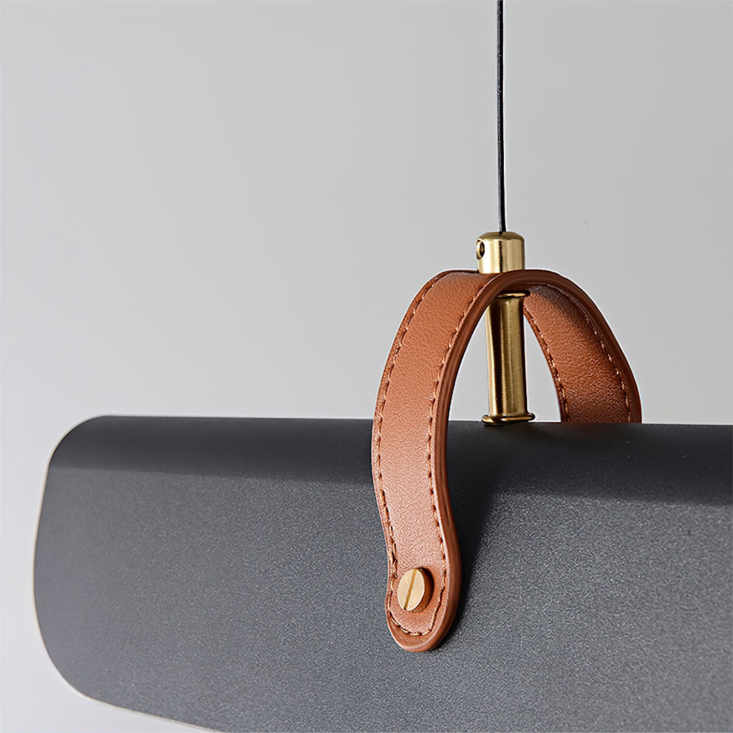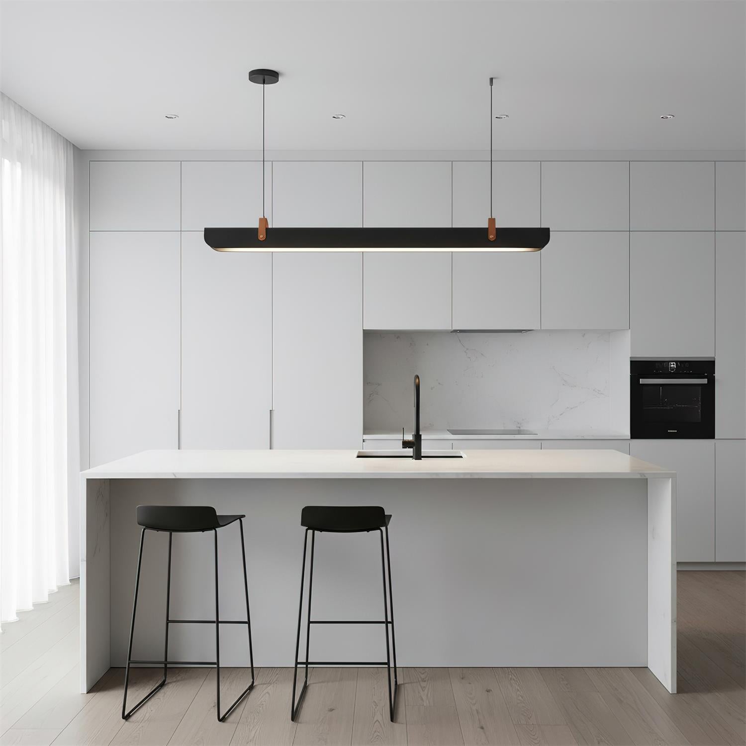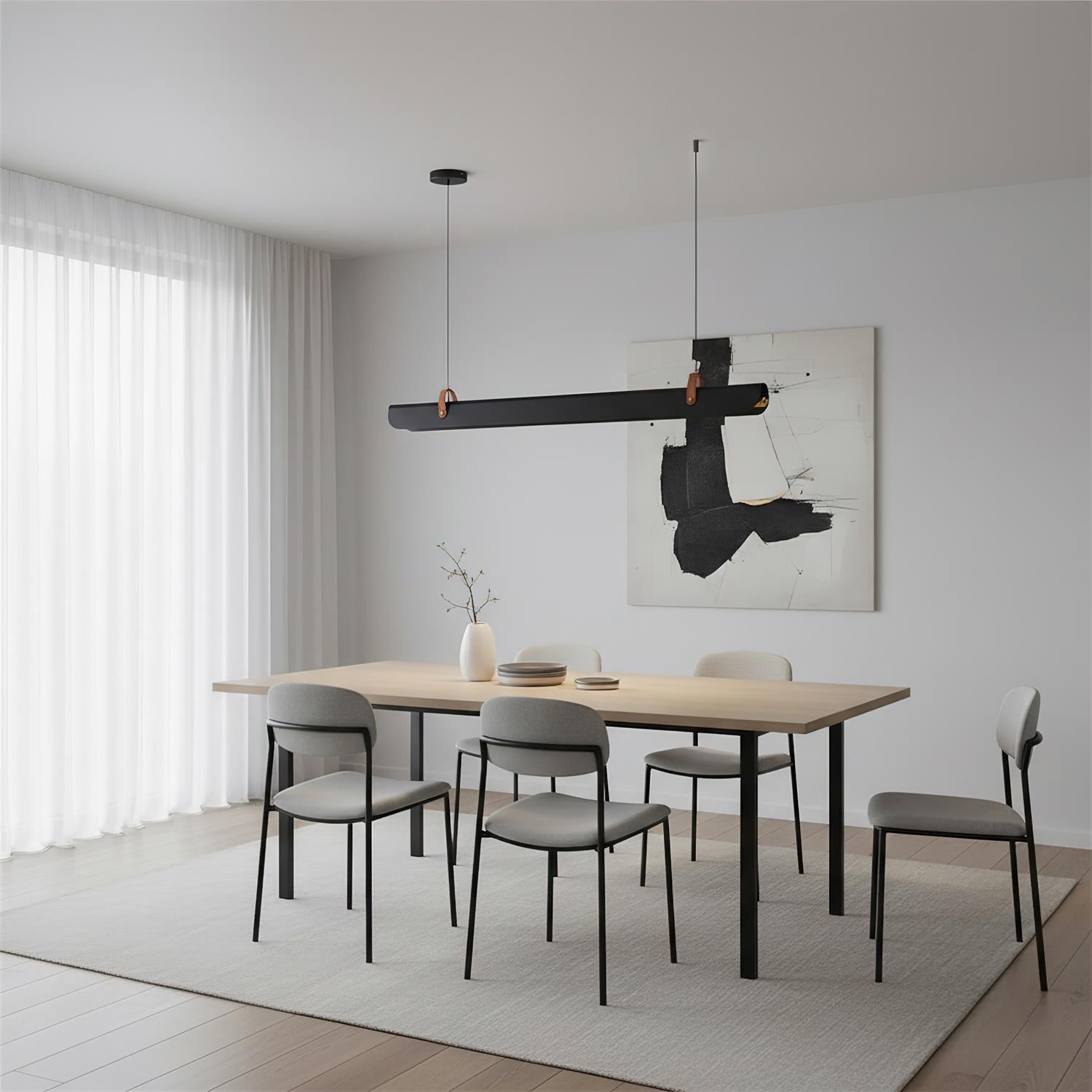 The Bandolier Line Chandelier combines precision engineering with refined material balance. Its elongated form, wrapped in a sleek black finish and suspended by warm leather straps, evokes a sense of modern restraint and craftsmanship. The seamless linear light casts an even, ambient glow—perfect for dining tables, workspaces, or minimalist interiors where subtle details define sophistication.