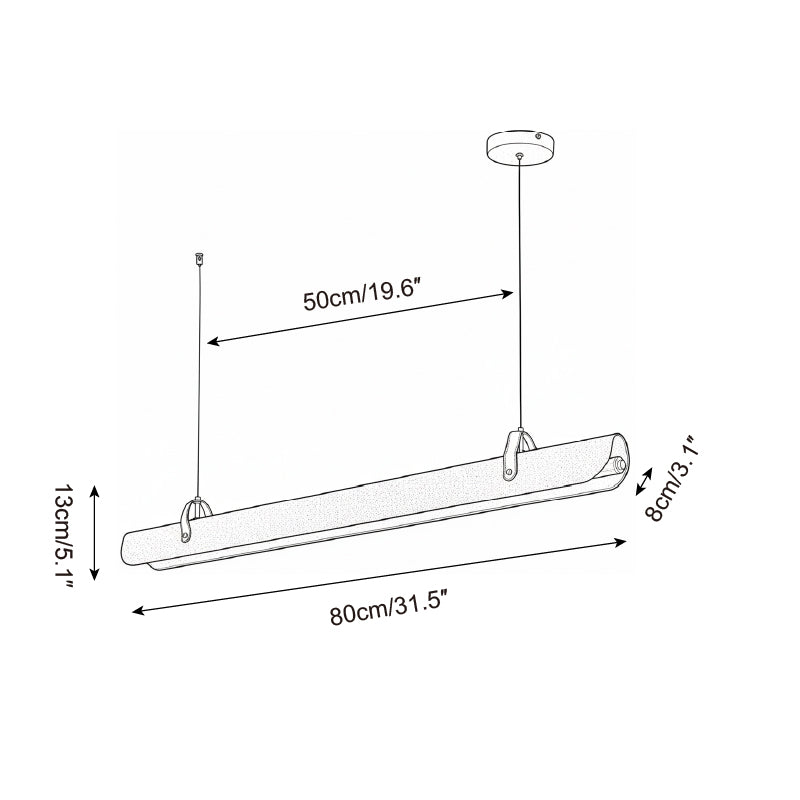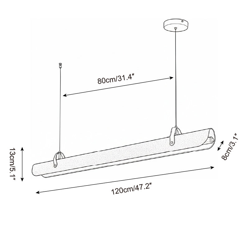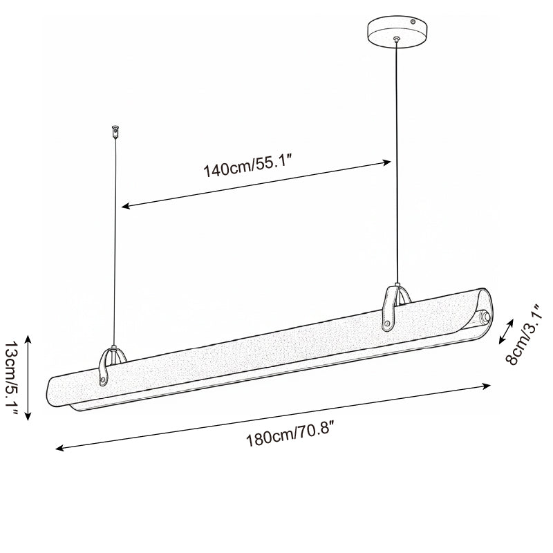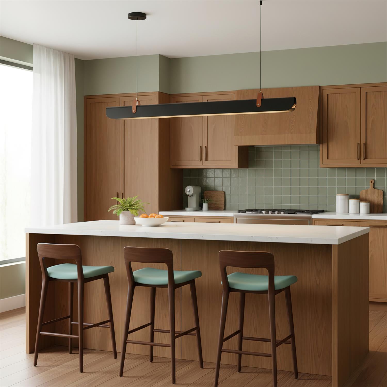 The Bandolier Line Chandelier combines precision engineering with refined material balance. Its elongated form, wrapped in a sleek black finish and suspended by warm leather straps, evokes a sense of modern restraint and craftsmanship. The seamless linear light casts an even, ambient glow—perfect for dining tables, workspaces, or minimalist interiors where subtle details define sophistication.