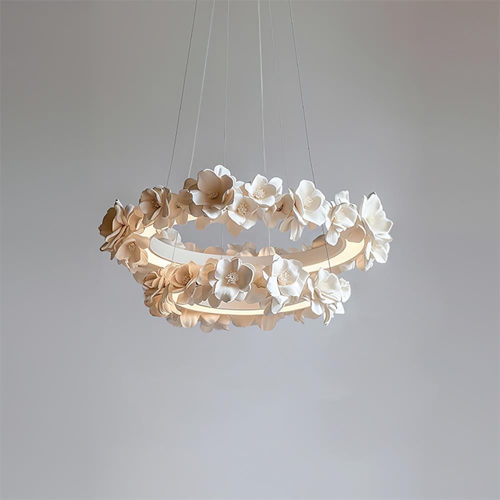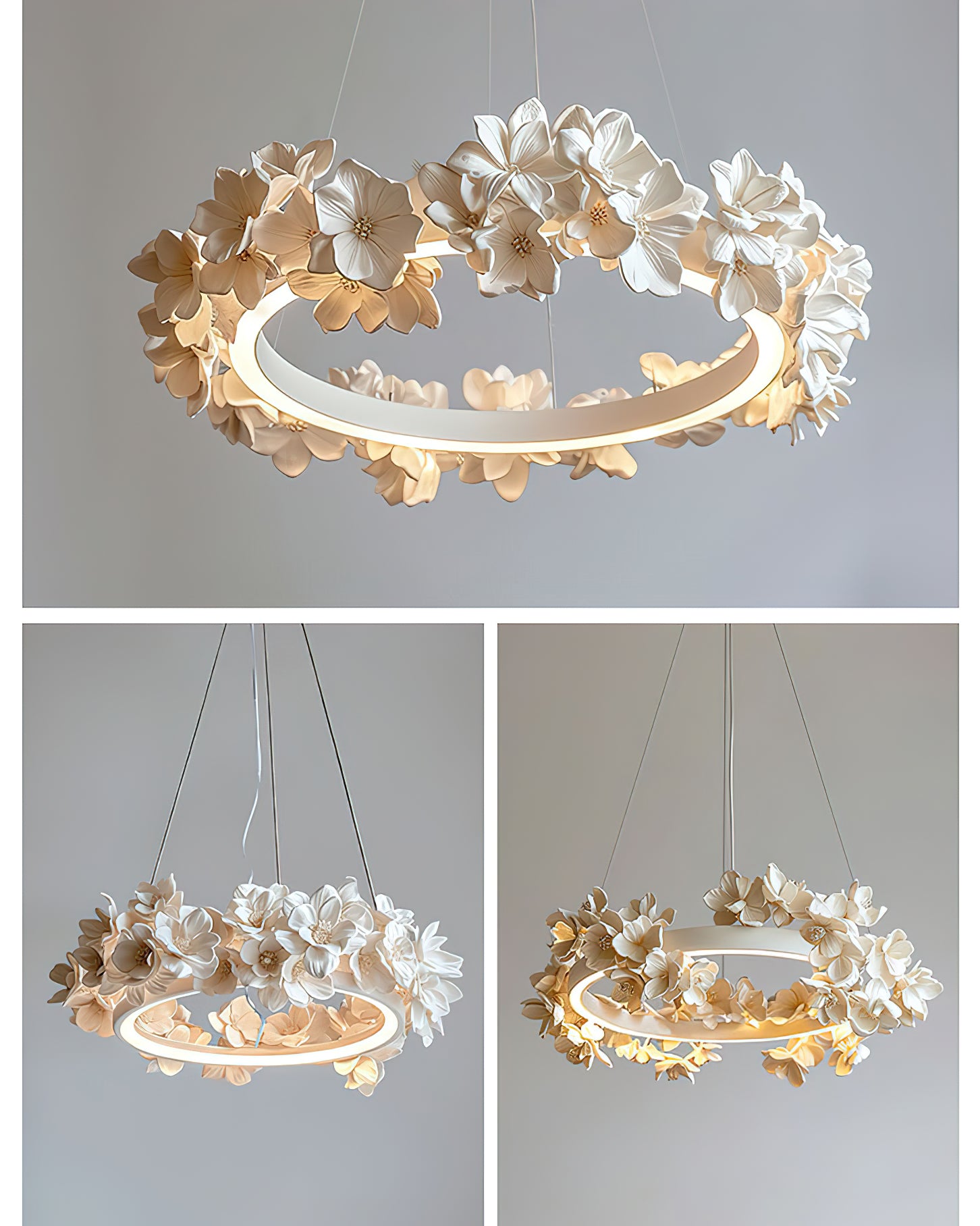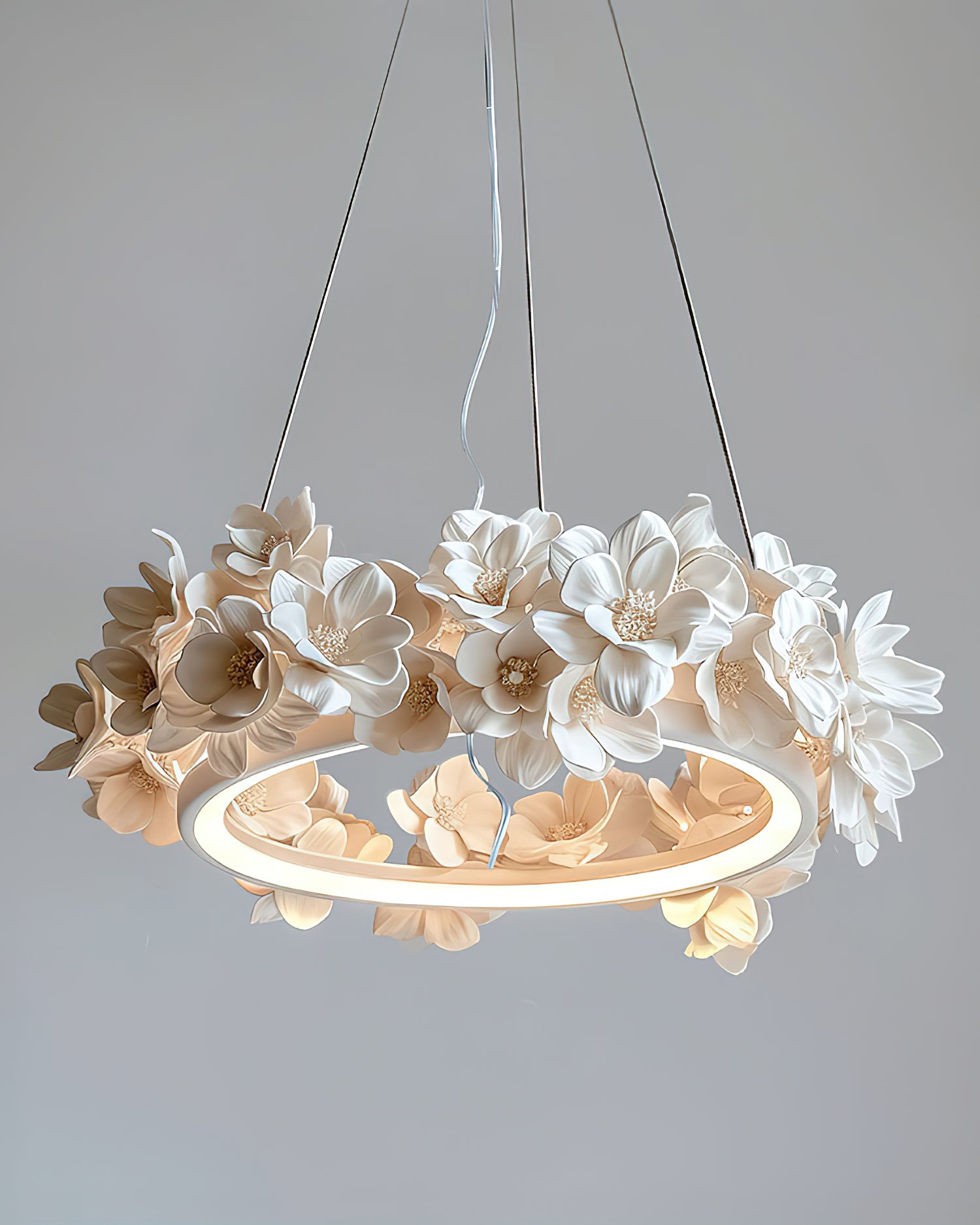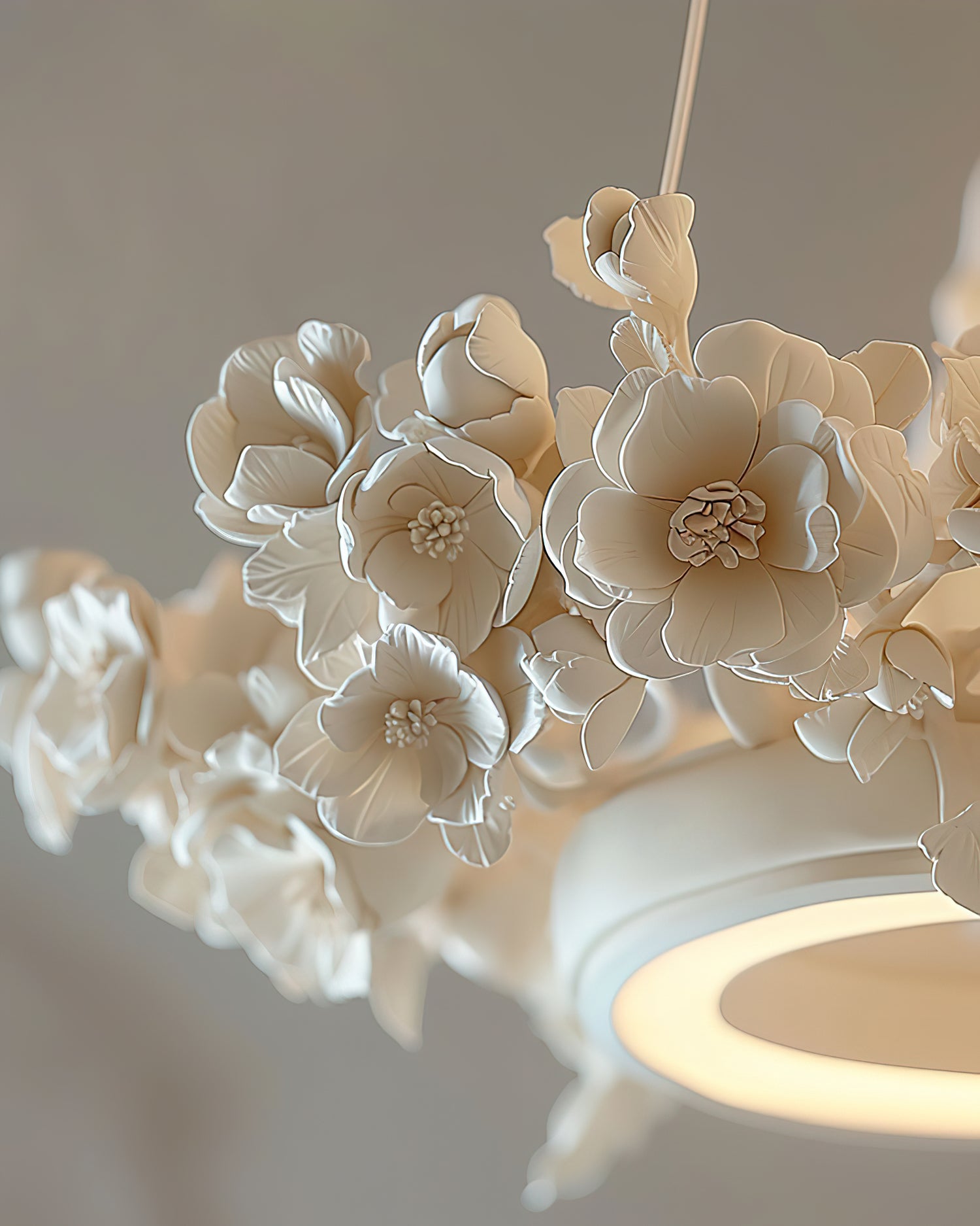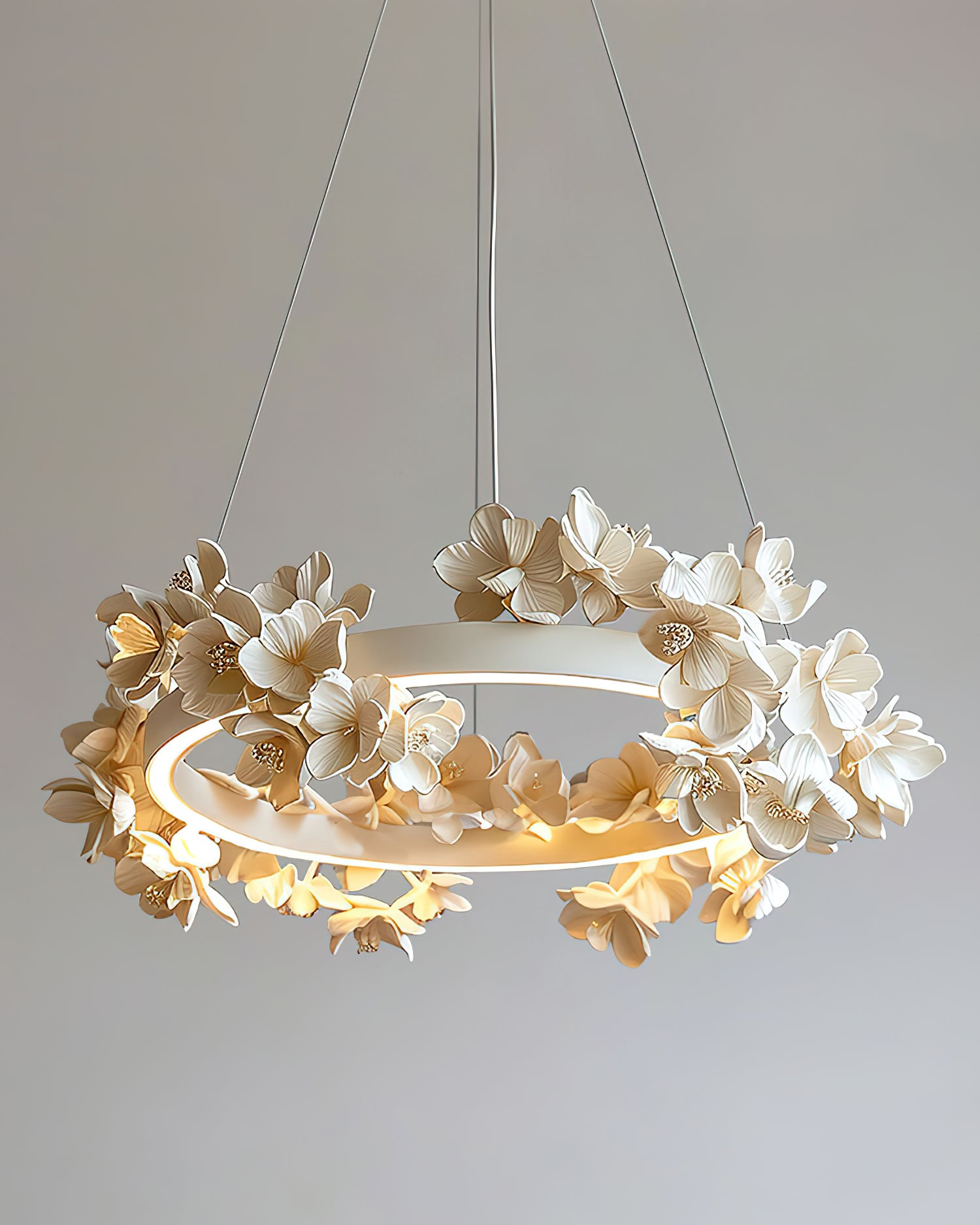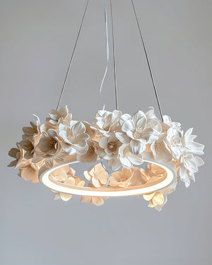 The Elysian Floral Chandelier is an exquisite fusion of nature's beauty and modern lighting design. Adorned with meticulously crafted petals, this piece transforms any space into a blooming garden of light. The soft white flowers delicately surround a glowing circular halo, creating an ethereal ambiance that brings both warmth and elegance to your room.Suspended gracefully from slender wires, the chandelier embodies a sense of lightness and grace, with each flower thoughtfully positioned to complement the others.