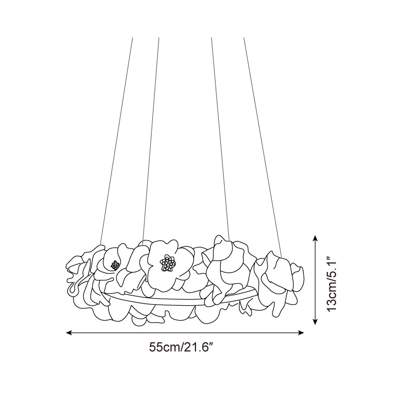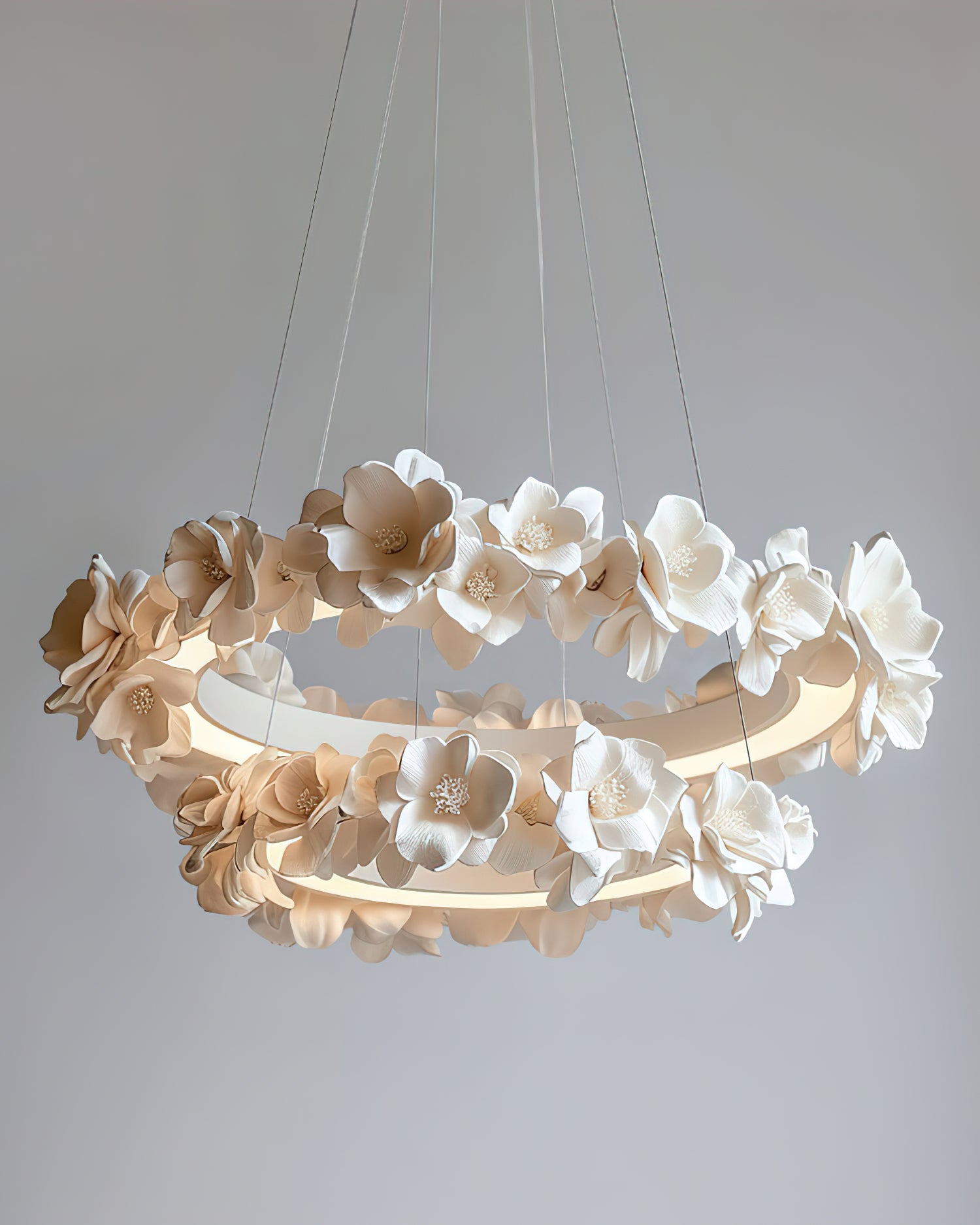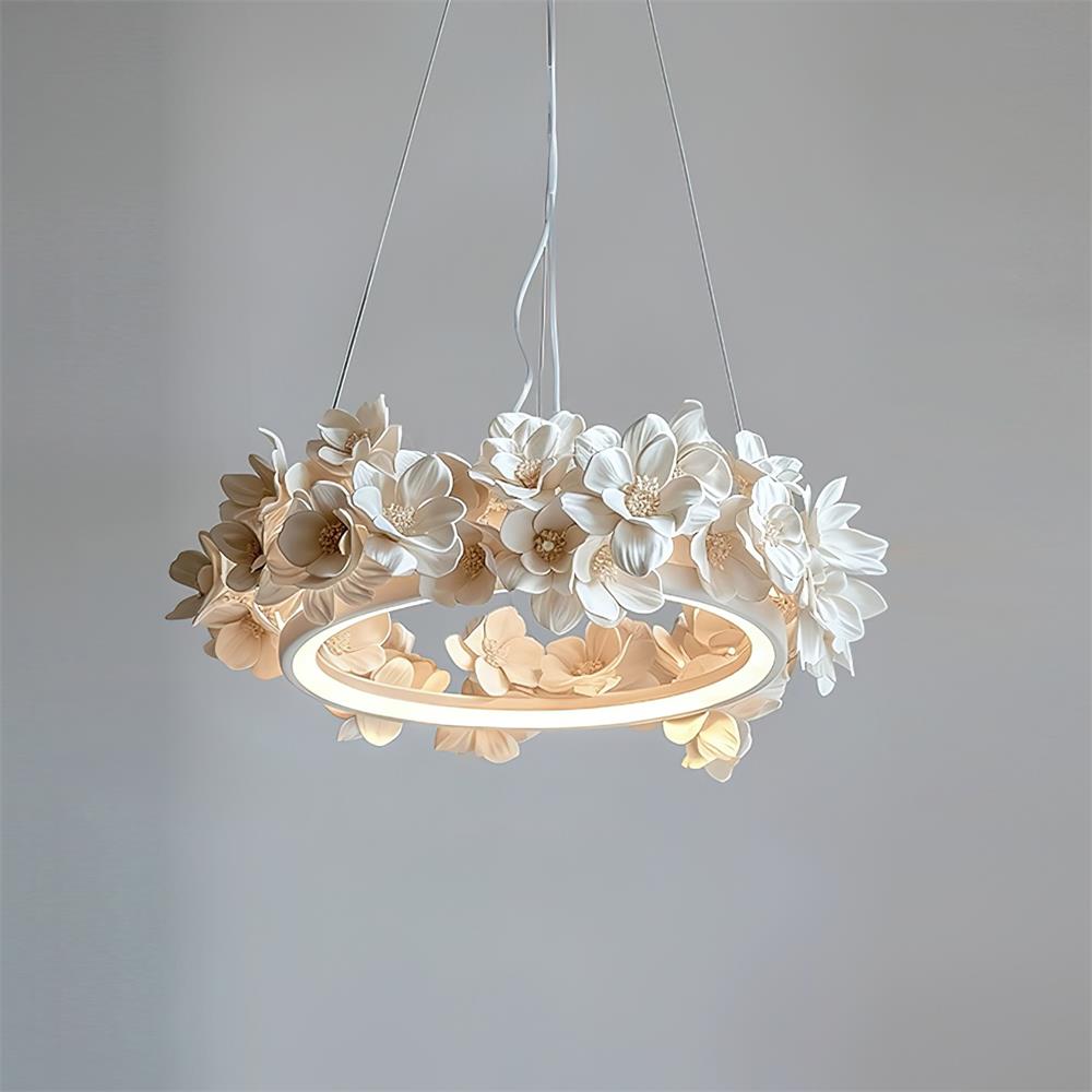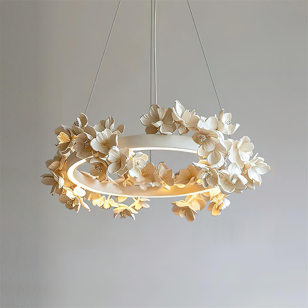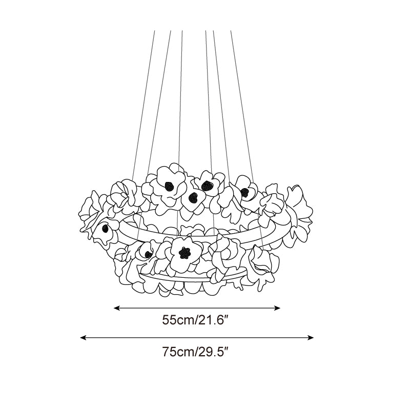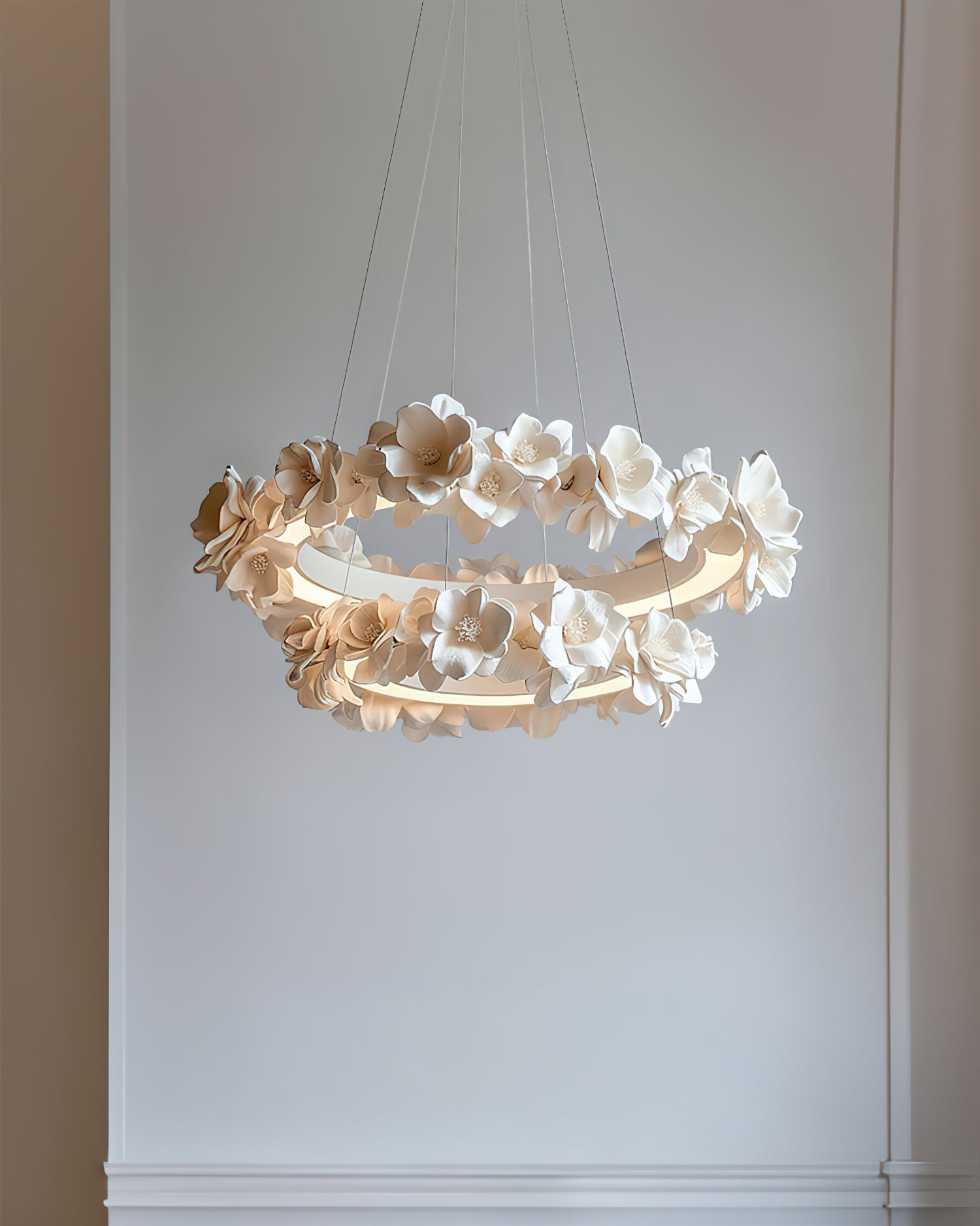 The Elysian Floral Chandelier is an exquisite fusion of nature's beauty and modern lighting design. Adorned with meticulously crafted petals, this piece transforms any space into a blooming garden of light. The soft white flowers delicately surround a glowing circular halo, creating an ethereal ambiance that brings both warmth and elegance to your room.Suspended gracefully from slender wires, the chandelier embodies a sense of lightness and grace, with each flower thoughtfully positioned to complement the others.