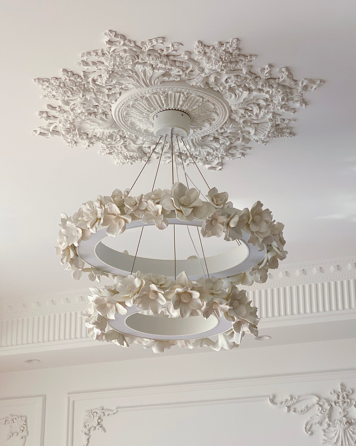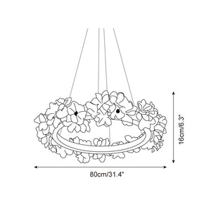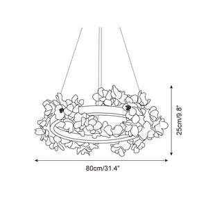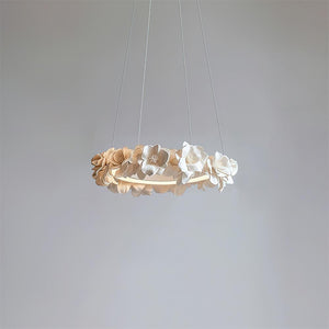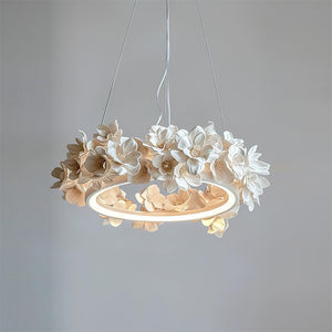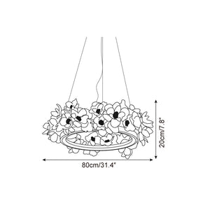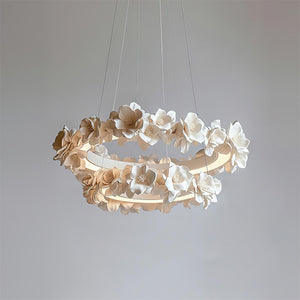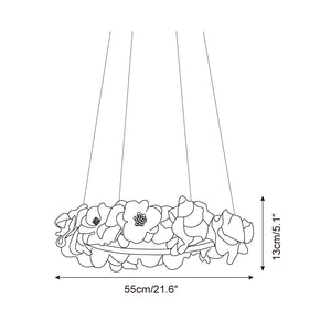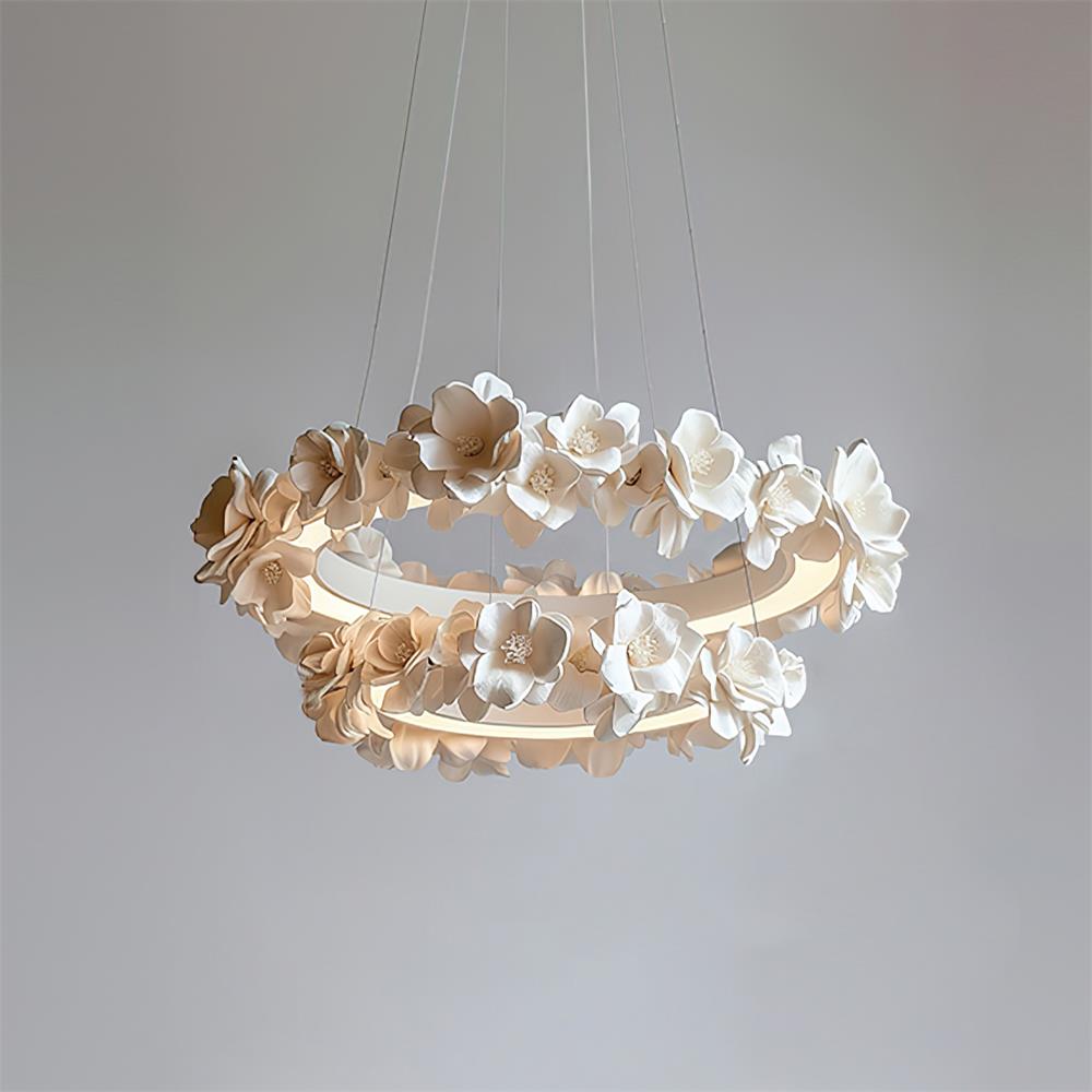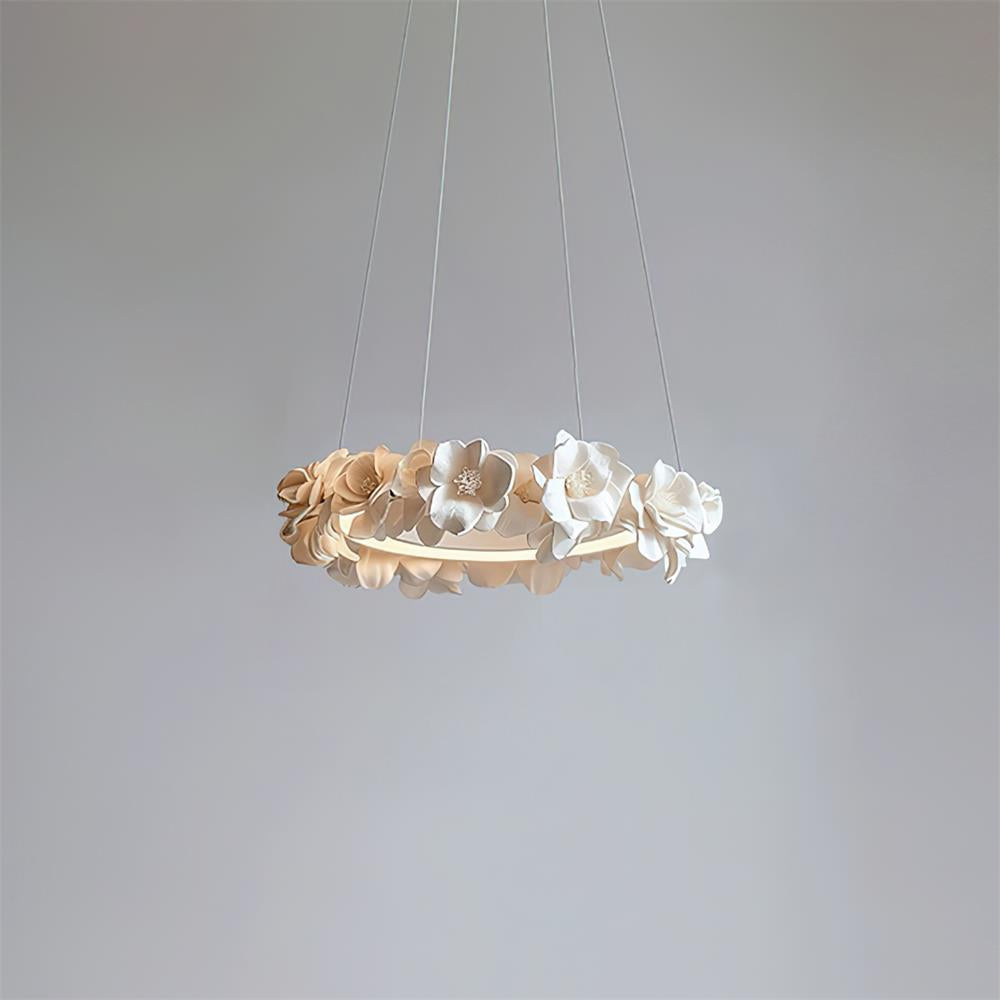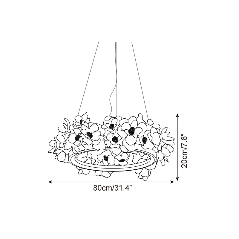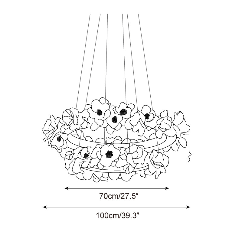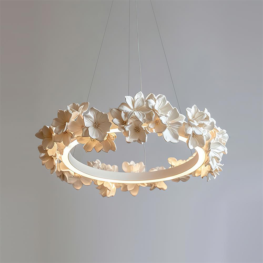 The Elysian Floral Chandelier is an exquisite fusion of nature's beauty and modern lighting design. Adorned with meticulously crafted petals, this piece transforms any space into a blooming garden of light. The soft white flowers delicately surround a glowing circular halo, creating an ethereal ambiance that brings both warmth and elegance to your room.Suspended gracefully from slender wires, the chandelier embodies a sense of lightness and grace, with each flower thoughtfully positioned to complement the others.