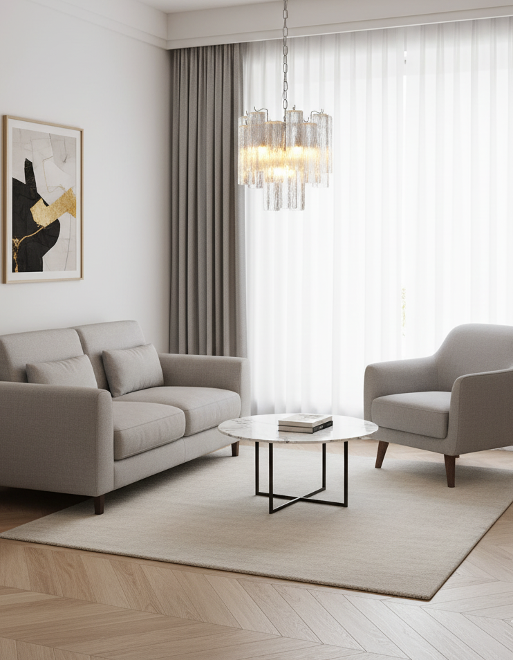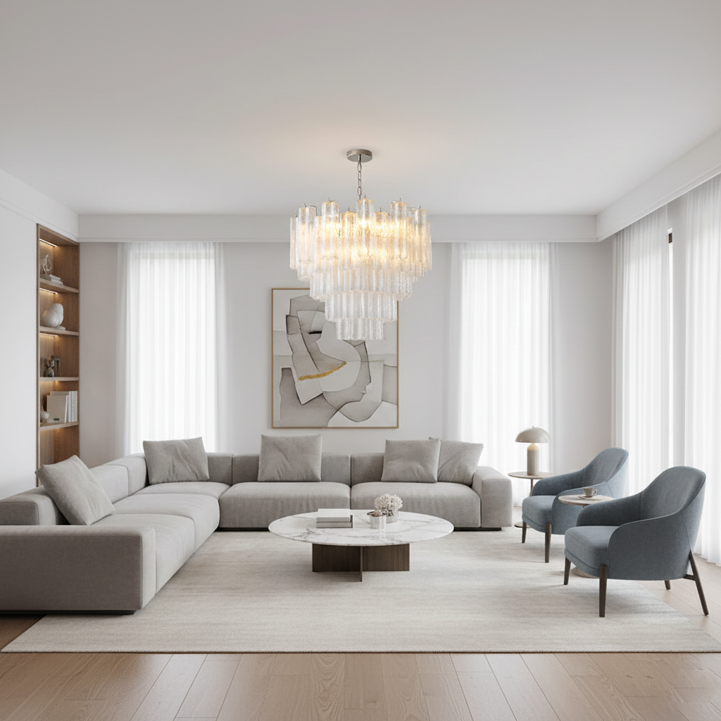 A symphony of structure and softness, the Kamenicky Chandelier redefines grandeur with cascading tiers of textured glass. Each hand-pulled tube captures and scatters light in ripples, creating a radiant centerpiece that feels both architectural and ethereal. Available in clear and blush-pink hues, it brings a luminous statement to grand dining rooms, luxury stairwells, or hotel lobbies.
