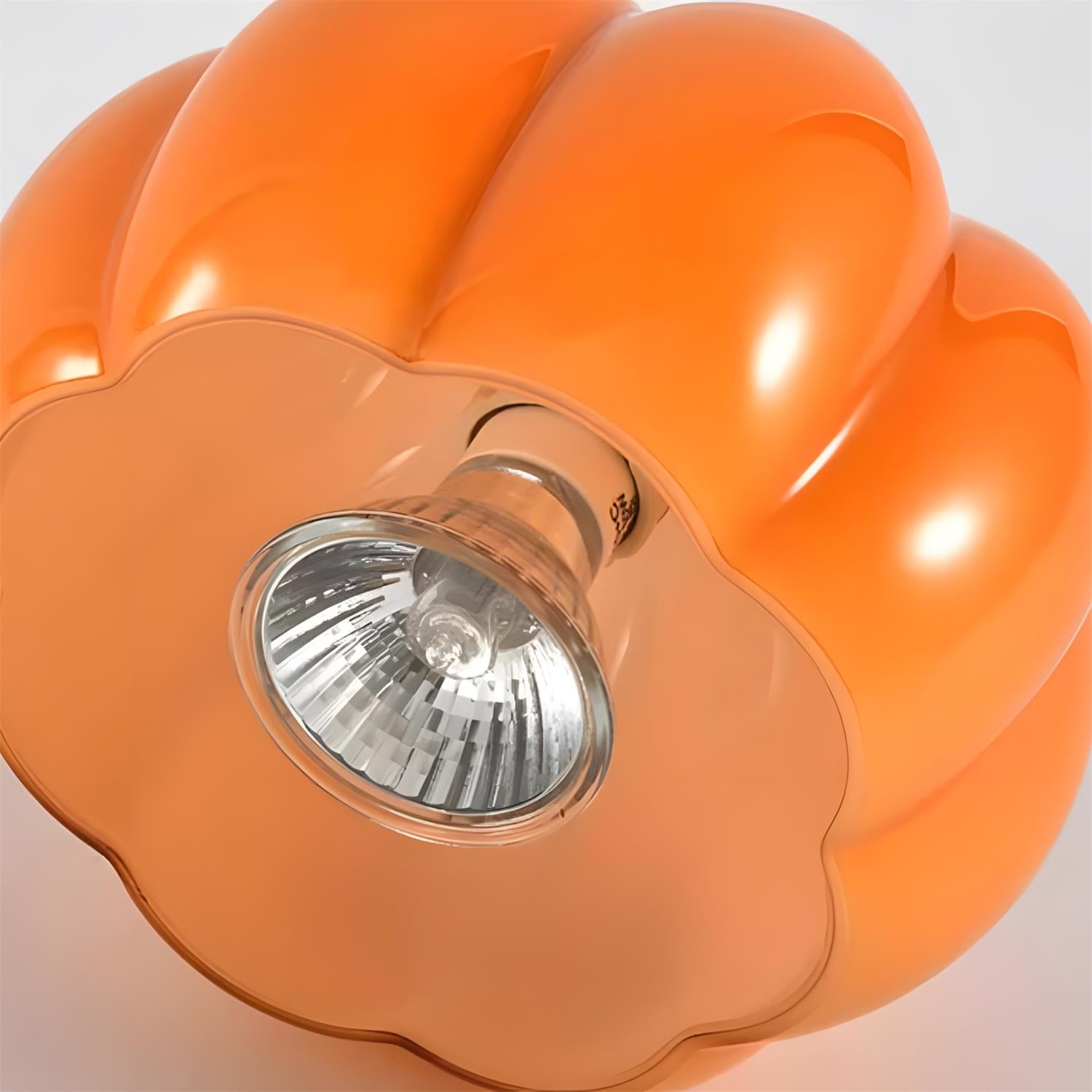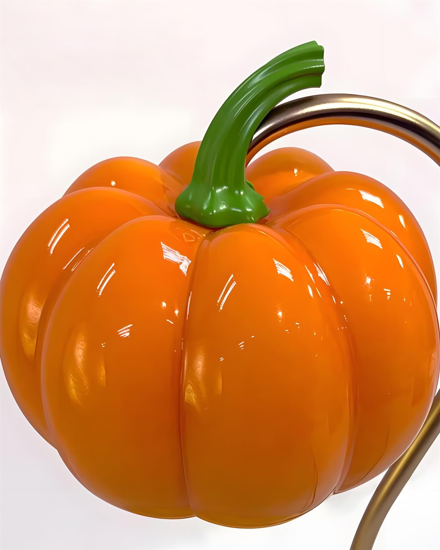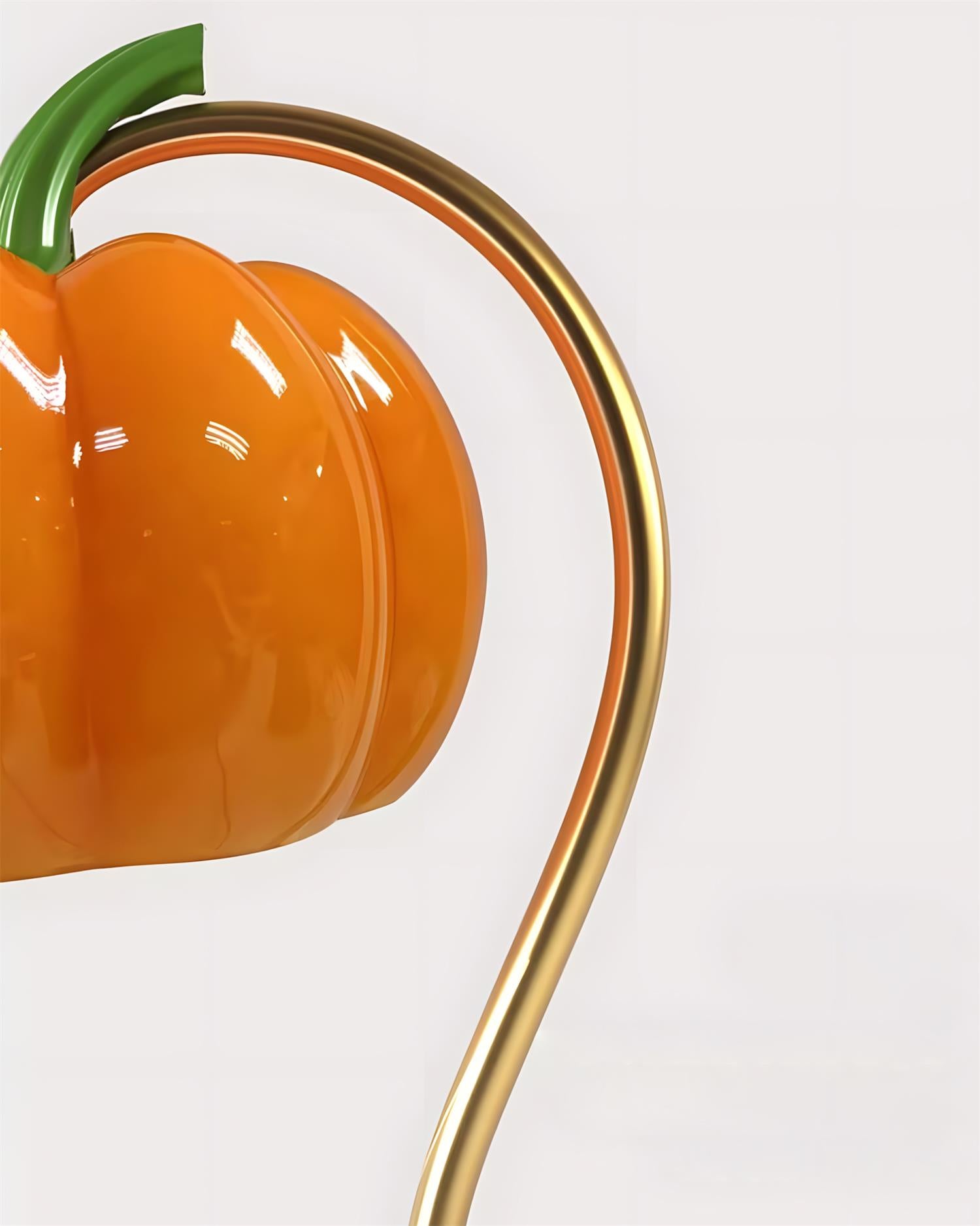 The Cidera Candle Warmer Lamp brings playful seasonal charm to everyday décor through its whimsical pumpkin-inspired shade, turning a functional home accessory into a warm and sculptural accent piece. Its glossy orange top, finished with a vivid green stem detail, is suspended from a softly curved brass-toned arm that adds elegance and balance, while the natural wood base grounds the design with a cozy, organic touch.