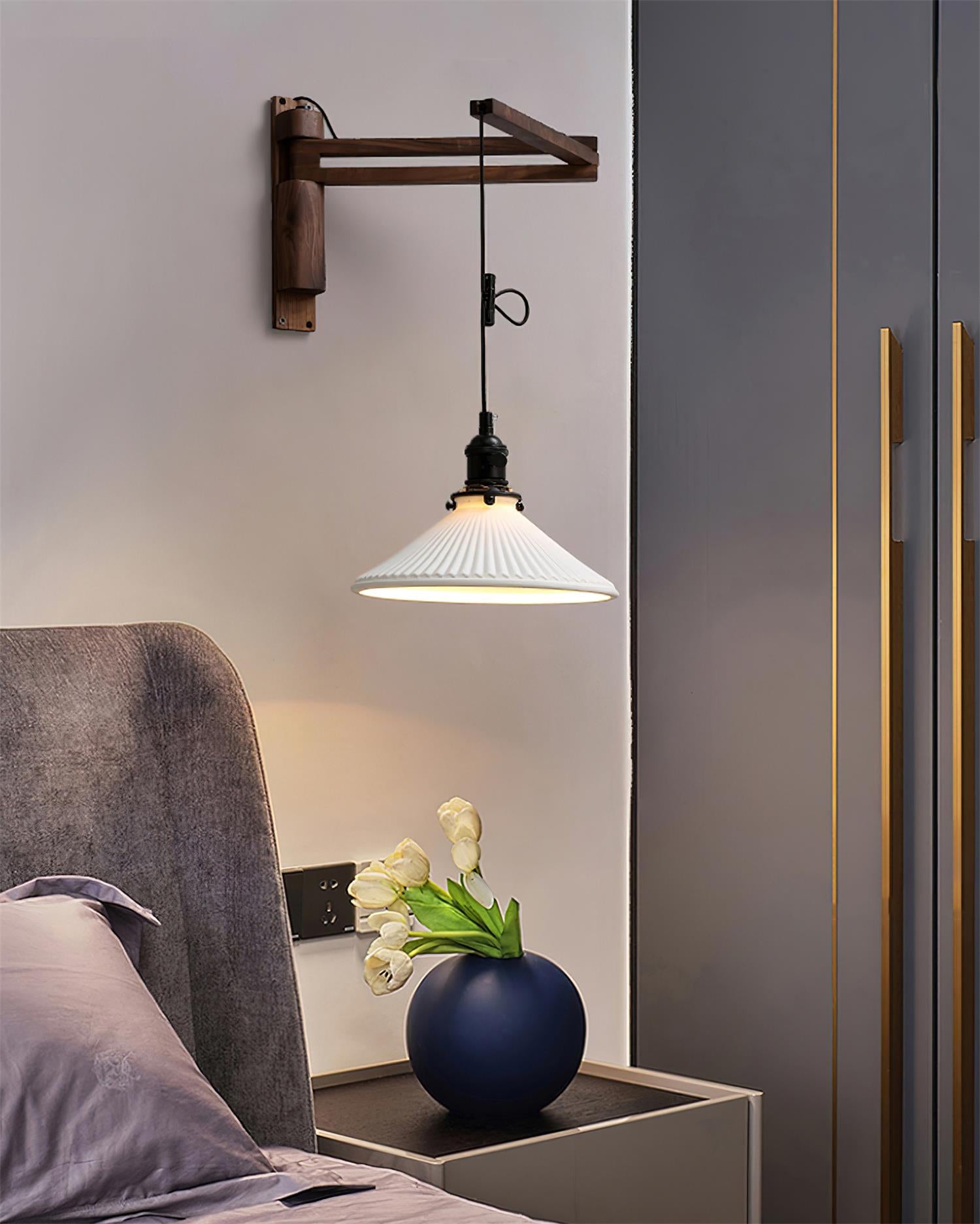 The Boreal Wall Lamp blends functionality with understated charm, featuring a clean mint enamel shade suspended from a natural wood swing arm structure. Its adjustable design allows for versatile positioning, making it perfect for reading nooks, bedside lighting, or adding a soft glow to dining corners. The mix of wood tones with the glossy pastel finish creates a warm yet refreshing aesthetic.